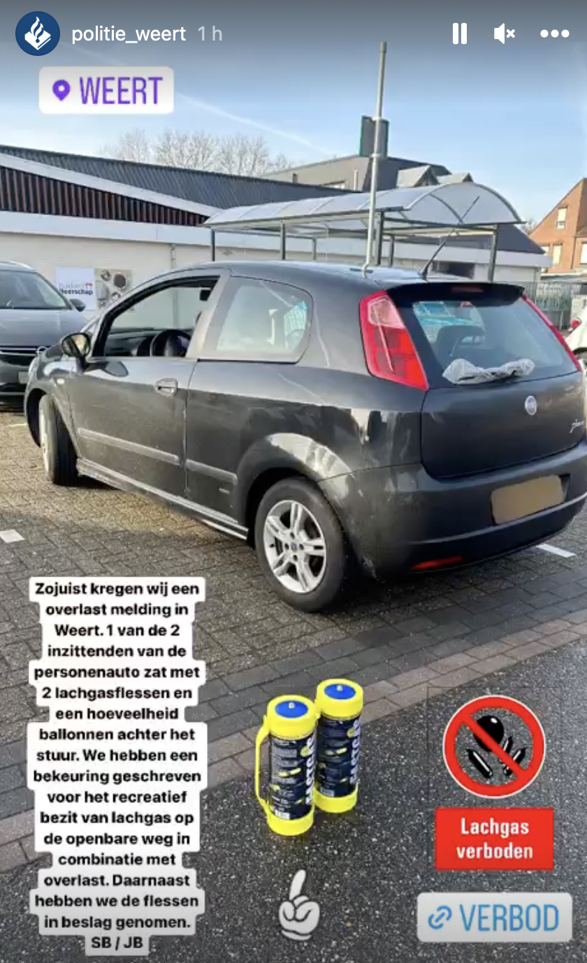 Een van de twee inzittende personen zat met 2 lachgasflessen en een hoeveelheid ballonnen achter het stuur. De politie heeft een bekeuring geschreven voor het recreatief bezit van lachgas op de openbare weg in combinatie met overlast. Daarnaast hebben ze de flessen in beslag genomen. Dit meld de politie via Instagram.