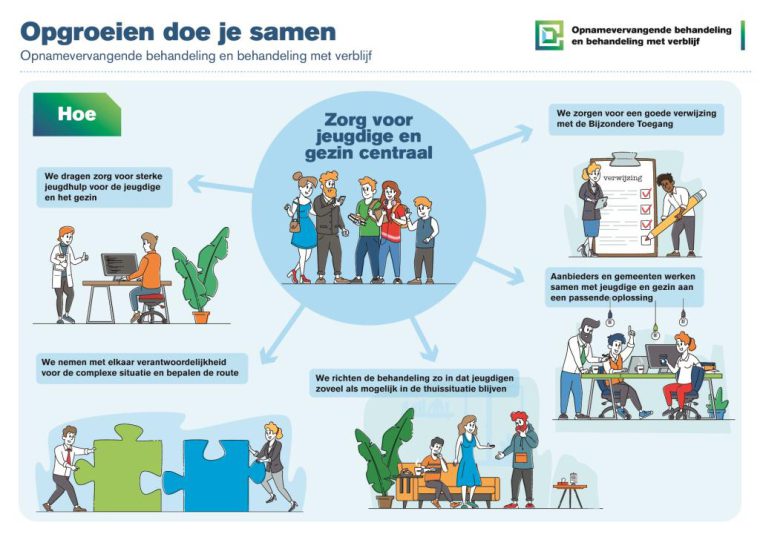 Ieder gezin is anders, dus voor ieder gezin kijken de hulpaanbieders naar de beste oplossing voor dat gezin. Daarvoor zetten ze de deuren voor elkaar open en werken ze integraal samen om die hulp te bieden die de jeugdige en het gezin nodig heeft. Via een gezamenlijke voordeur, ook wel de Bijzondere Toegang genoemd, bepalen ze samen met de jeugdige en het gezin de route. Na een uitgebreid gesprek maken de samenwerkende jeugdhulpaanbieders een plan van aanpak. De grenzen van de aanbieders vervagen en de beste behandeling kan heel goed een combinatie zijn van methodieken van verschillende aanbieders. Deze intensieve vorm van samenwerking tussen gemeenten en jeugdhulpaanbieders is uniek in Nederland.