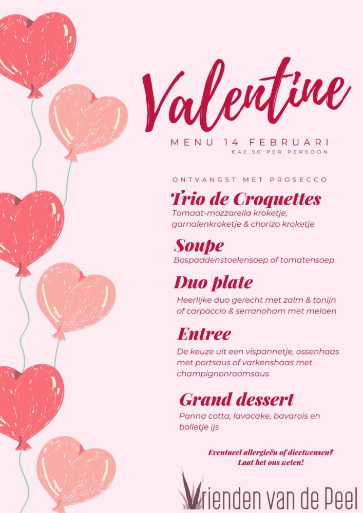 Het keukenteam heeft met heel veel liefde een leuk menu samengesteld voor Valentijn. Komen jullie samen de liefde vieren? Reserven kan via 0495-631619 of stuur een berichtje via de Socials. En gezellig met je beste vriend(in) komen eten mag natuurlijk ook, want een goede vriendschap vieren is natuurlijk nét zo belangrijk.