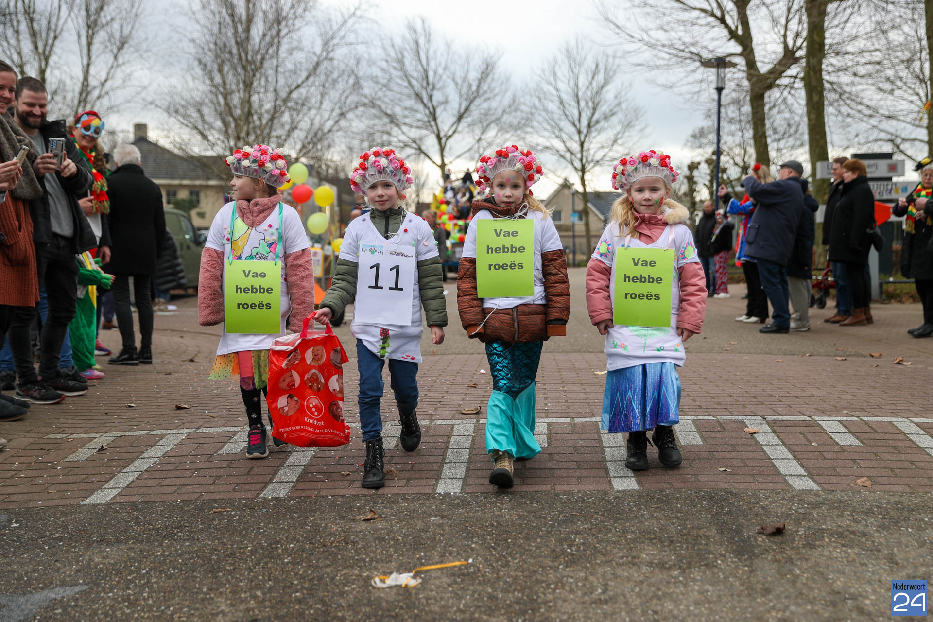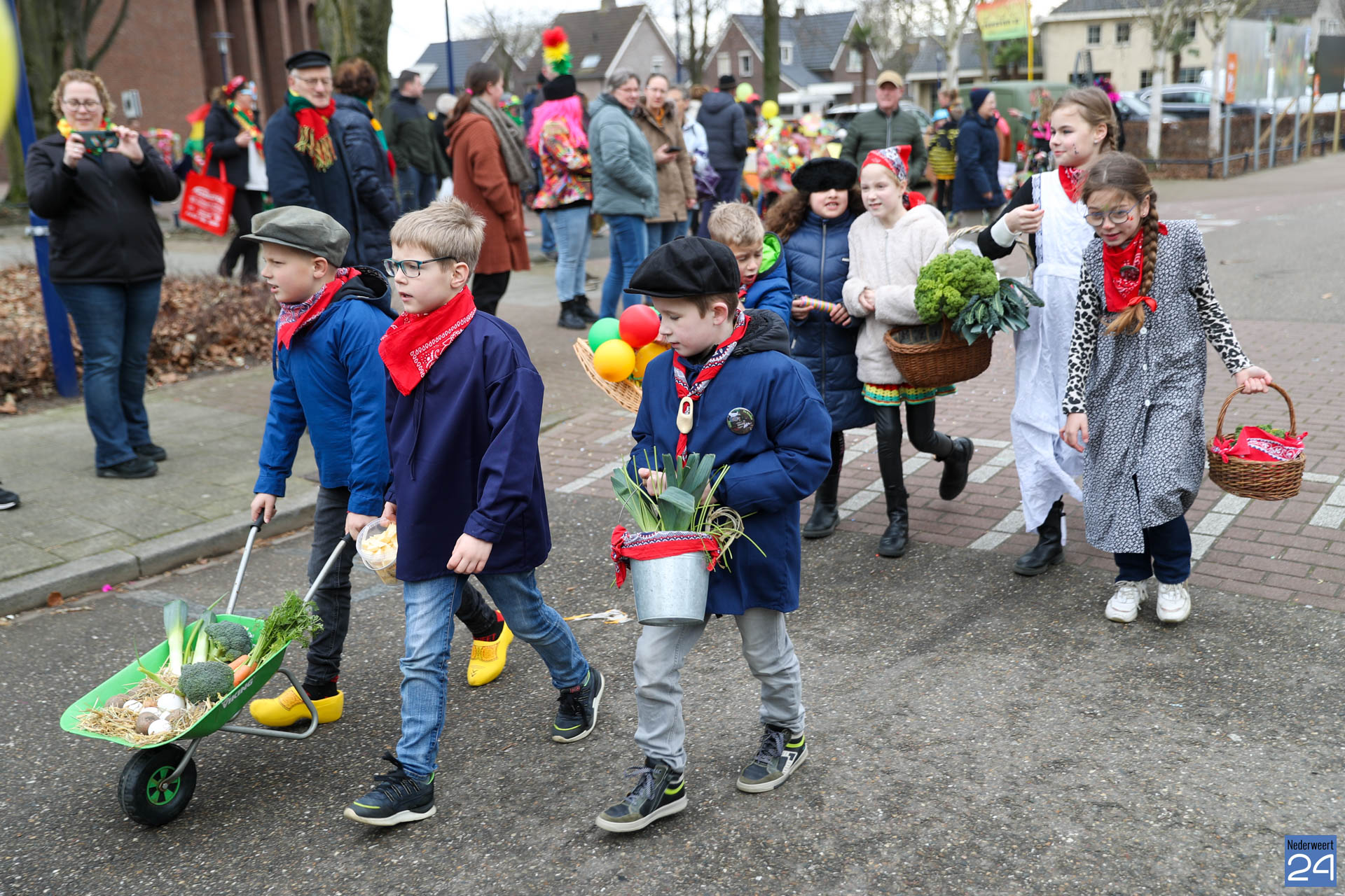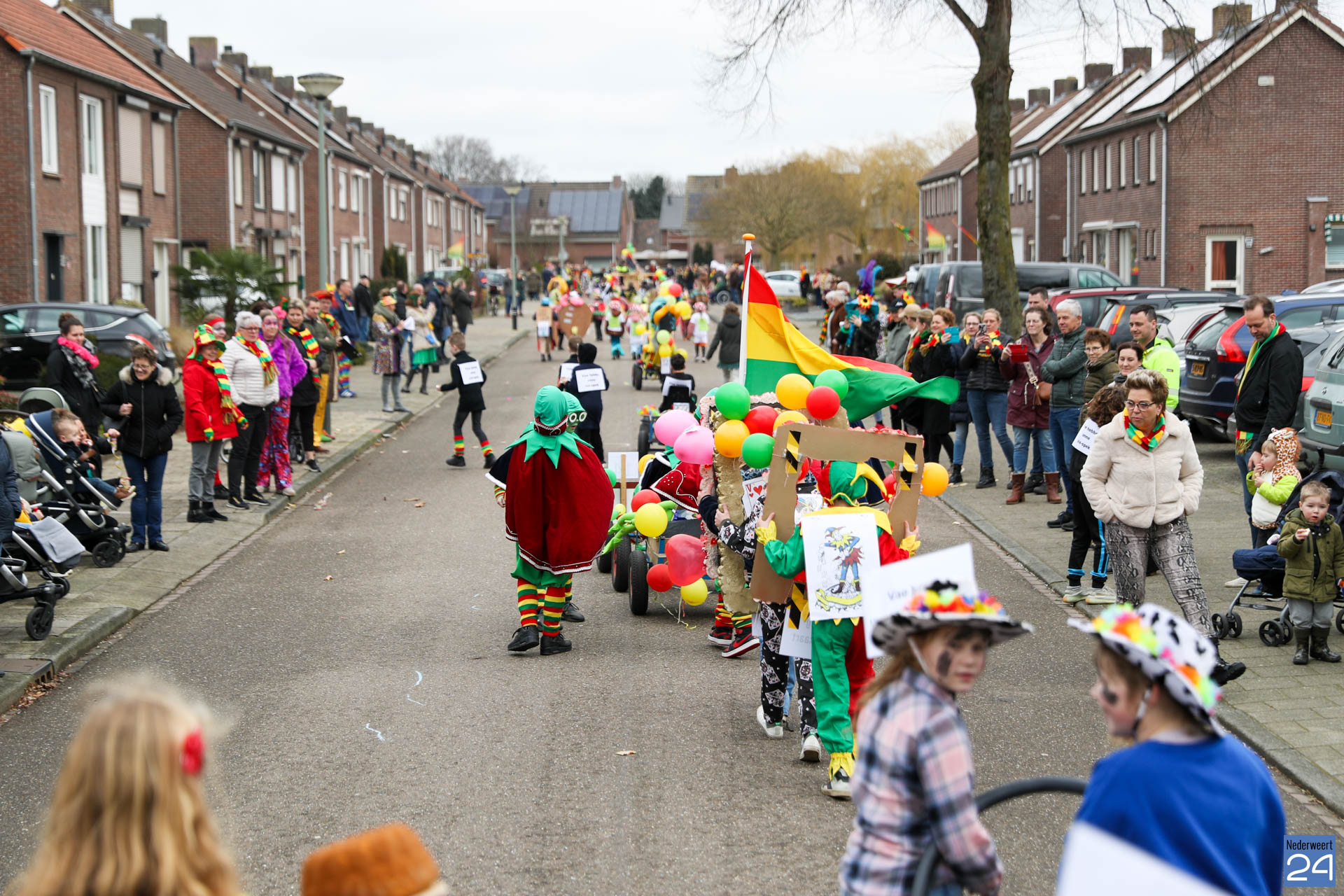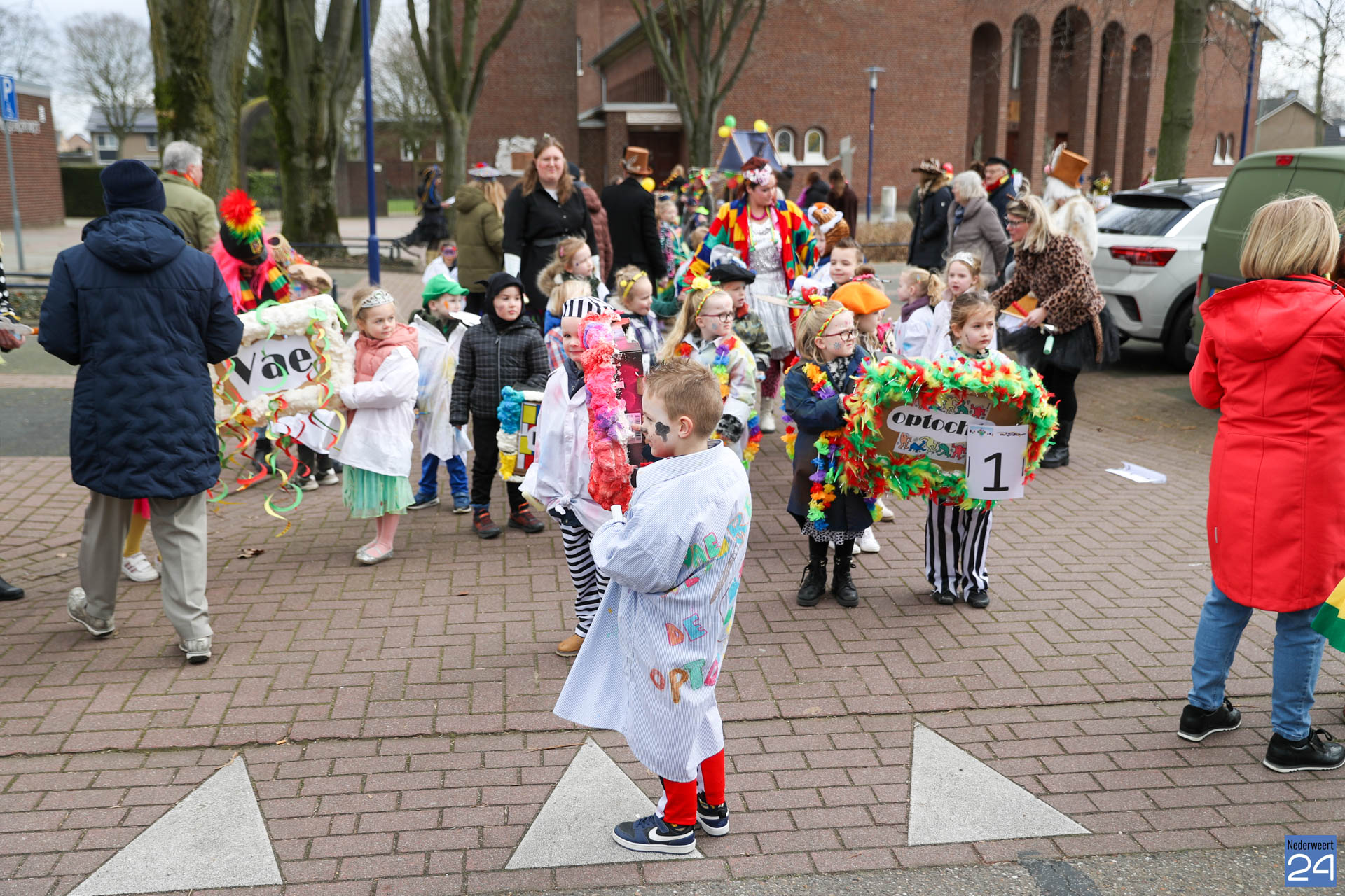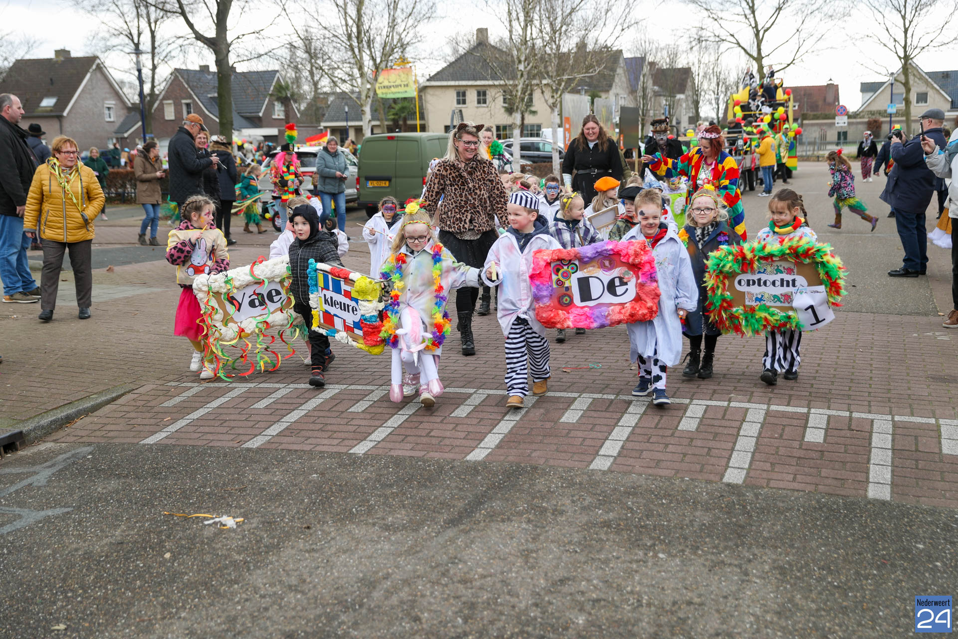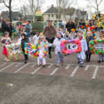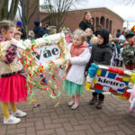 Even na 11:00 uur vertrok de stoet vanaf het Pastoor Maesplein. Een vrolijke, kleurrijke kinderstoet liep vol gezelligheid door de straten van Nederweert-Eind. Zowel de kinderen van basisschool De Tweesprong als de leraren liepen vol enthousiasme mee met de optocht. Na de optocht volgde een hosmiddag op school.