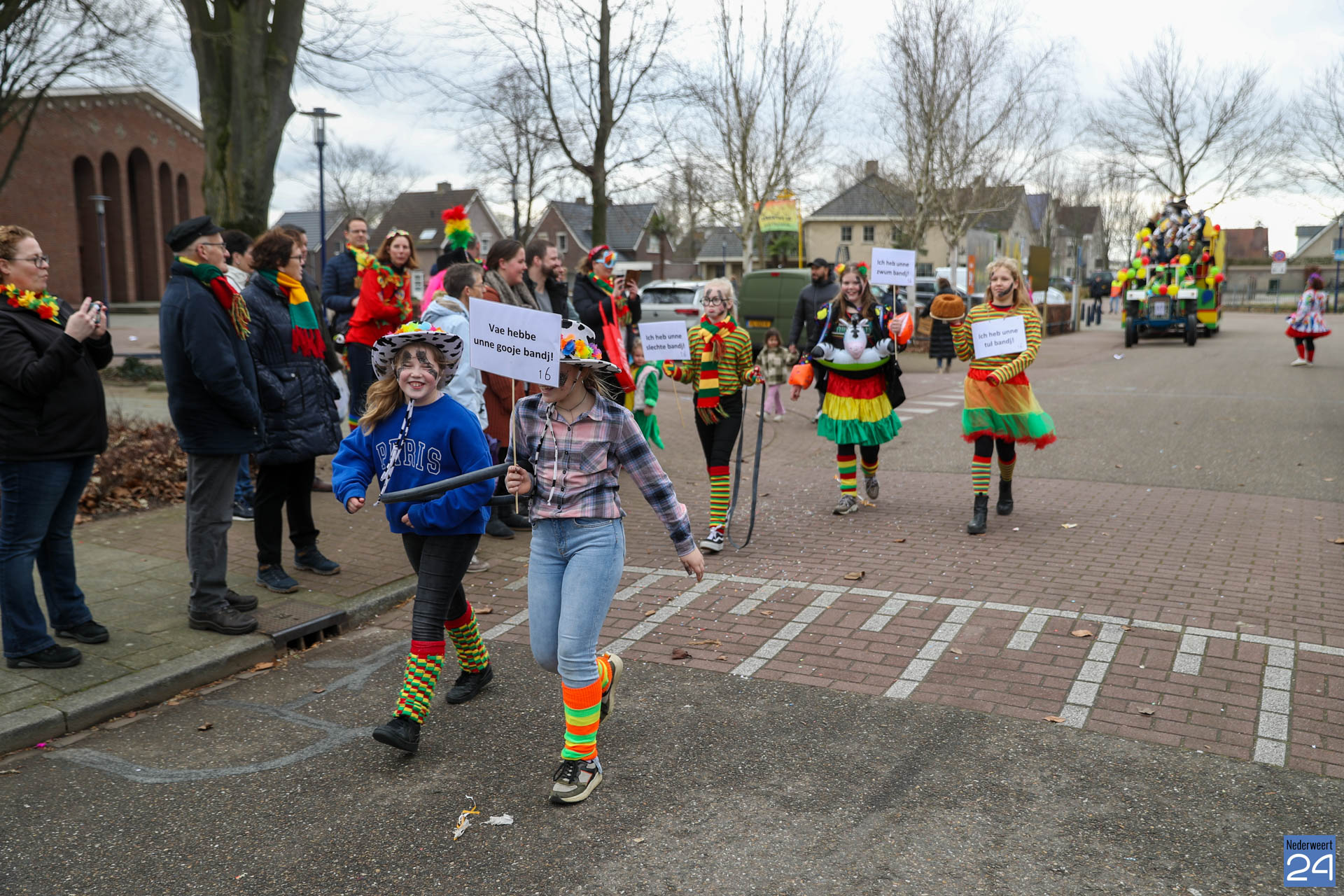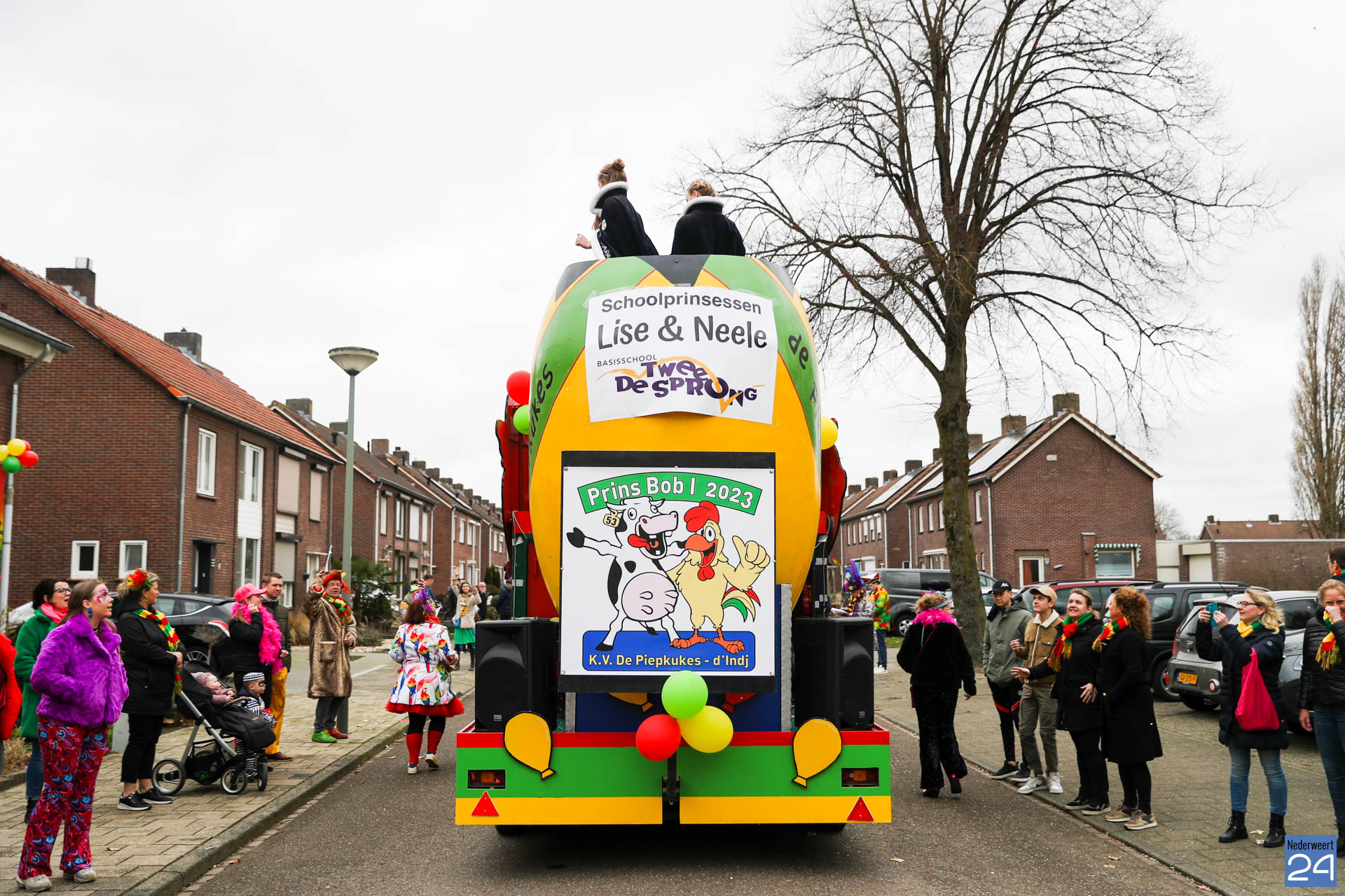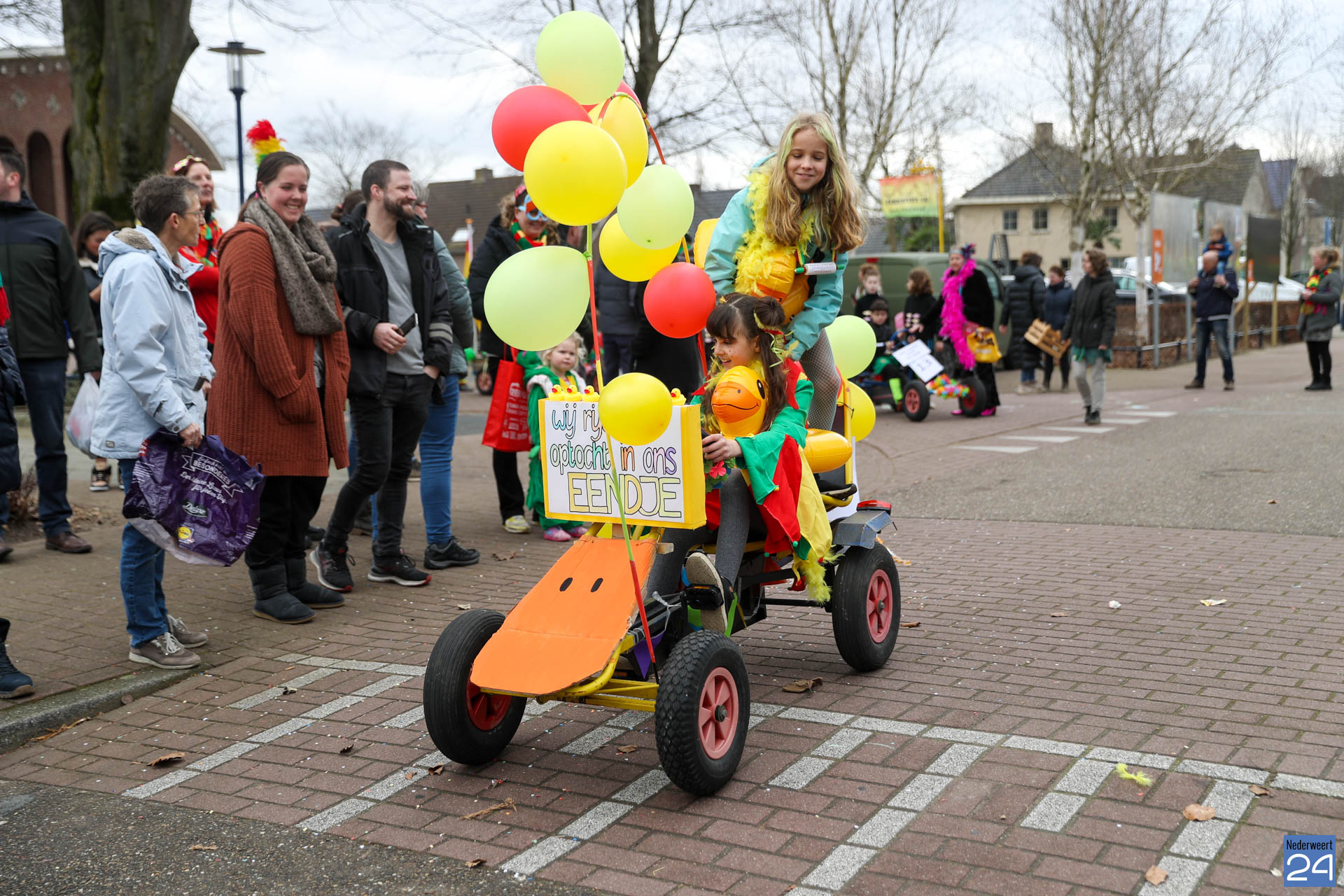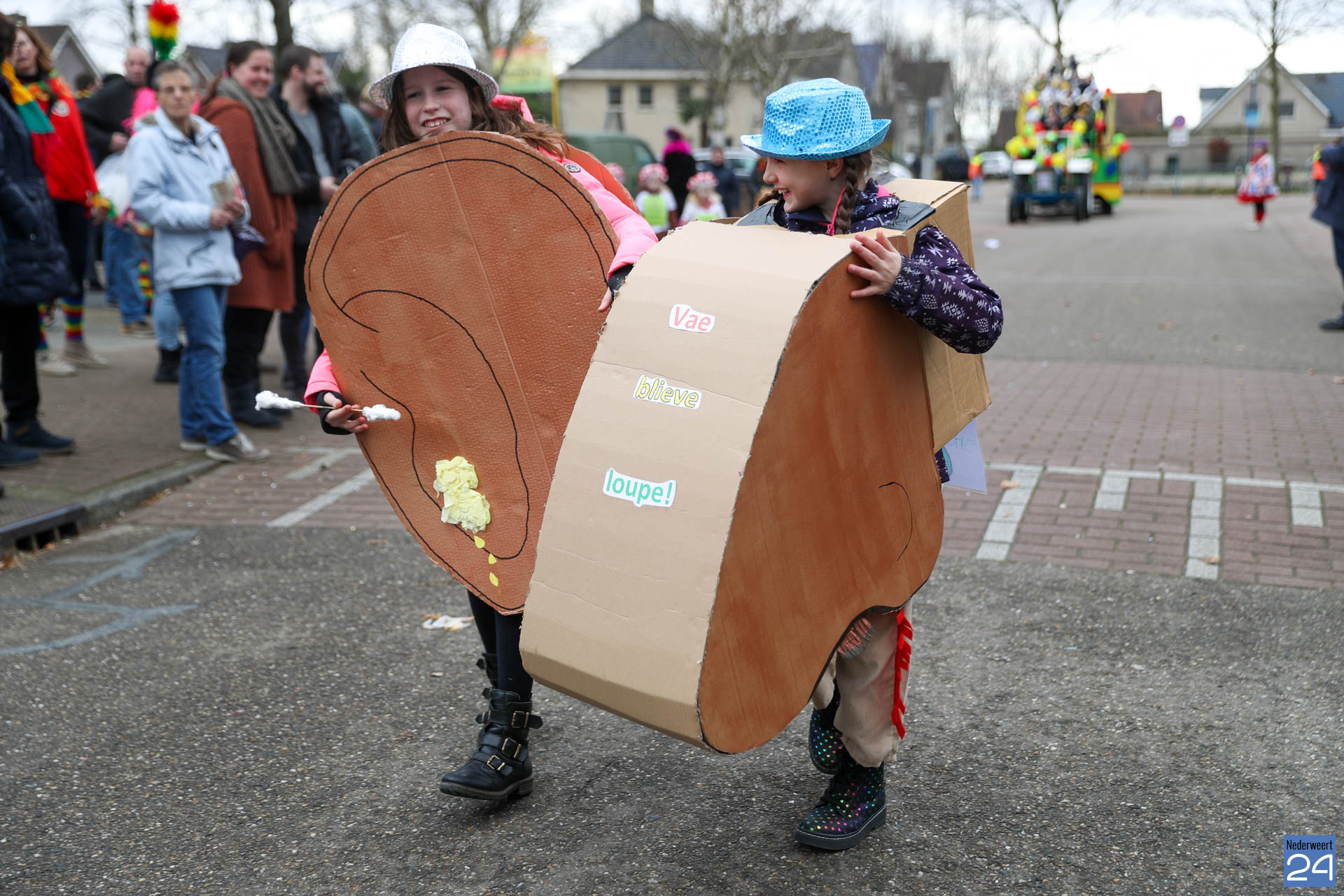 Even na 11:00 uur vertrok de stoet vanaf het Pastoor Maesplein. Een vrolijke, kleurrijke kinderstoet liep vol gezelligheid door de straten van Nederweert-Eind. Zowel de kinderen van basisschool De Tweesprong als de leraren liepen vol enthousiasme mee met de optocht. Na de optocht volgde een hosmiddag op school.