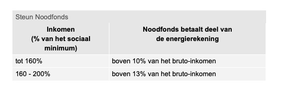 Het Noodfonds betaalt het deel van de maandelijkse energierekening dat meer is dan 10 tot 13% van het gezamenlijk bruto-inkomen van een huishouden. De steun uit het Noodfonds is als volgt: