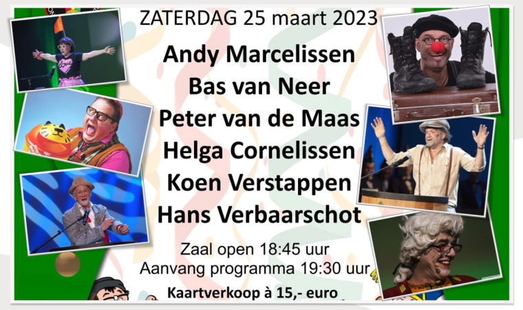 Dit jaar staan de volgende acts op het podium: Andy Marcelissen, Bas van Neer, Peter van de Maas, Helga Cornelissen, Koen Verstappen en Hans Verbaarschot.