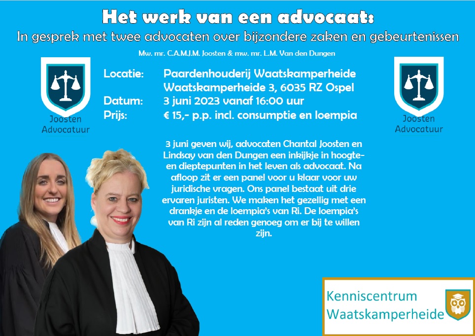 Op 3 juni 2023 organiseert Joosten advocatuur in samenwerking met Kenniscentrum Waatskamperheide een voorstelling waarin het werk van twee advocaten van Joosten Advocatuur centraal staat. Mr. Chantal Joosten en mr. Lindsay van den Dungen gaan met elkaar in gesprek over de hoogte- en dieptepunten die zij in het werk als advocaat meemaken.