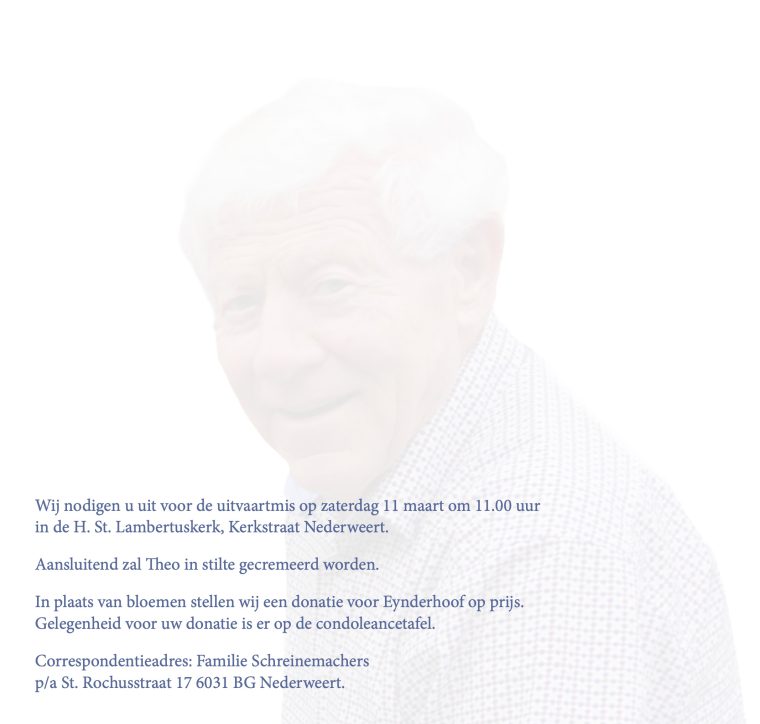 Er moest een usb-stick met een presentatie worden opgehaald in Nederweert. ‘Kom even binnen”. En dan zit je gezellig aan de koffie met Theo en Lizette. Even ging het over Eynderhoof maar al snel ging het over gemeenschappelijke kennissen uit de vorige eeuw. Ik heb genoten toen hij eind februari zijn enthousiasme overdroeg aan de vele vrijwilligers verzameld in Ospel. Een man uit duizenden. Gecondoleerd met zijn verlies.