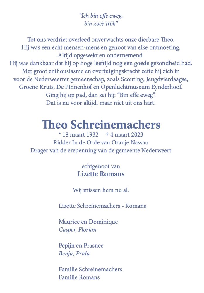 Mevrouw Schreinemachers, kinderen en kleinkinderen, gecondoleerd met het overlijden van Theo.