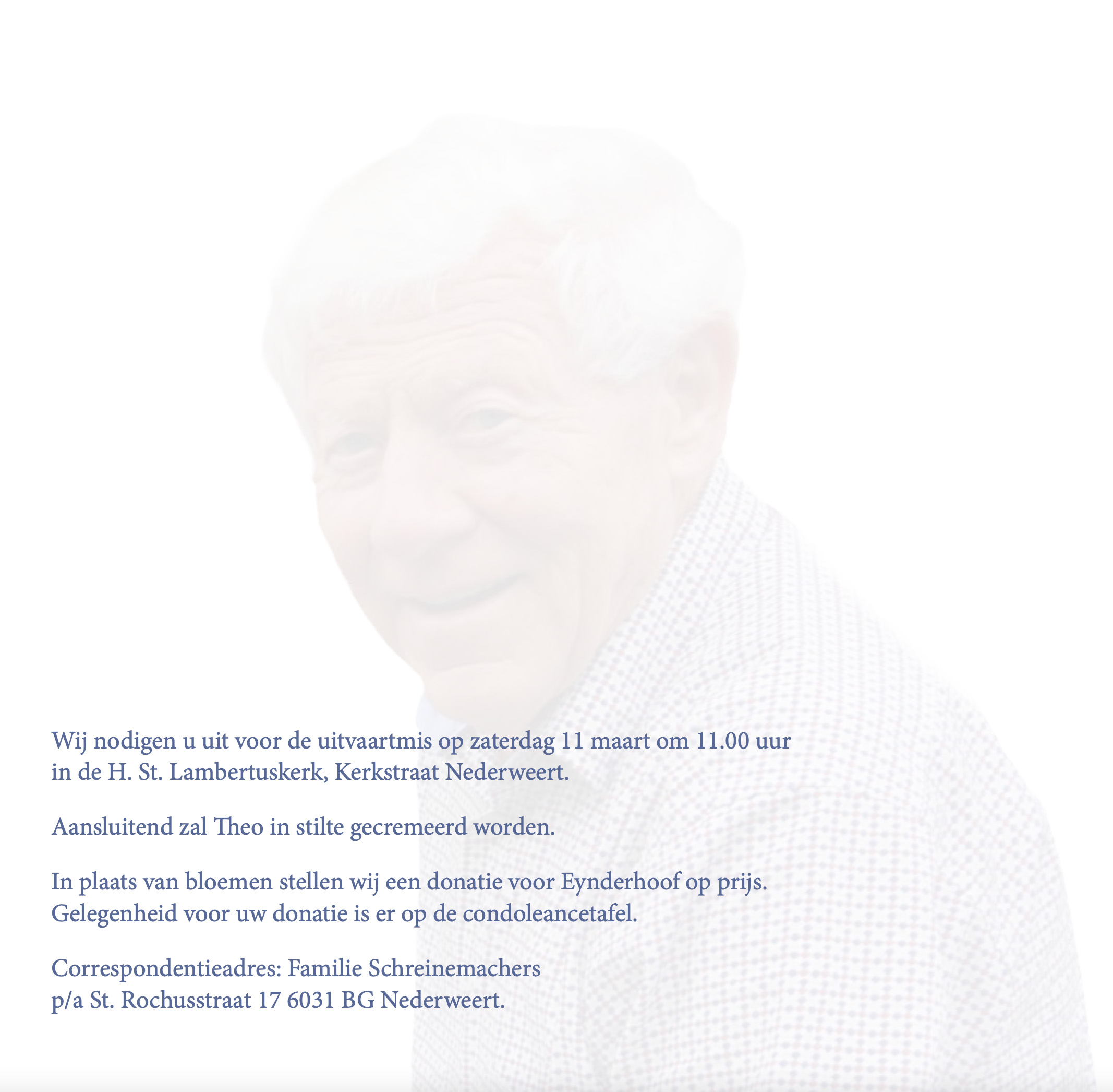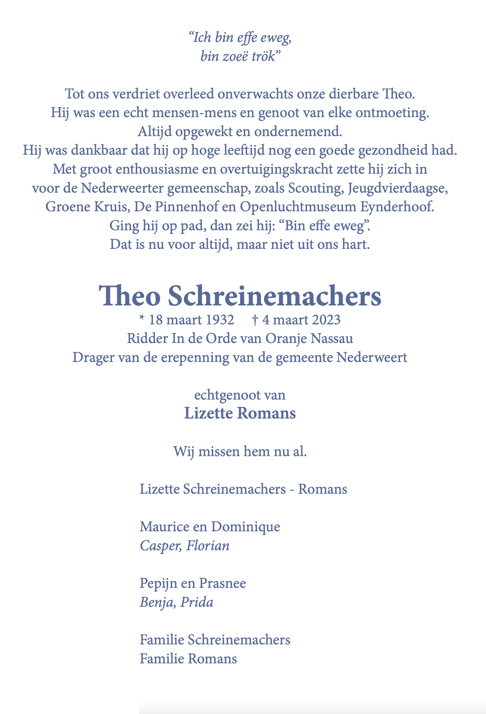 Er moest een usb-stick met een presentatie worden opgehaald in Nederweert. ‘Kom even binnen”. En dan zit je gezellig aan de koffie met Theo en Lizette. Even ging het over Eynderhoof maar al snel ging het over gemeenschappelijke kennissen uit de vorige eeuw. Ik heb genoten toen hij eind februari zijn enthousiasme overdroeg aan de vele vrijwilligers verzameld in Ospel. Een man uit duizenden. Gecondoleerd met zijn verlies.