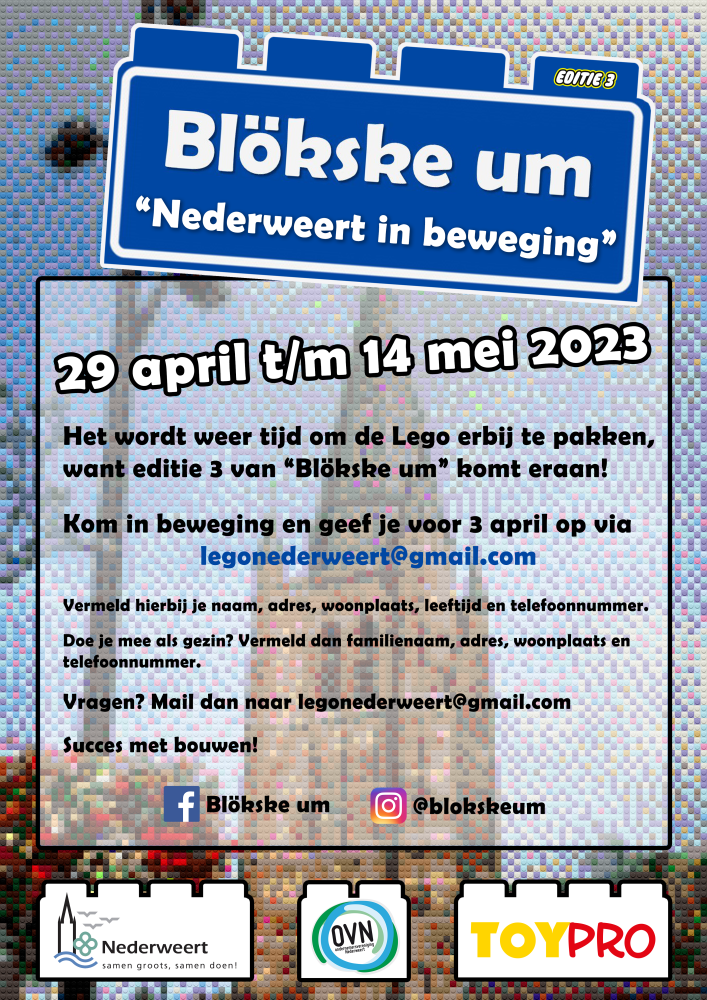 Dit jaar wordt alweer de derde editie van Blökske um georganiseerd, met als thema “Nederweert in beweging”. De eerste aanmeldingen van bouwers en winkeliers zijn binnen, maar om editie 3 daadwerkelijk door te laten gaan zijn er nog meer bouwers (individueel of gezinnen) nodig.
