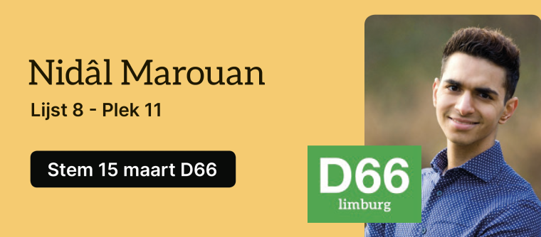 Deze week zijn de verkiezingen voor Provinciale Staten. De 23-jarige Nidâl Marouan staat op plek 11 voor de lijst van D66 Limburg en is daarmee de hoogste Nederweertenaar op de lijst. Nidâl is momenteel werkzaam bij Sogeti, maar is bij u misschien meer bekend van zijn werk als floormanager bij Jan Linders en afdelingsmanager bij Jumbo Roel Heerschap in Nederweert. In zijn vrije tijd slaat hij graag een balletje bij NTC’72. Naast zijn bijdrage in de steunfractie van D66 Nederweert zet hij zich sinds december in als bestuurslid algemeen in het provinciale bestuur van de Jonge Democraten, de jongerentak van D66.