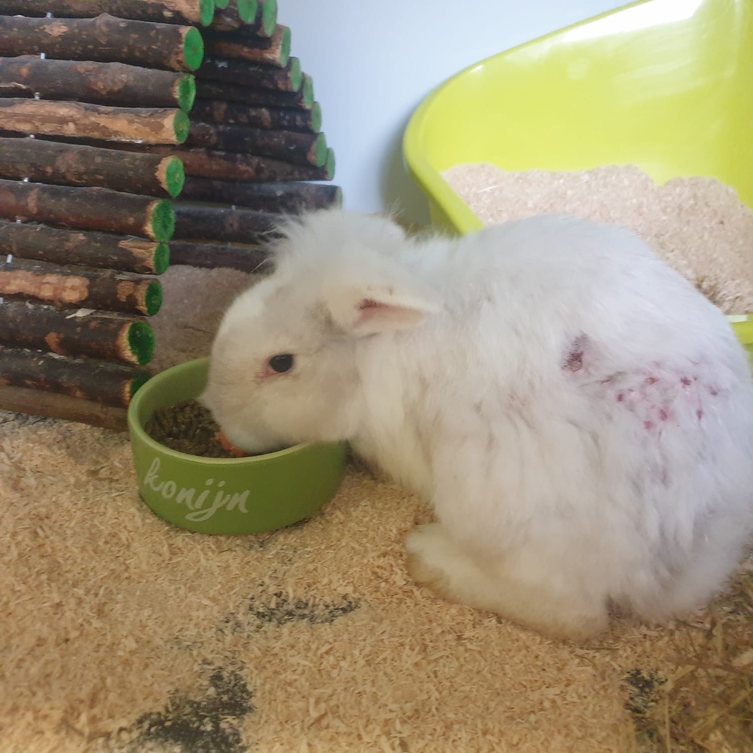 Woensdag 15 maart werden de groene kliko’s geleegd op de Philips van Hornestraat in Weert. De vuilnismannen checken altijd de bak voordat deze geleegd wordt en maar goed ook! Zo vonden ze dit konijntje levend bovenop het afval, hartstikke mager en vol met bijtwonden.