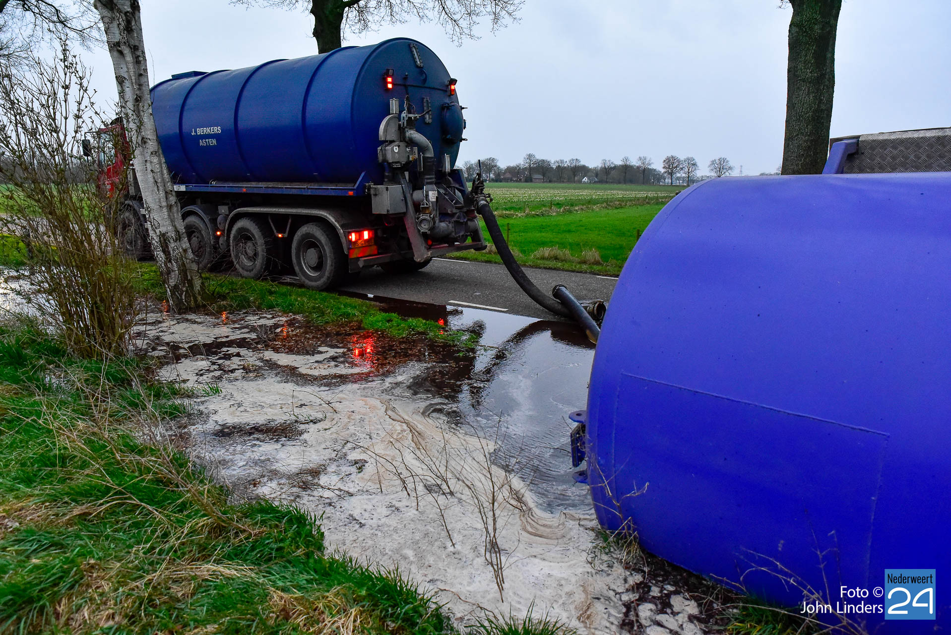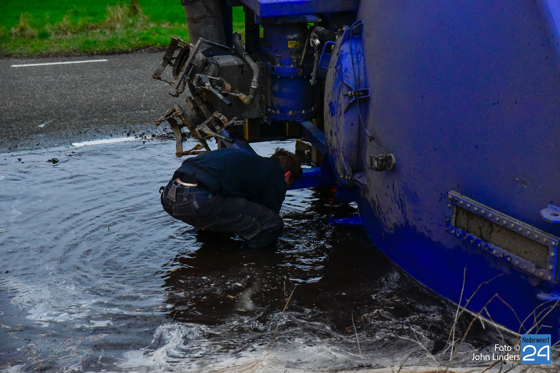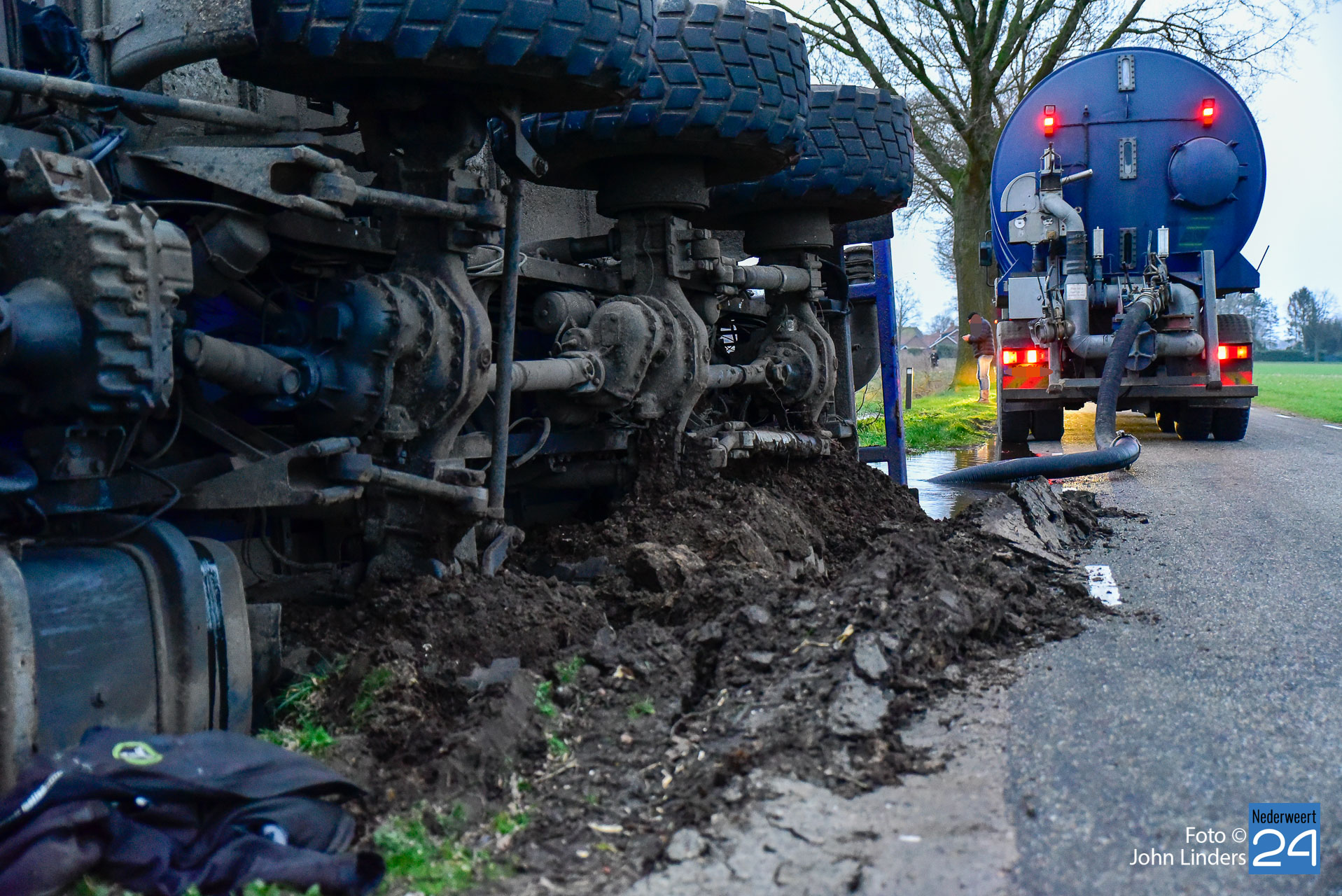 De mest is overgepompt in een andere vrachtauto. De gekantelde wagen zal later recht gezet gaan worden wat naar verwachting nog een hele klus zal zijn.