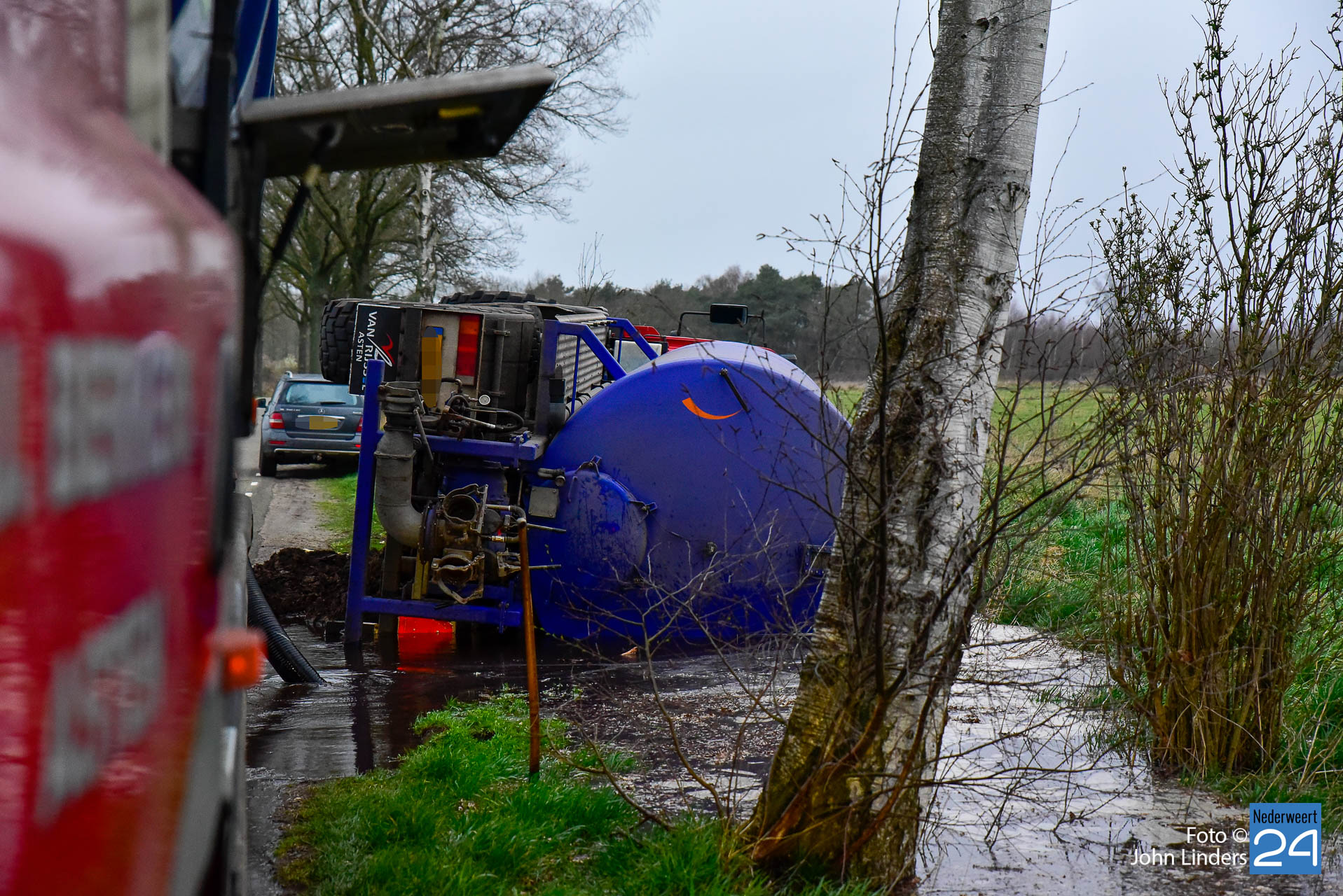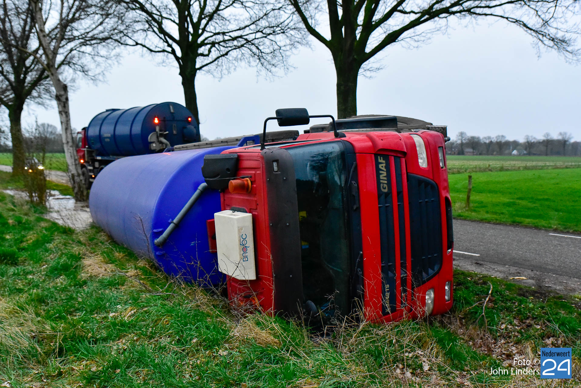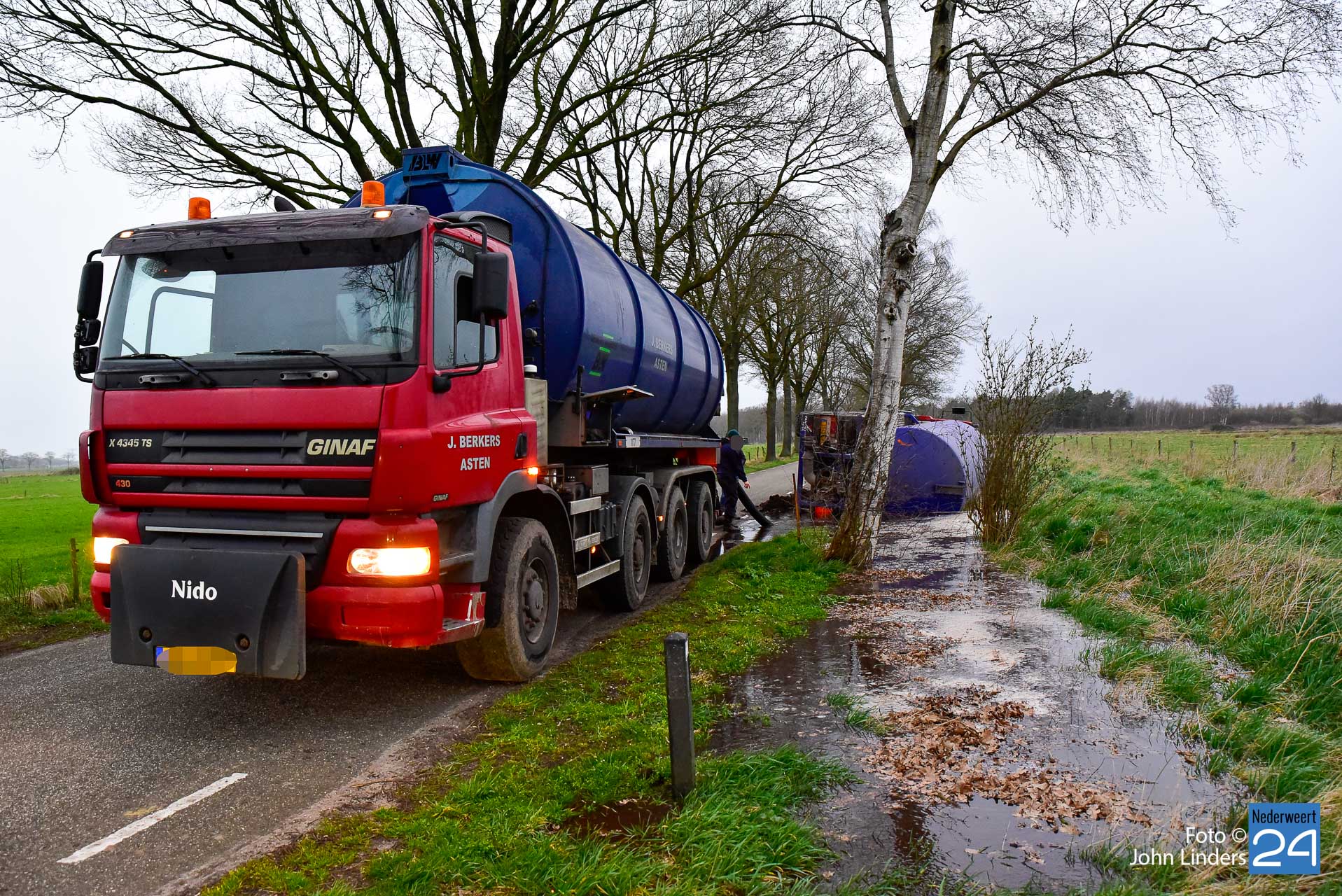De mest is overgepompt in een andere vrachtauto. De gekantelde wagen zal later recht gezet gaan worden wat naar verwachting nog een hele klus zal zijn.