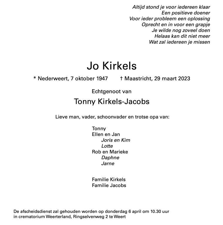 Overlijdensbericht: Jo Kirkels †