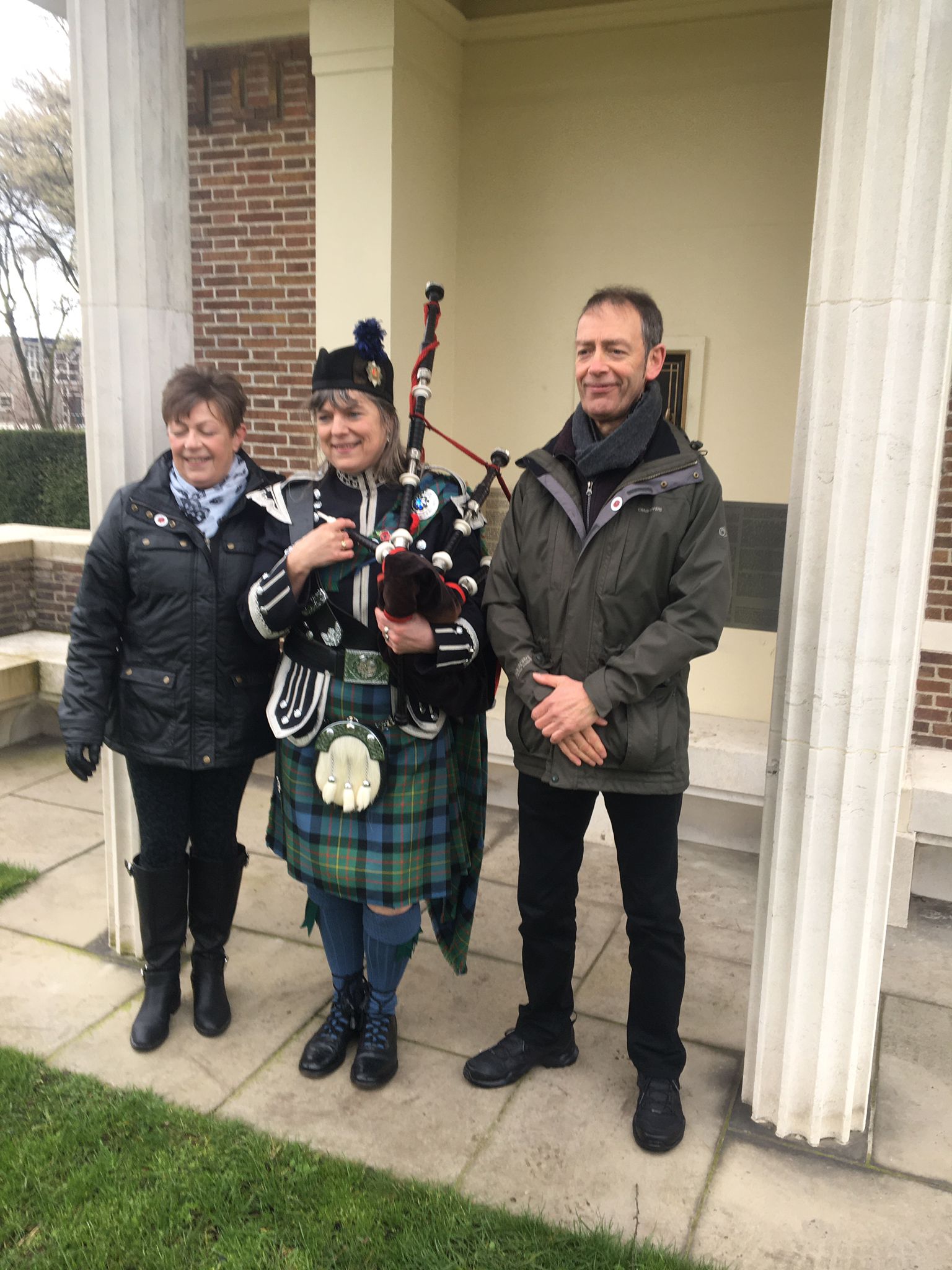 Tijdens de ceremonie werden er door William Campbell uit Coatbridge (neef van Dennis) en zijn echtgenote Josephine en Donna Campbell uit Glenboig (nicht van Dennis) met haar echtgenoot Jim Wood, bloemen gelegd bij het graf. Helaas kon de broer van Dennis het geplande bezoek niet meer meemaken. Hij overleed onlangs en hierdoor werd het een emotioneel bezoek onder begeleiding van Jeanine Stassen op doedelzak.