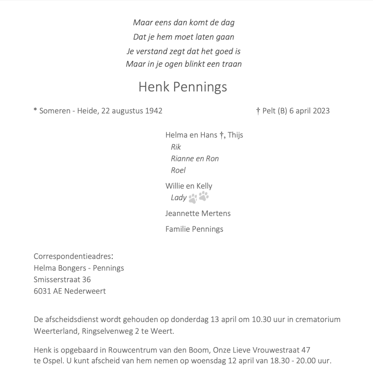 Met Henk kon ik goed praten over de allerlei dingen in het leven.