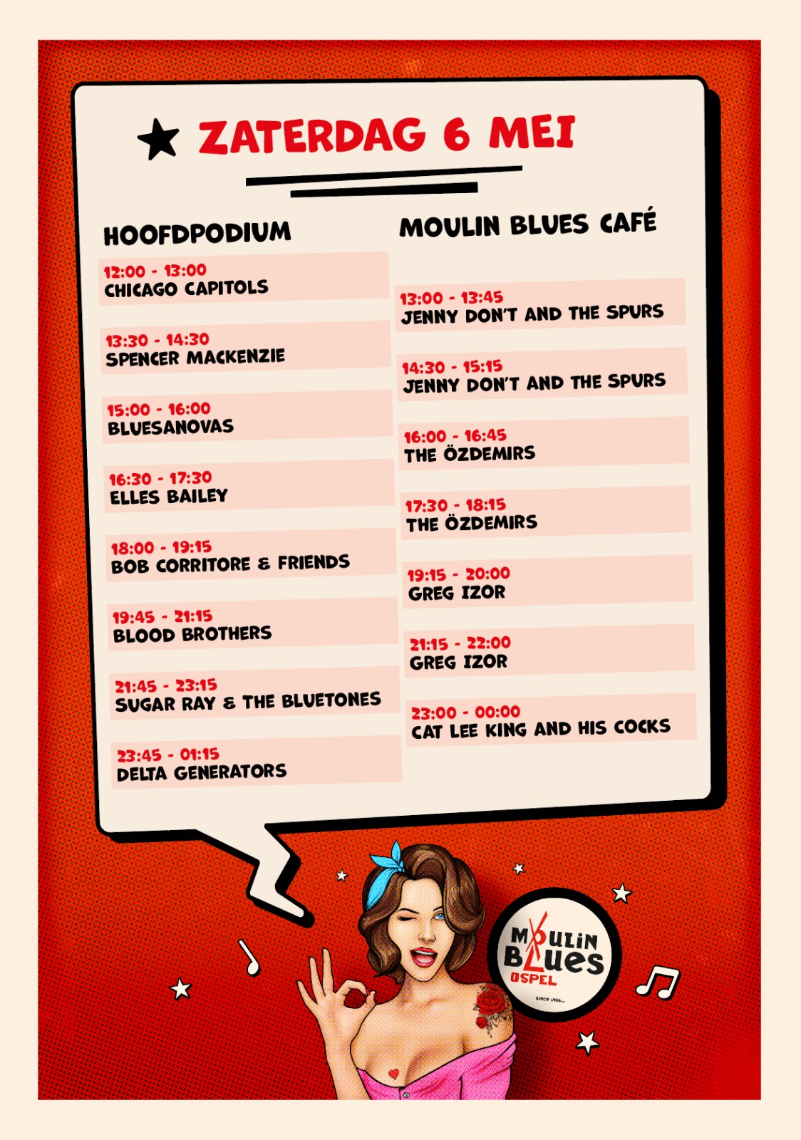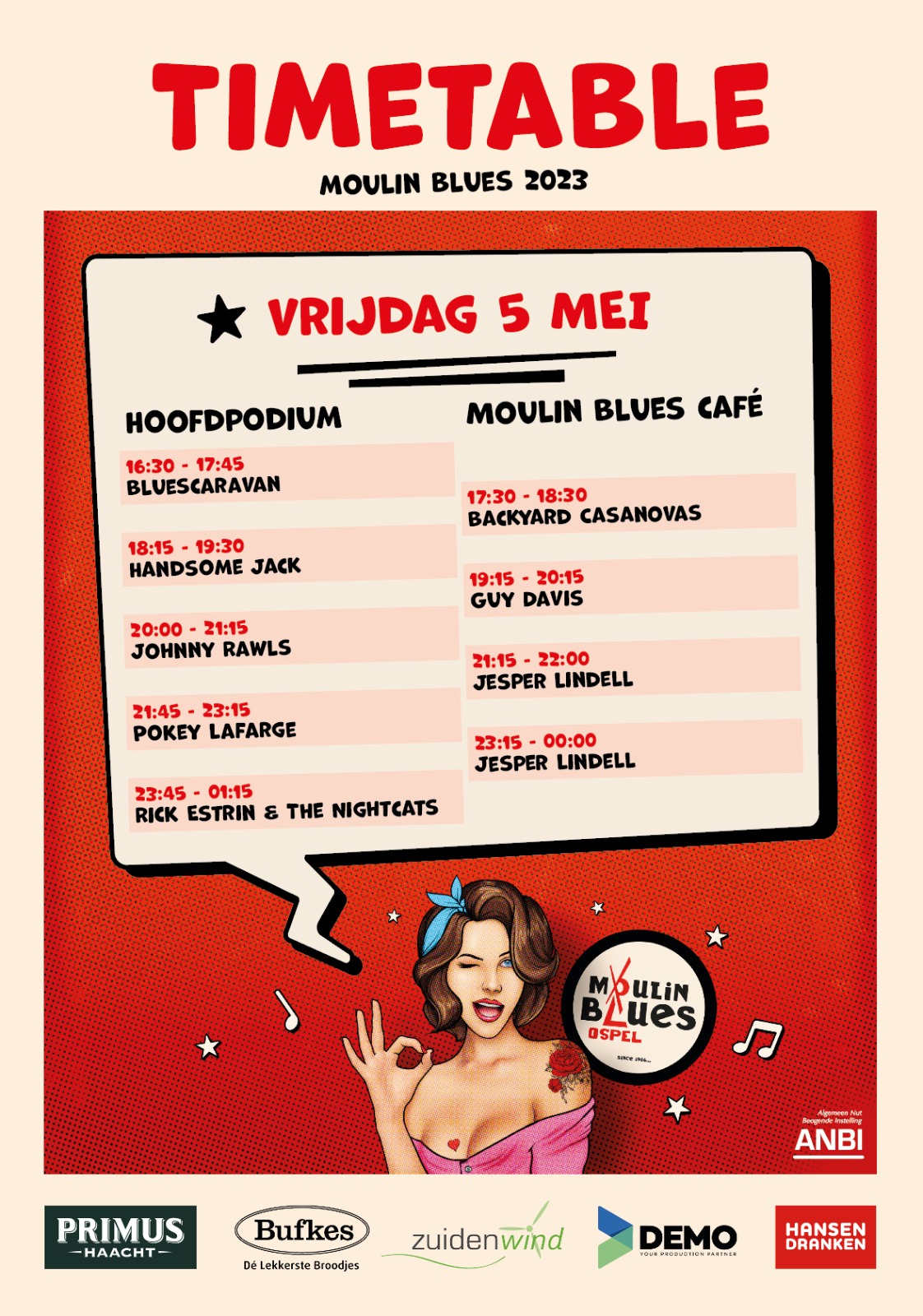 Op welk tijdstip moet je extra scherp zijn? Bij de ingang van het Moulin Blues festivalterrein zijn programmaboekjes vrij verkrijgbaar. Ook vind je de timetable alvast hier beneden. Wil jij Moulin Blues ook niet missen, koop dan nog snel je ticket!