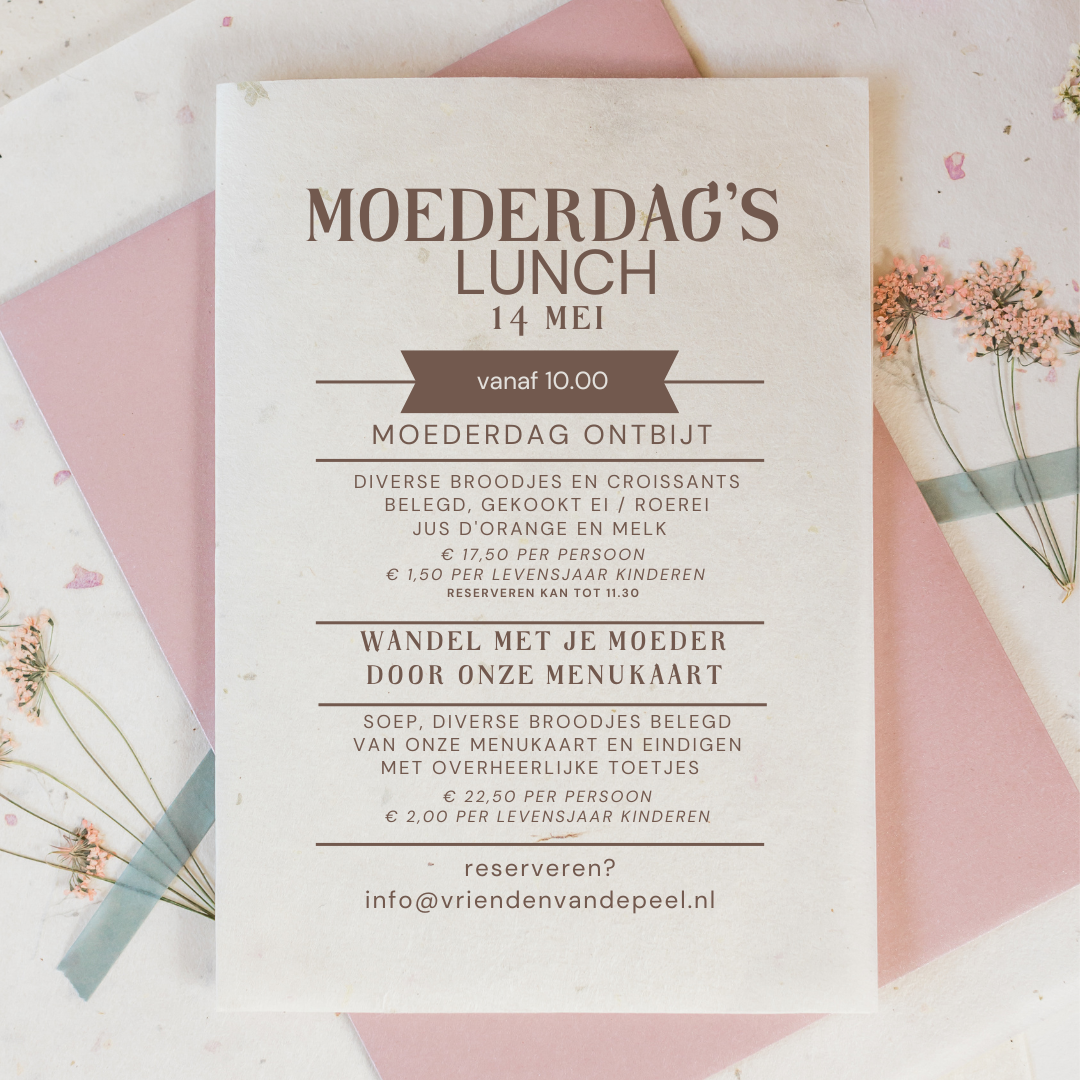 Geen bloemen of chocolaatjes dit jaar, maar kom gezellig ontbijten of lunchen. Uiteraard welkom met het hele gezin of lekker gezellig met oma! Iedereen is welkom. Wil je een tafeltje reserveren? Stuur een mailtje naar info@vriendenvandepeel.nl of bel naar 0495 631619.