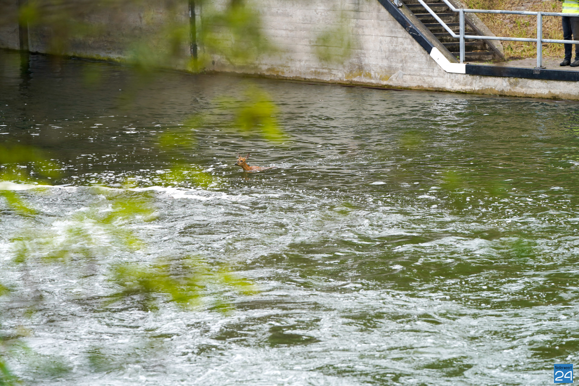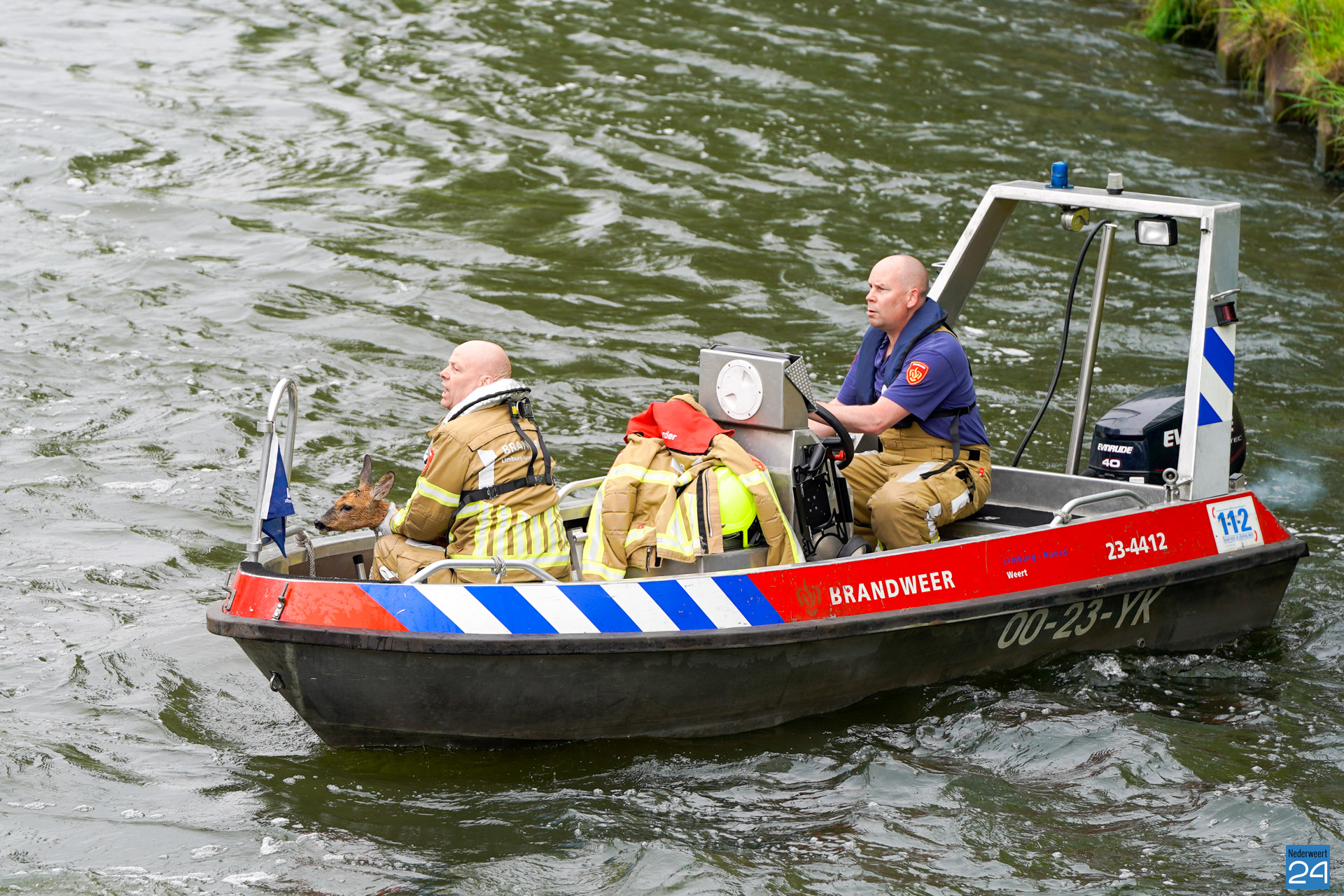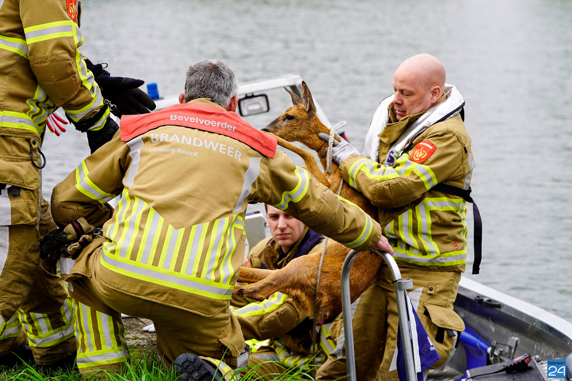 Het ree kon niet meer zelf uit het water komen. De brandweer werd opgeroepen en ging met een bootje te water om het dier te redden. Het dier was wat in paniek en “zwom” van de ene kant van het kanaal naar de andere kant.
