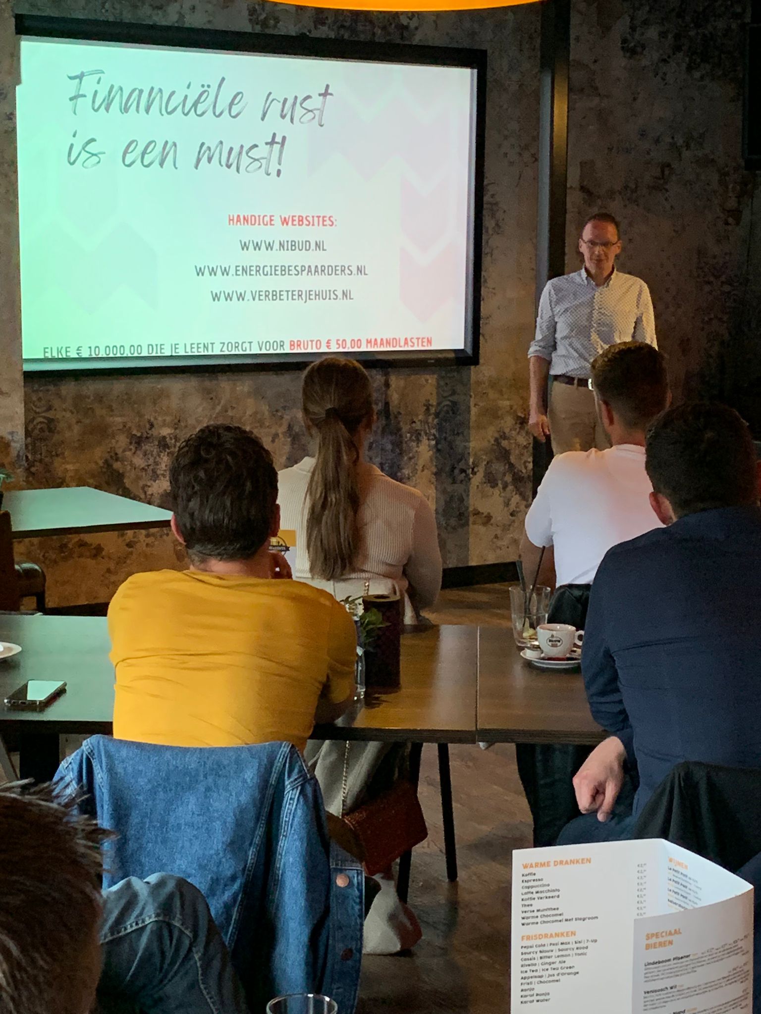 De 24 ‘starters’ waren erg geïnteresseerd, stelden goede vragen en vonden het thema ‘hypotheken voor starters’ en entertainment een goede combinatie. Alle ingredienten waren aanwezig voor een geslaagde avond. Hugo Vossen: “Een woord van dank voor de heerlijke gebakjes van Steff Janssen van Florence, de goede hulp van het fijne personeel van Paul van de Sande van de Kleine Winst en de goede organisatie van Paul Douven. Ook uiteraard dank aan mijn assistente Lilian van Deursen zodat de avond soepel verliep en aan mijn zoon Wouter, die mij geholpen heeft met de powerpoint presentatie.”
