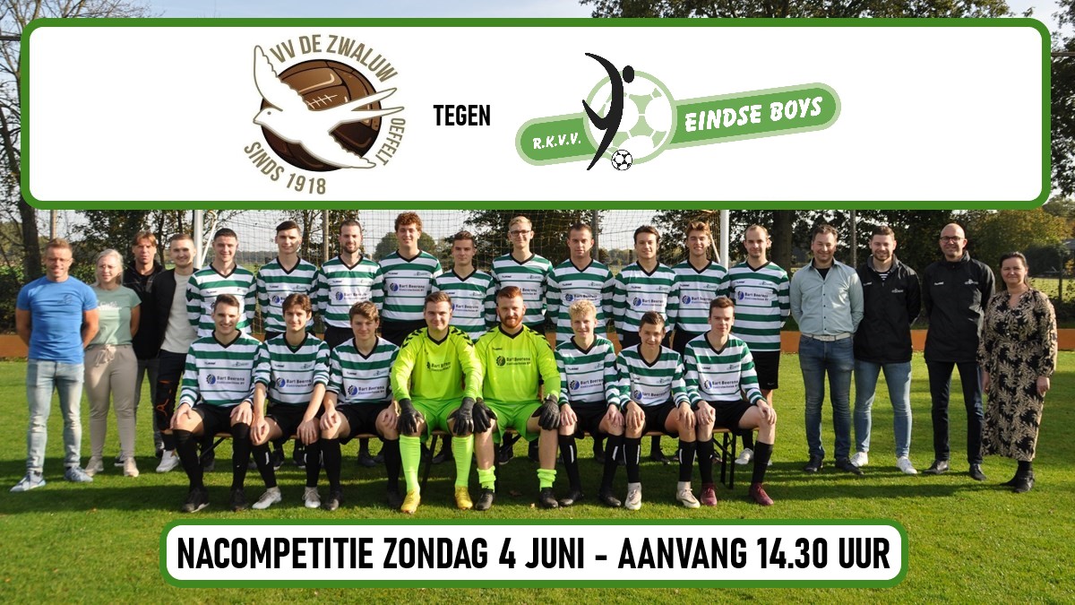 Op zondag 4 juni speelt Eindse Boys een uitwedstrijd bij De Zwaluw in Oeffelt, de een na hoogste periodekampioen uit de 5e klasse D. Het team degradeerde vorig seizoen uit de 4e klasse en wil daar maar wat graag naar terug. Het belooft een pittige wedstrijd te worden bij de Noord Brabantse club in het Land van Cuyk. De winnaar van de wedstrijd De Zwaluw-Eindse Boys speelt op zondag 11 juni op neutraal terrein tegen de hoogste periodekampioen uit 5A. De winnaar promoveert naar de 4e klasse.