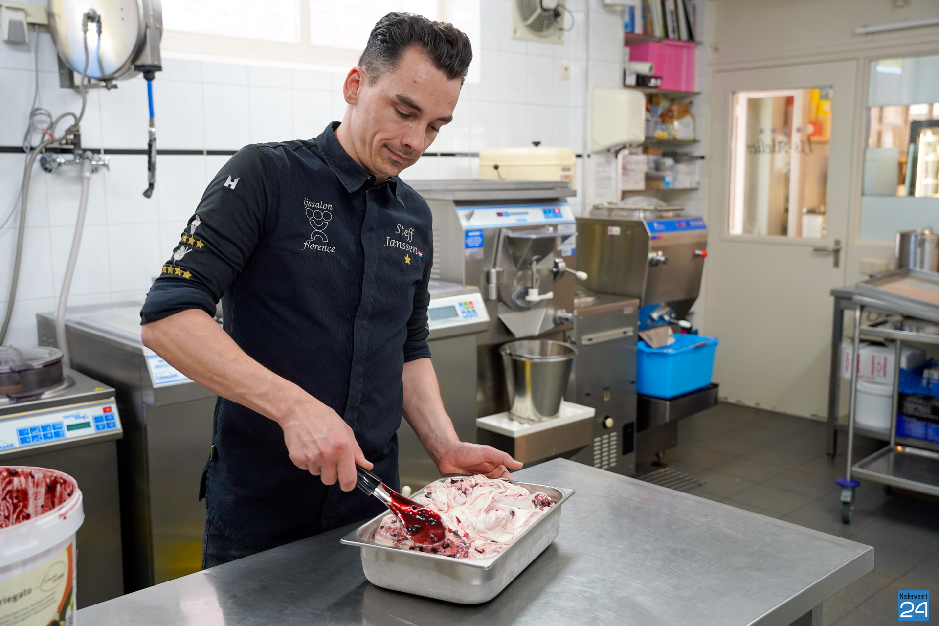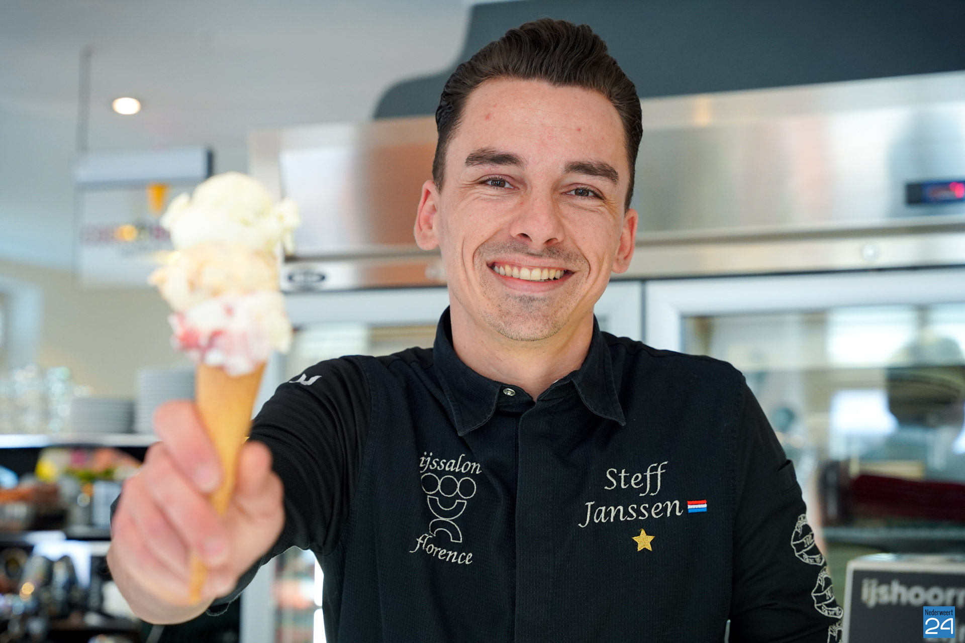 Steff Janssen, 31 jaar en woonachtig in Nederweert, is al 10 jaar werkzaam bij IJssalon Florence aan de Brugstraat. Het familiebedrijf bestaat al 39 jaar en heeft in die tijd de meeste prijzen van Nederland weten te winnen. Als je op zoek bent naar dagvers ijs, heerlijke coupes, ijsgebak en nog veel meer lekkers, dan ben je bij IJssalon Florence aan het juiste adres.