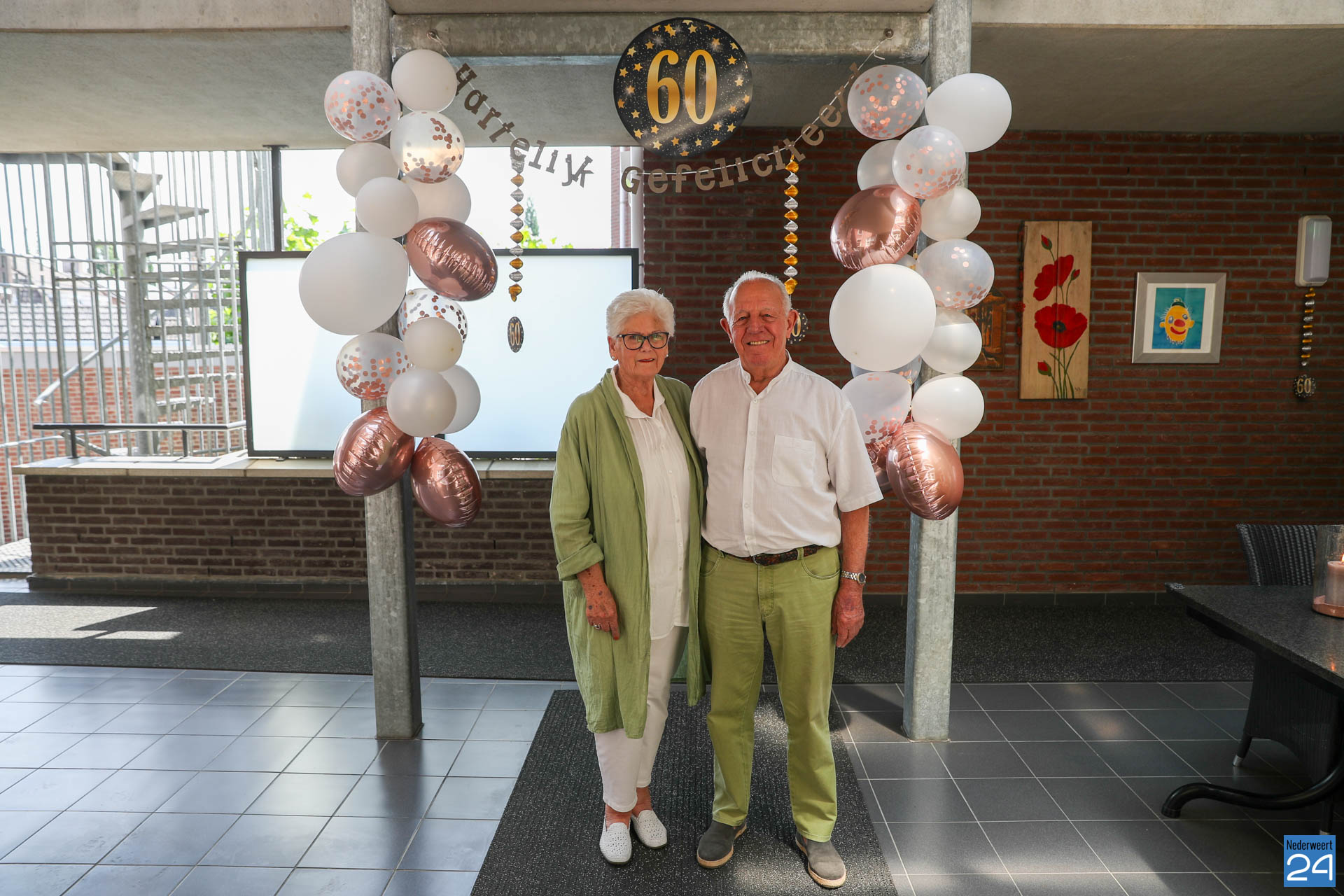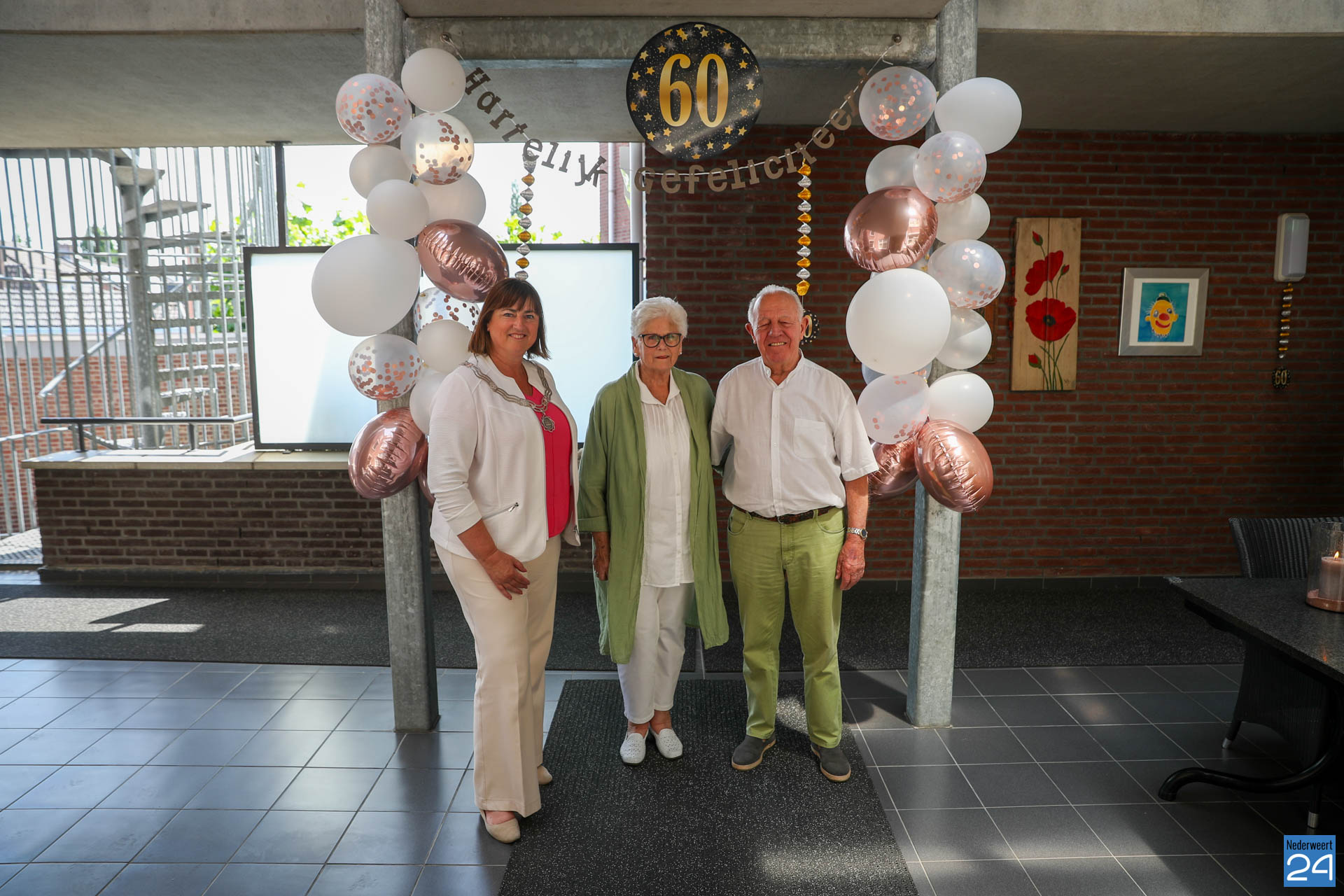 Twan en Nellie Konings-Gommers stapten alweer 60 jaar geleden in het huwelijksbootje. Op 21 juni 1963 trouwden zij voor de wet. Burgemeester Op de Laak kwam langs om het echtpaar te feliciteren met een mooie bos bloemen.