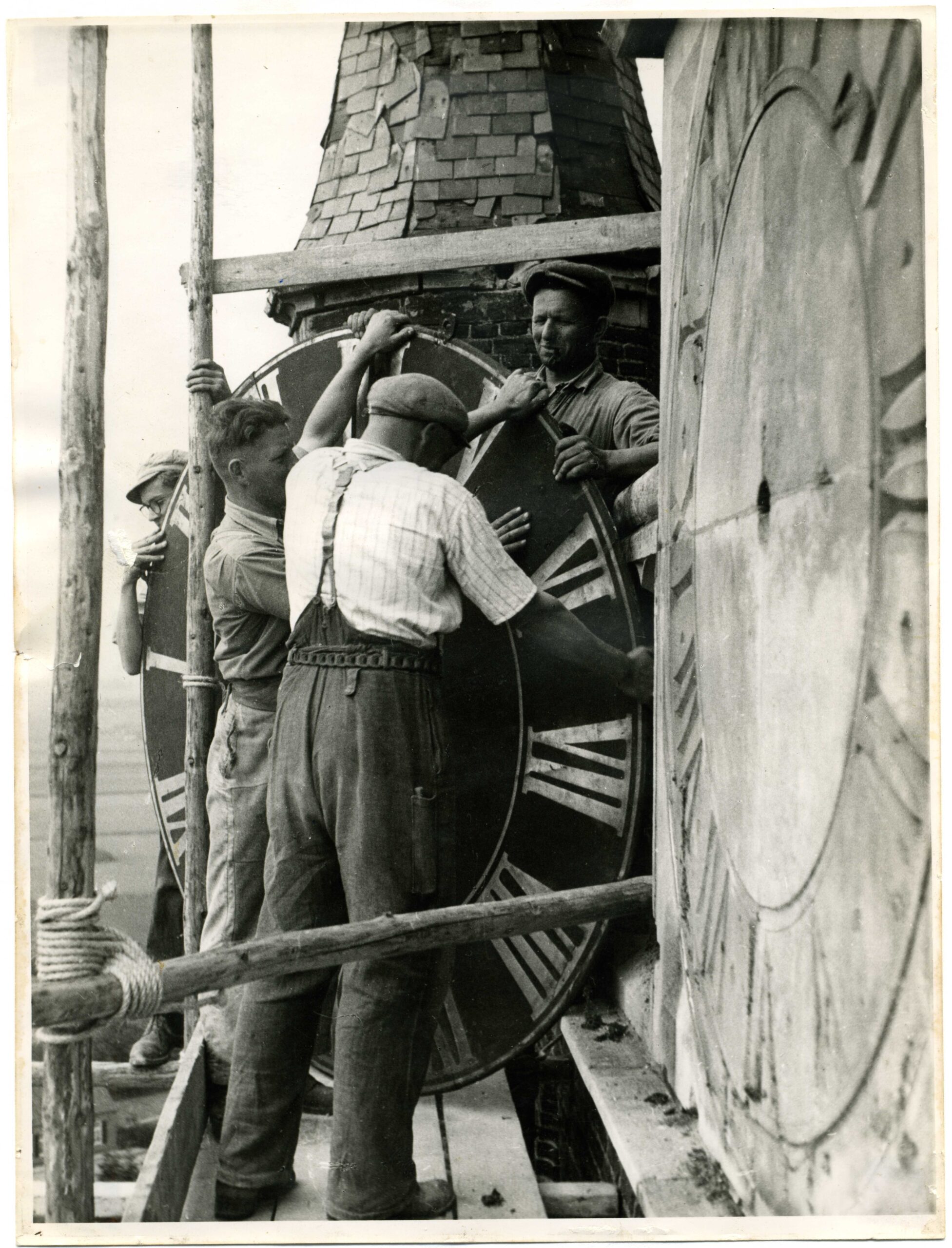 Heroïsche foto van de restauratie van de St. Lambertustoren in 1948. Nog van voor de invoering van de ARBO-wet… Foto van Jan Biezenaar, collectie SGN. Afgebeelde personen: Piet Scheijven, Tinus Saes, Harrie Hoeben en Tjeu Bongers.