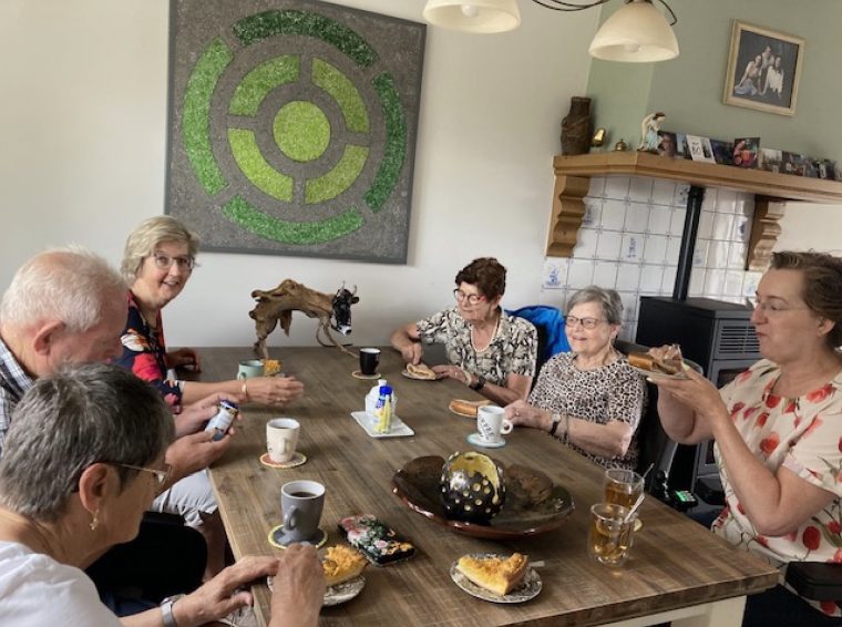 Al enkele jaren horen ze iedere dag elkaars stem via deelname aan de belcirkel. Vandaag zien ze elkaar in levende lijve. Onder het genot van een kopje koffie en een stukje vlaai bij Mia Zegeveld. Heerlijk om eens met elkaar te buurten met het gezicht voor je. De belcirkel in Leveroy is n groot succes en rolt al jaren voorruit. Zie de bijgevoegde flyer voor meer informatie.