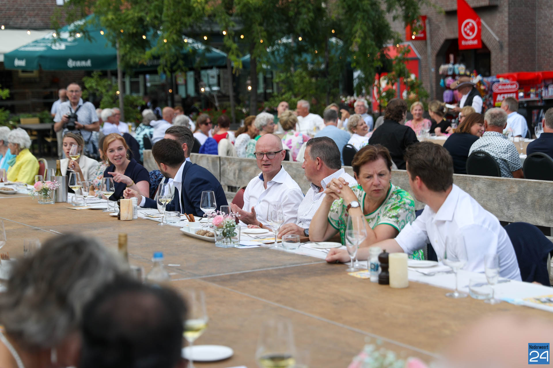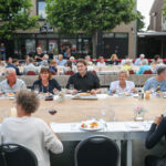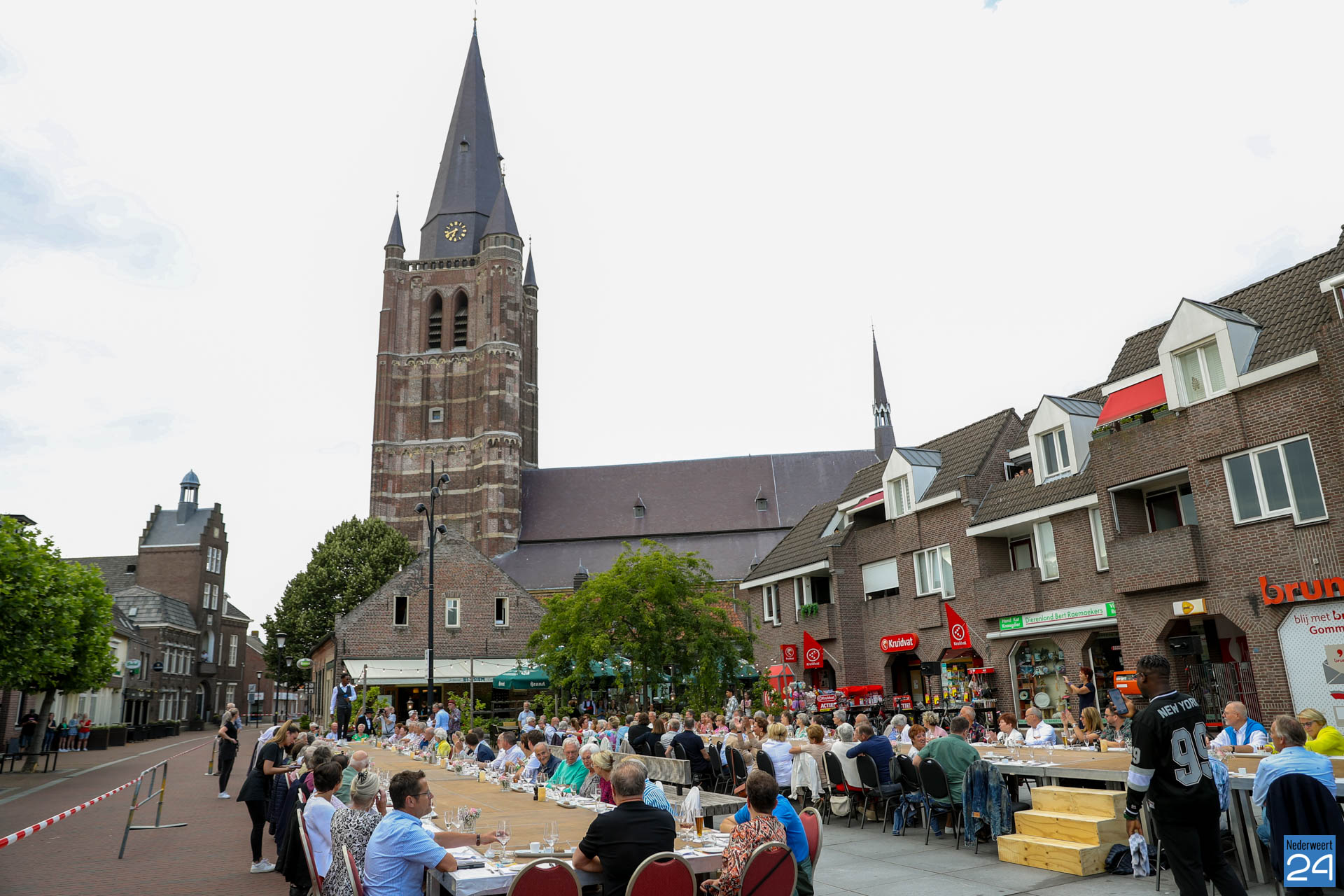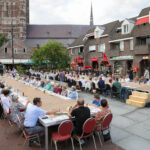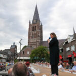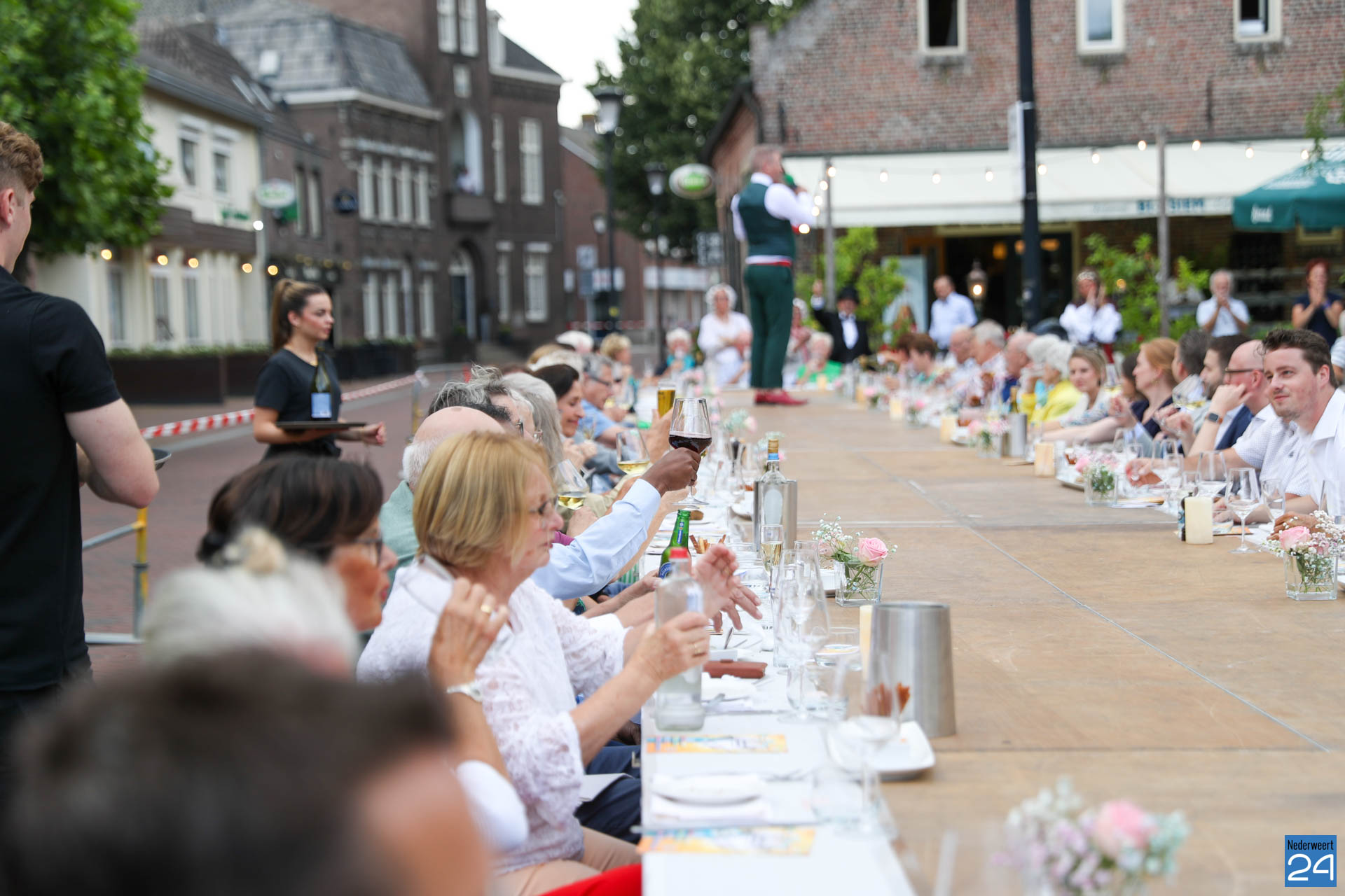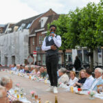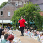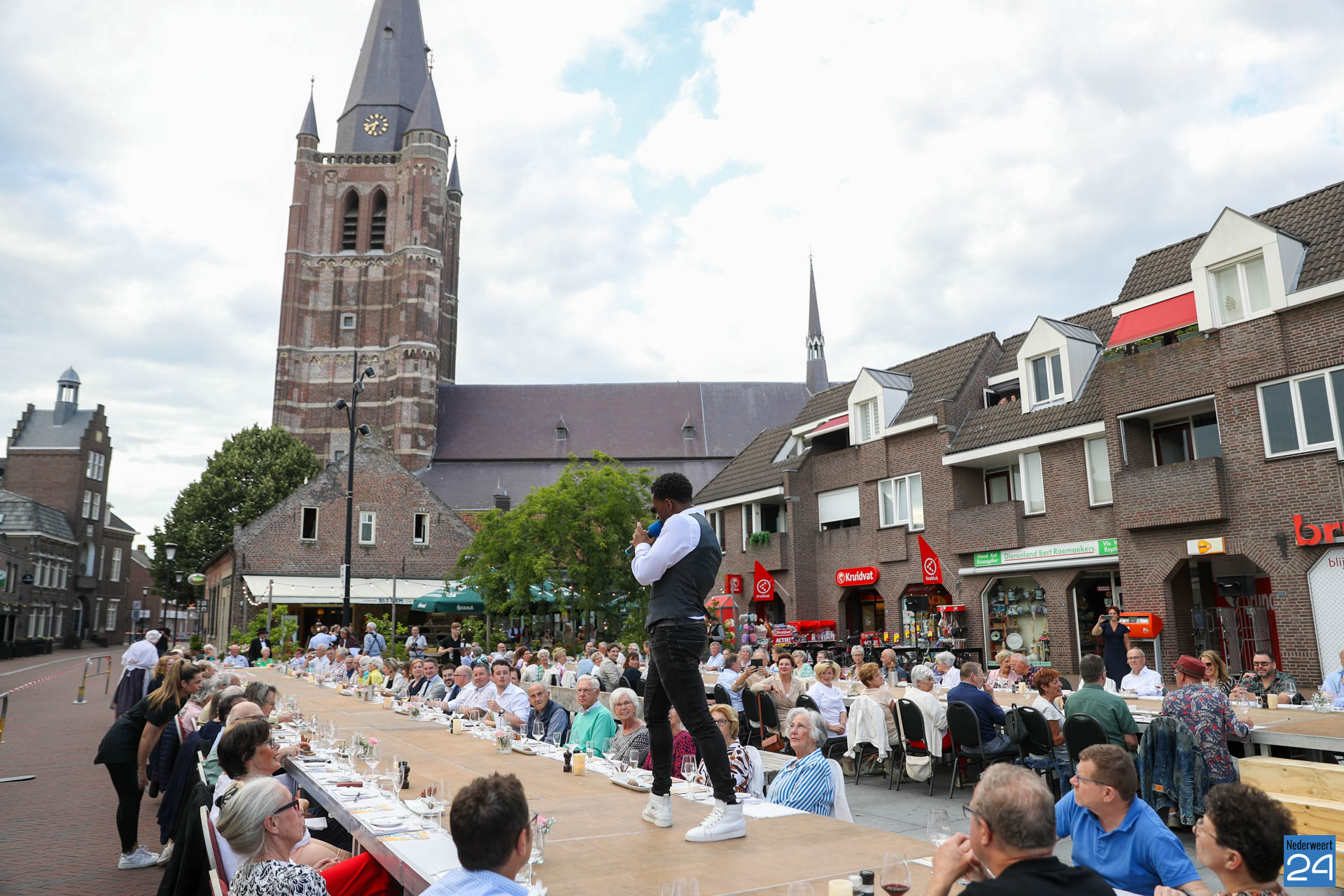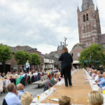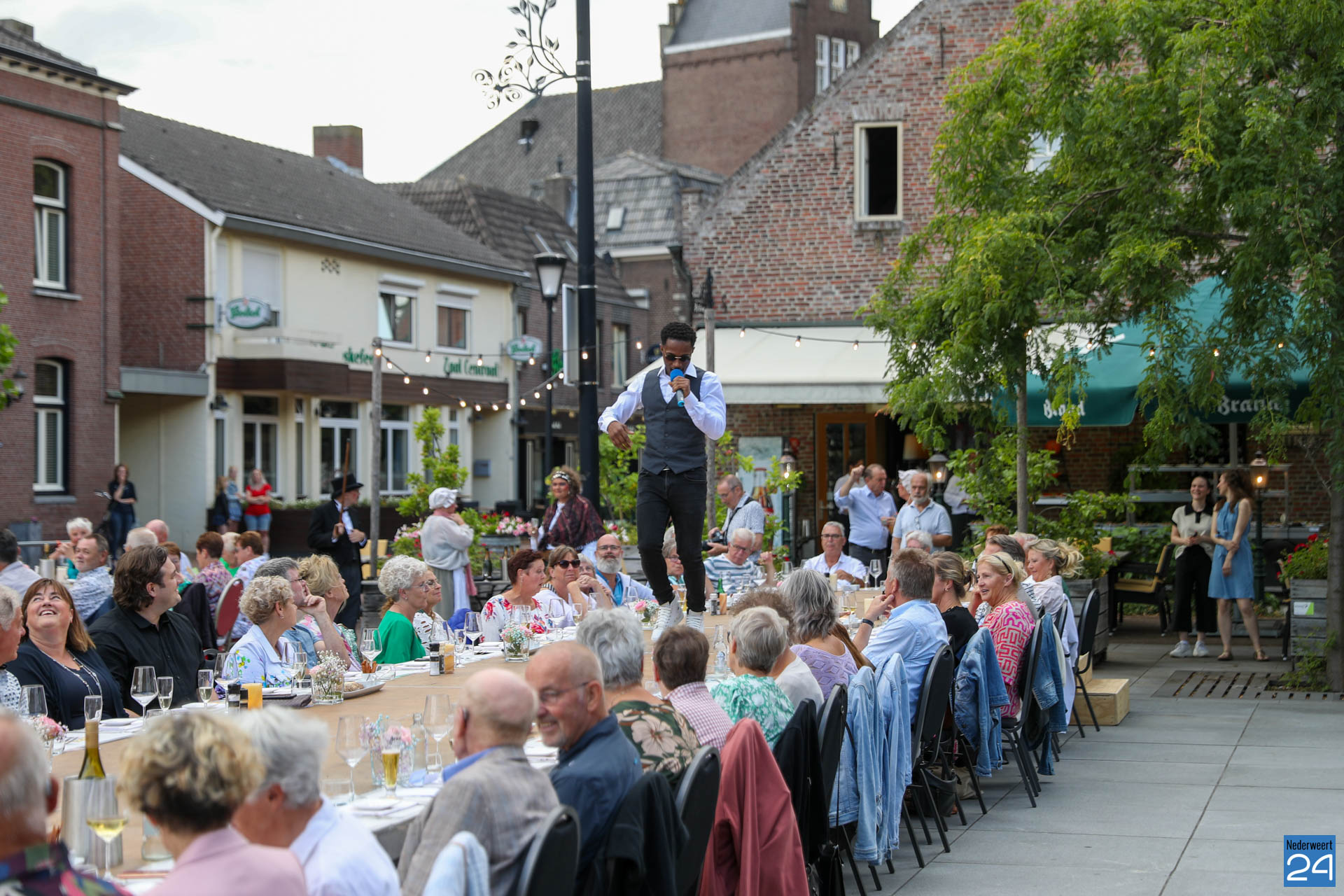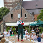 Zo’n 130 gasten schoven tijdens deze mooie zomeravond aan voor een heerlijk diner. Onder hen twee gedeputeerden van de Provincie Limburg: Jasper Kuntzelaers (o.a. Cultuur & Erfgoed) en Michael Theuns (o.a. Ruimte & Wonen). Zij werden welkom geheten door burgemeester Op de Laak. Tussen de dinergangen door werden de aanwezigen verwend met muzikale en theatrale optredens van verschillende gezelschappen. Rap, dans, klassiek en operazang, toneelspel en een karikatuurtekenaar. Het gebeurde allemaal op het Lambertushof. Veel applaus was er ook voor presentator Bjorn Smits die enkele malen voordroeg uit een verloren gewaand dagboek van de Lambertustoren.