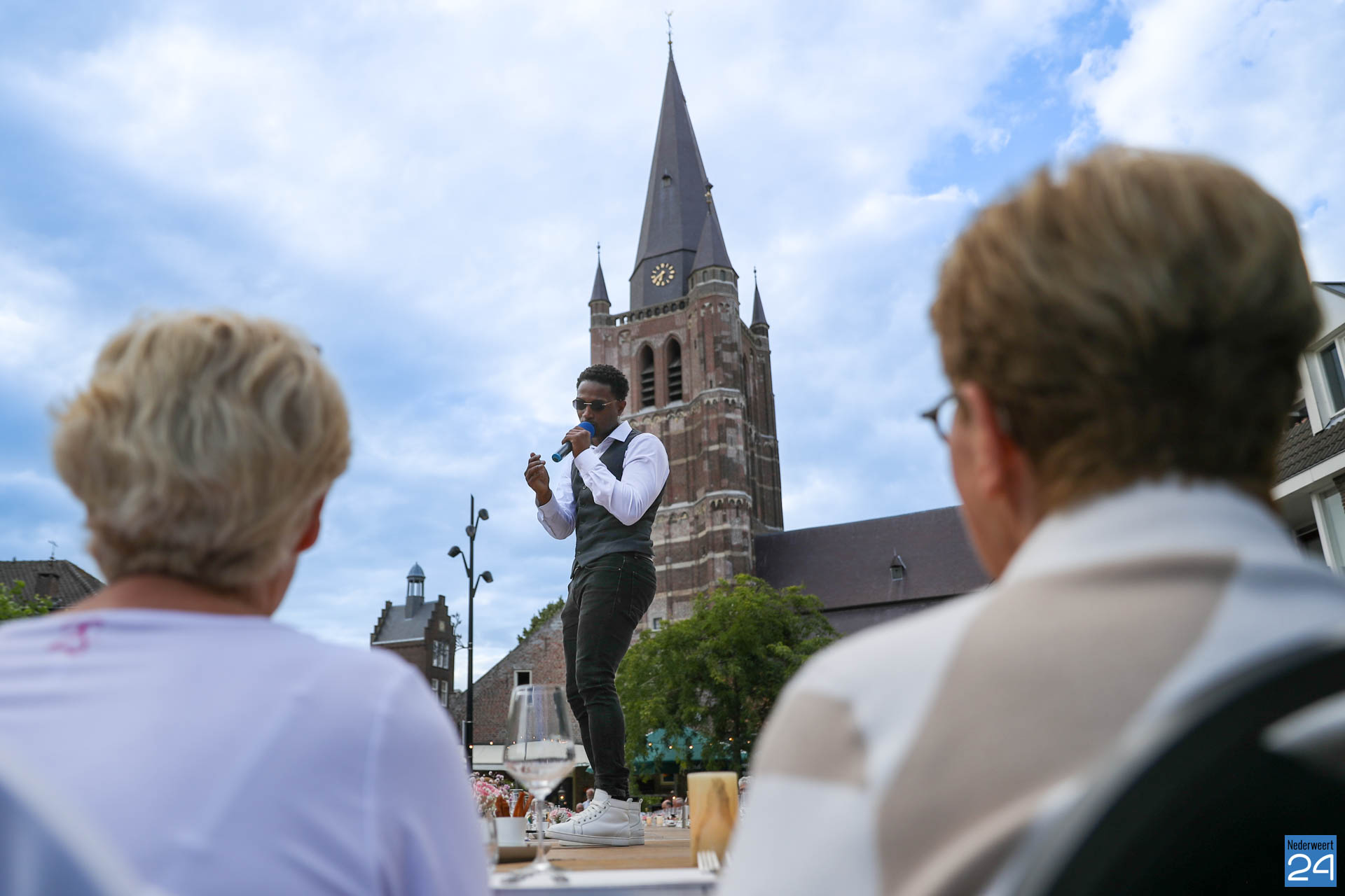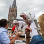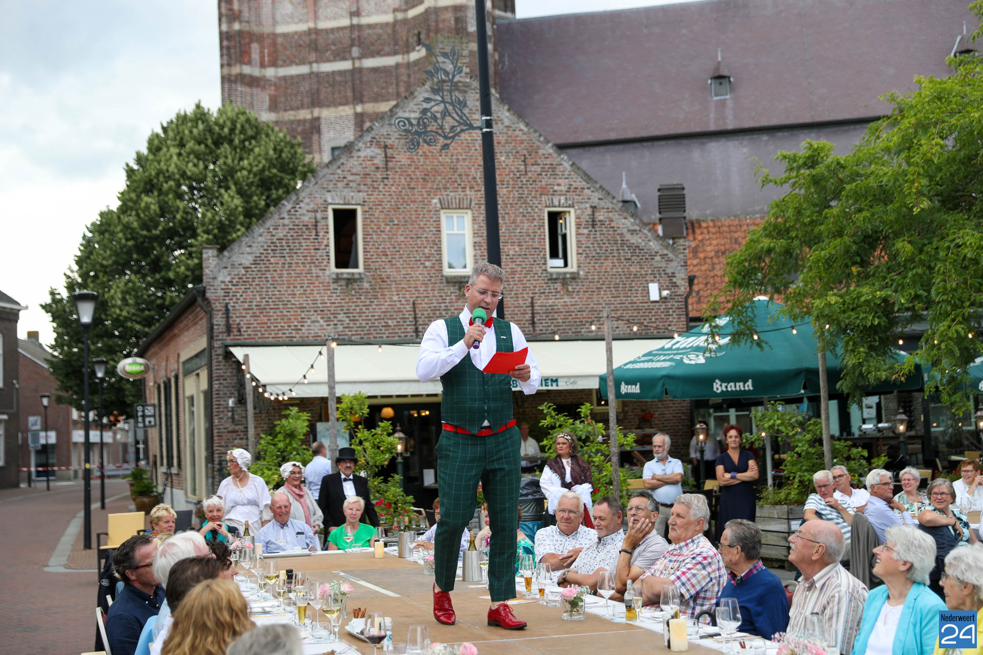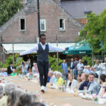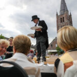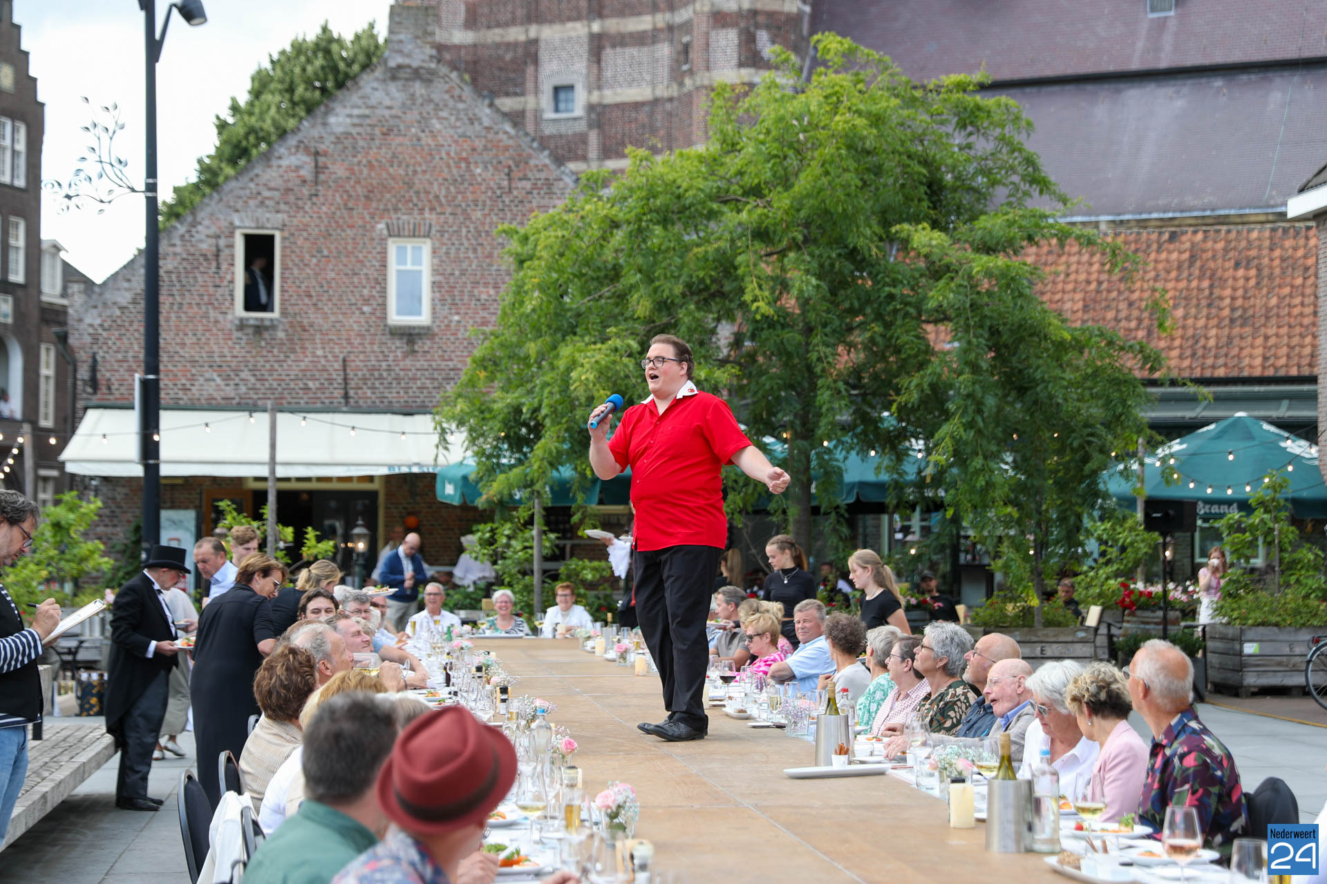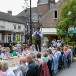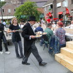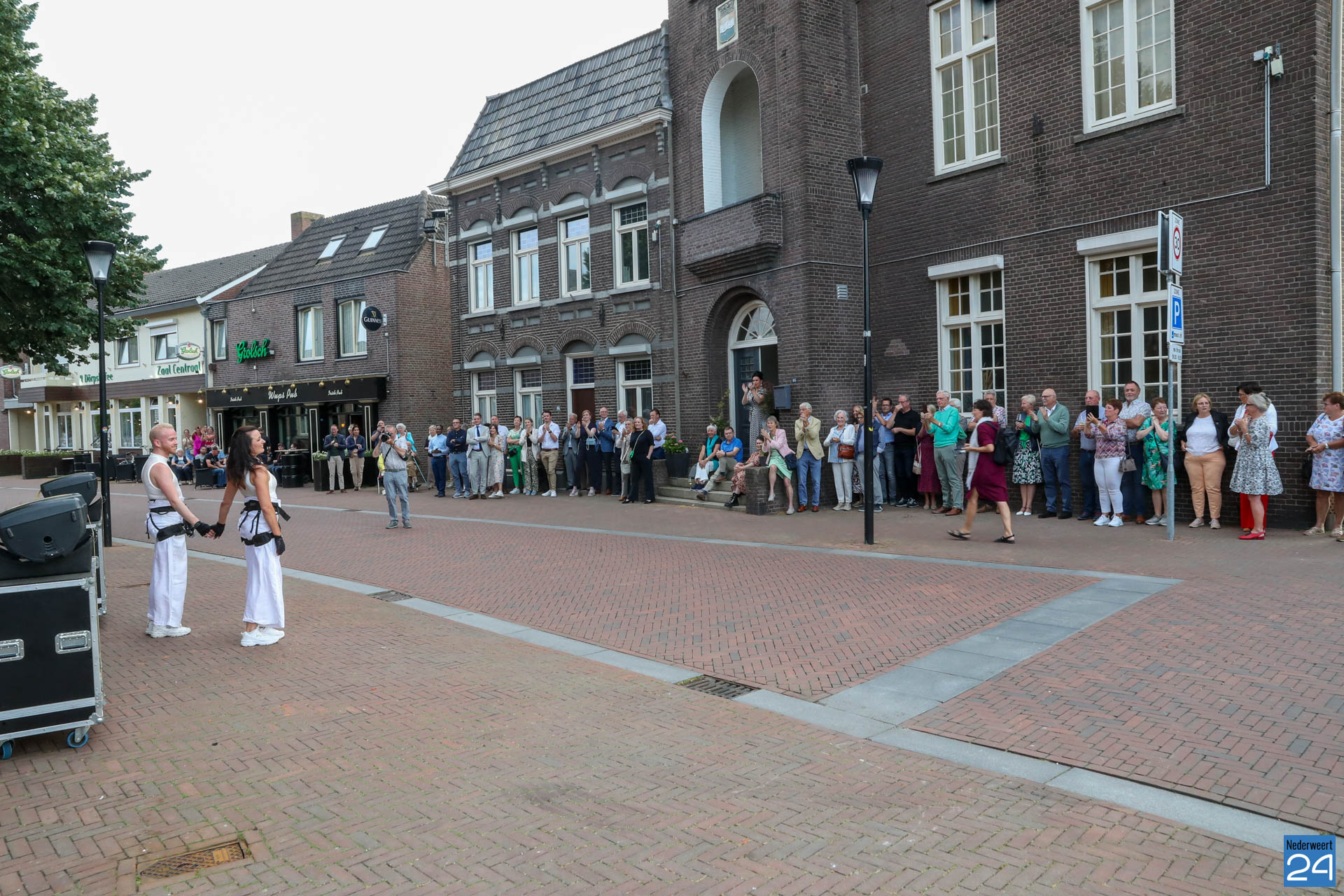 Zo’n 130 gasten schoven tijdens deze mooie zomeravond aan voor een heerlijk diner. Onder hen twee gedeputeerden van de Provincie Limburg: Jasper Kuntzelaers (o.a. Cultuur & Erfgoed) en Michael Theuns (o.a. Ruimte & Wonen). Zij werden welkom geheten door burgemeester Op de Laak. Tussen de dinergangen door werden de aanwezigen verwend met muzikale en theatrale optredens van verschillende gezelschappen. Rap, dans, klassiek en operazang, toneelspel en een karikatuurtekenaar. Het gebeurde allemaal op het Lambertushof. Veel applaus was er ook voor presentator Bjorn Smits die enkele malen voordroeg uit een verloren gewaand dagboek van de Lambertustoren.