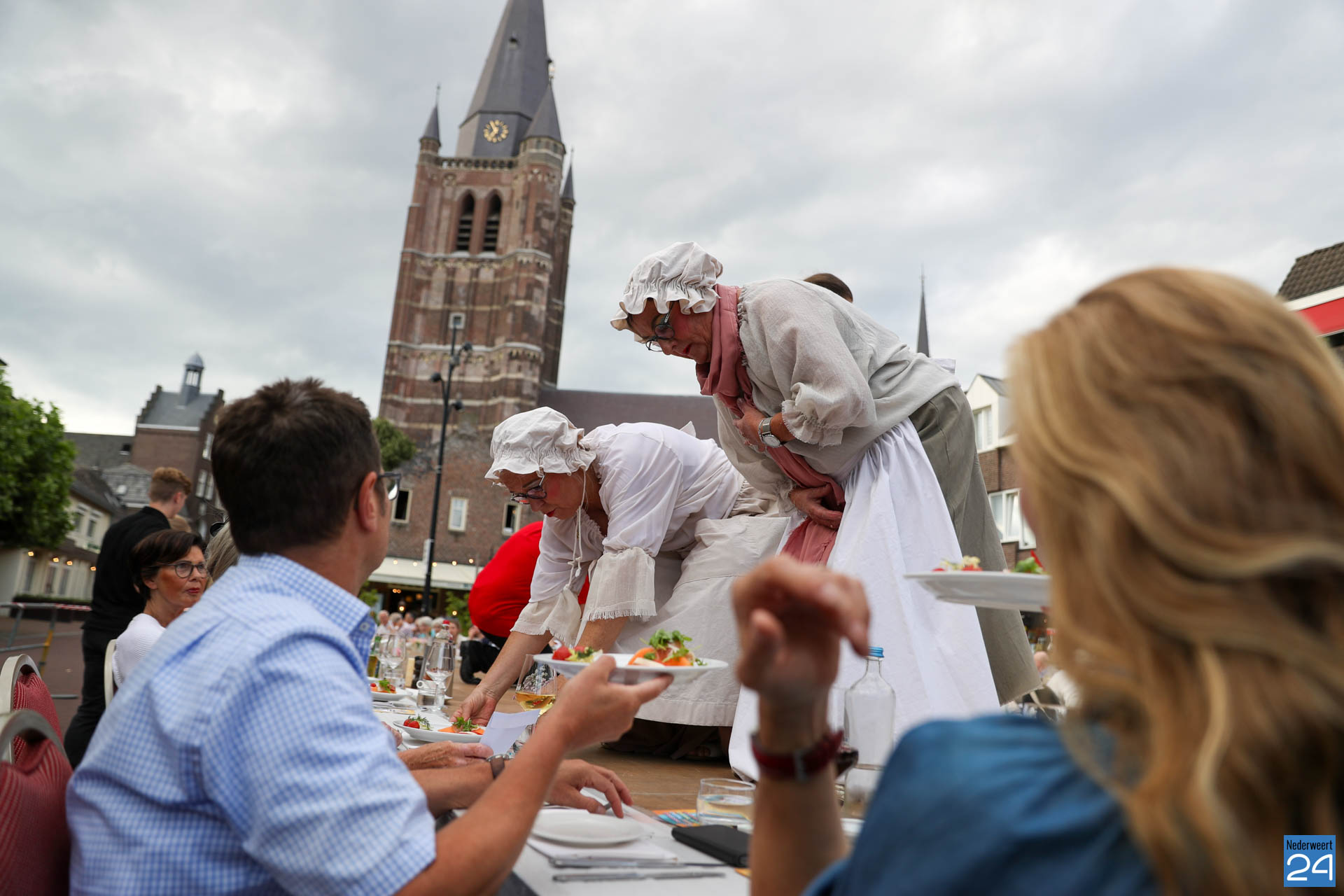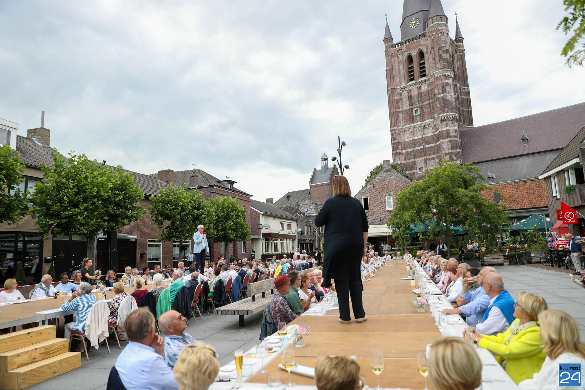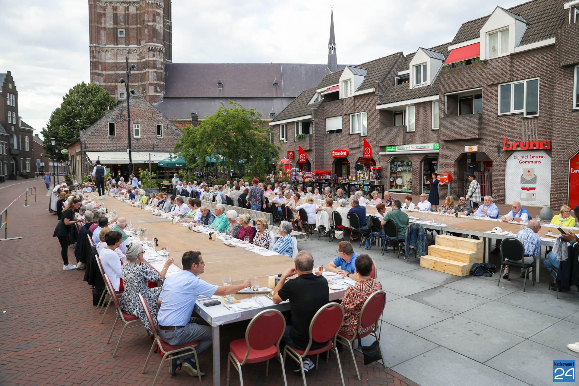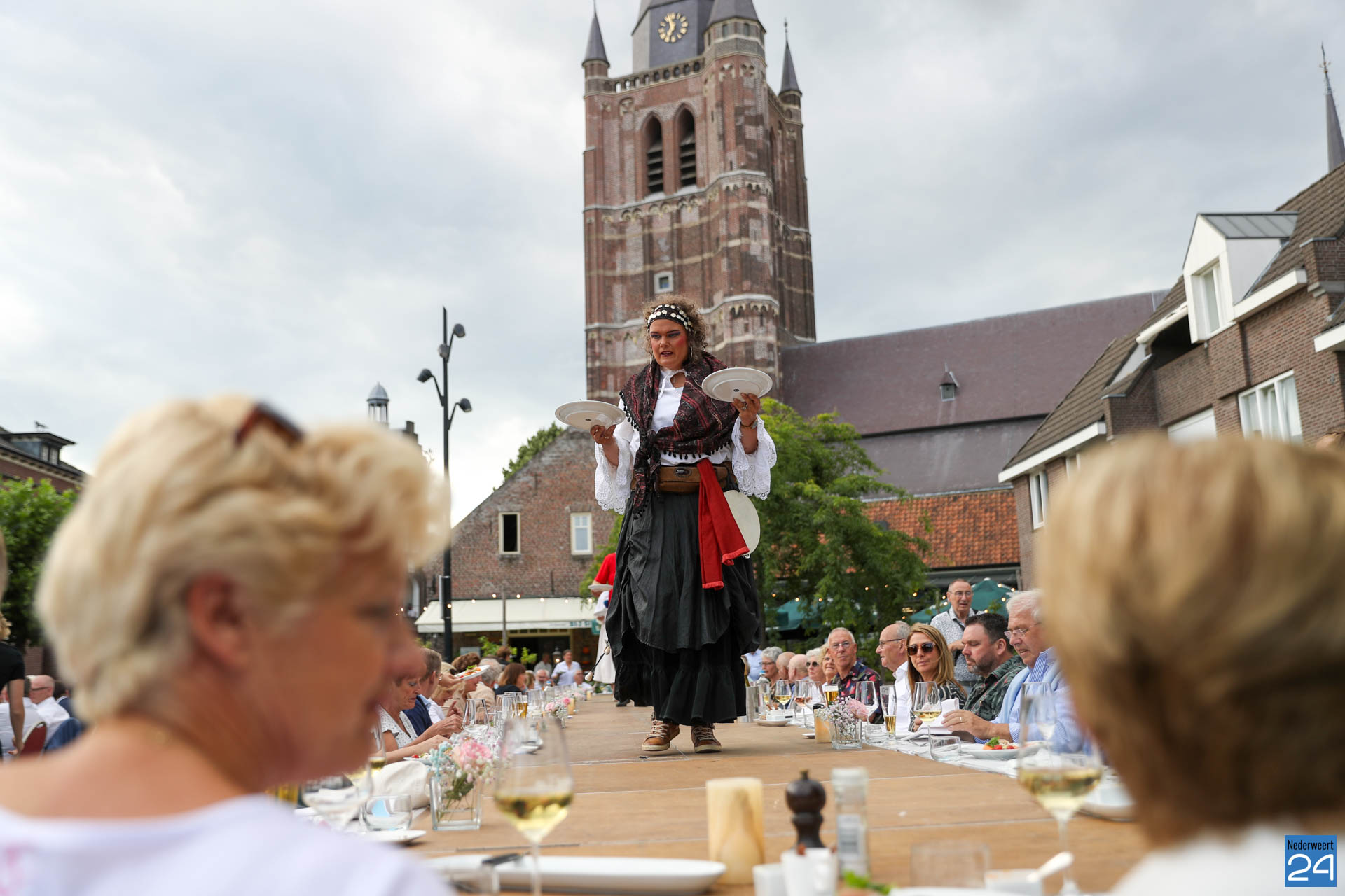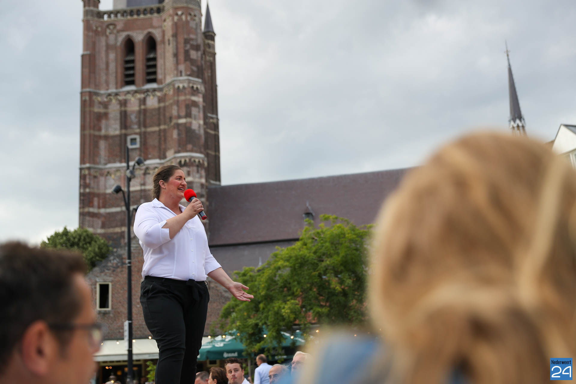 Zo’n 130 gasten schoven tijdens deze mooie zomeravond aan voor een heerlijk diner. Onder hen twee gedeputeerden van de Provincie Limburg: Jasper Kuntzelaers (o.a. Cultuur & Erfgoed) en Michael Theuns (o.a. Ruimte & Wonen). Zij werden welkom geheten door burgemeester Op de Laak. Tussen de dinergangen door werden de aanwezigen verwend met muzikale en theatrale optredens van verschillende gezelschappen. Rap, dans, klassiek en operazang, toneelspel en een karikatuurtekenaar. Het gebeurde allemaal op het Lambertushof. Veel applaus was er ook voor presentator Bjorn Smits die enkele malen voordroeg uit een verloren gewaand dagboek van de Lambertustoren.