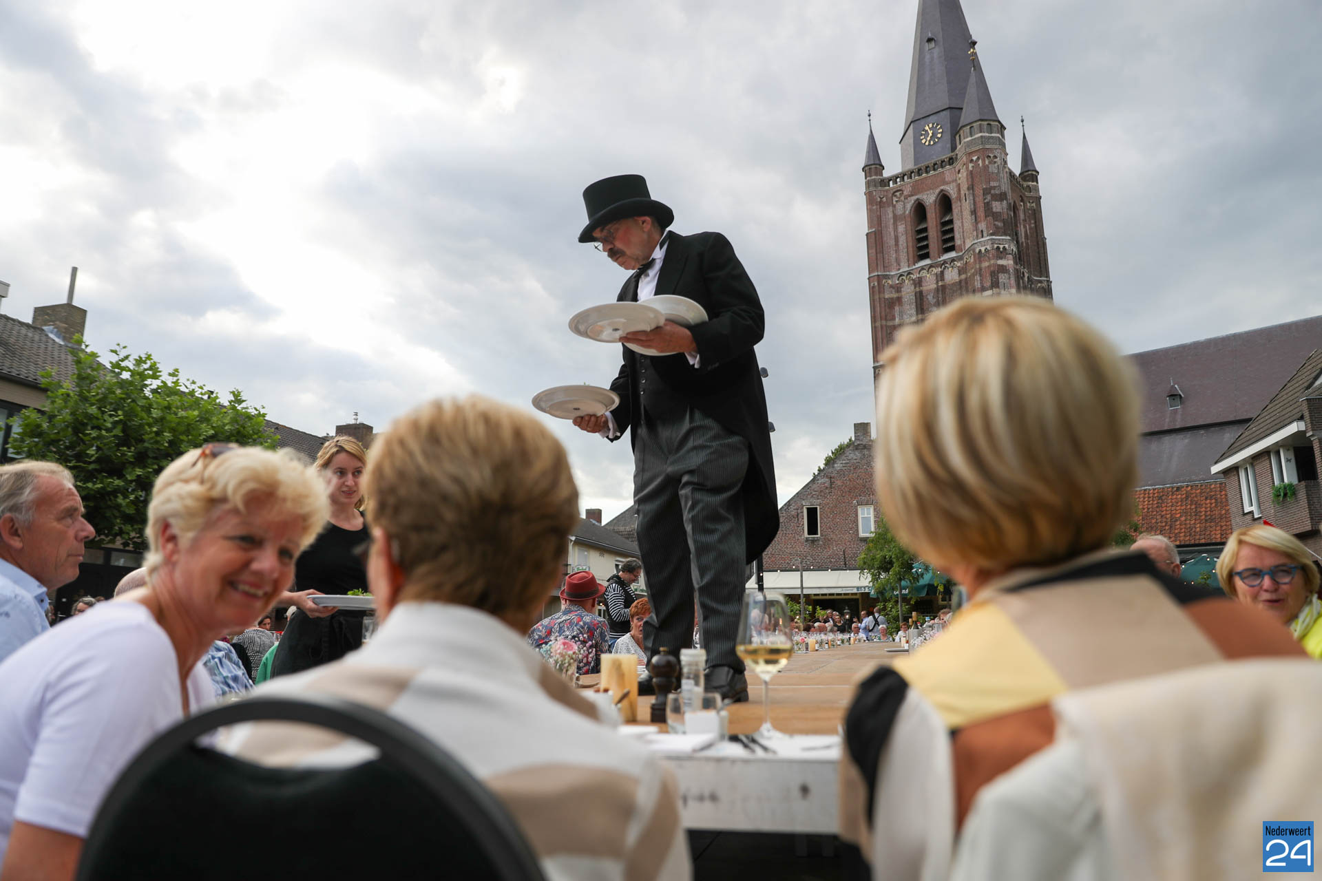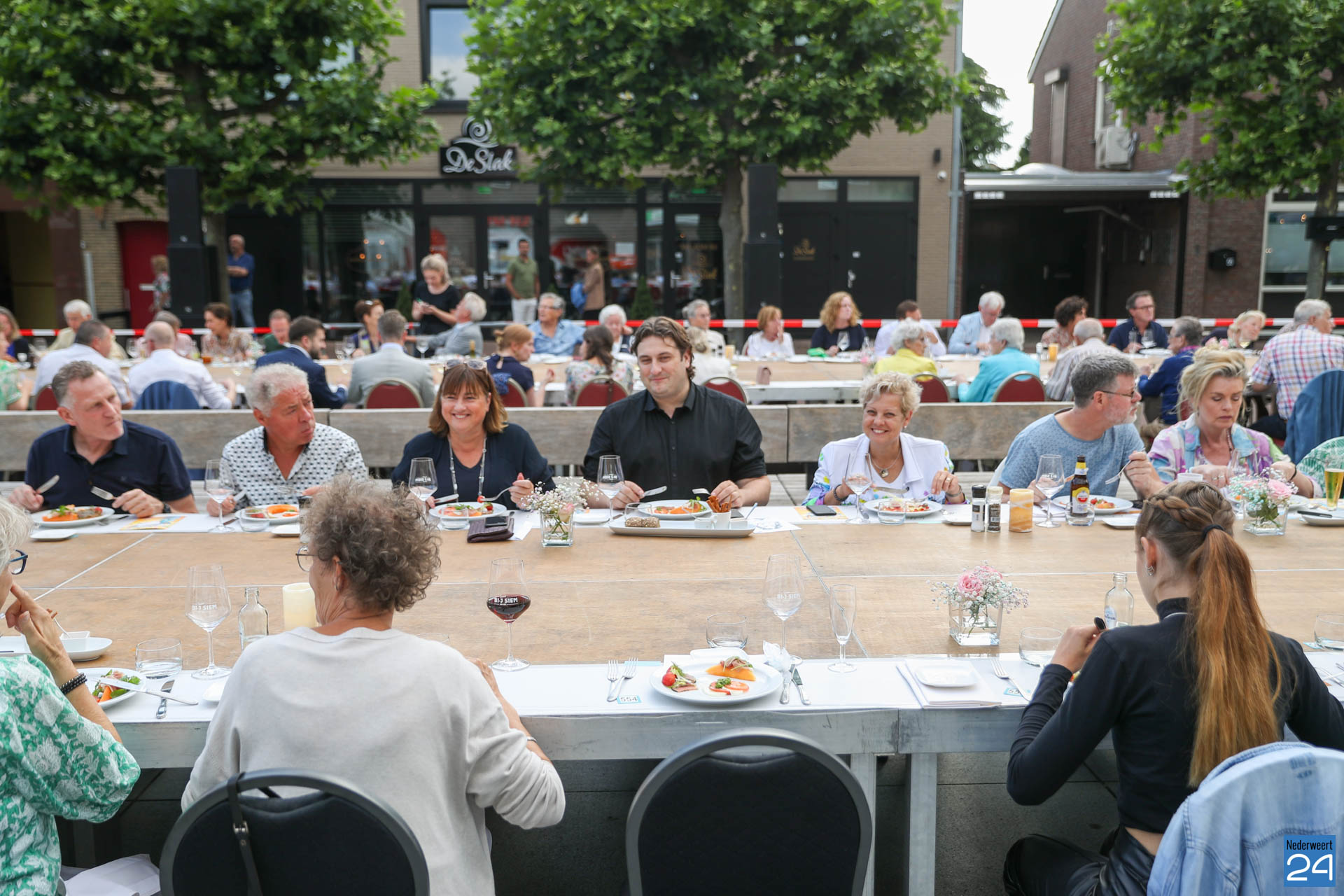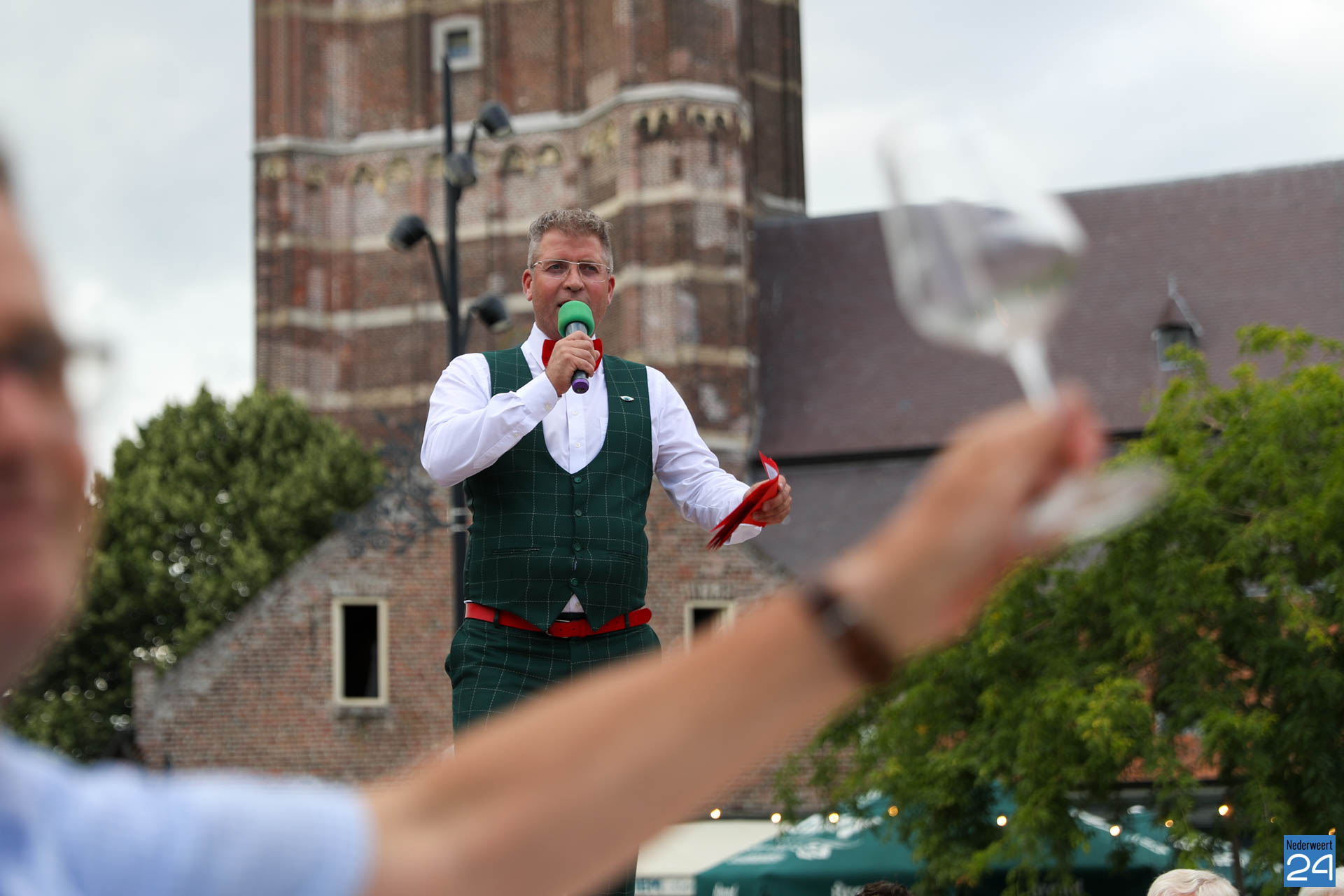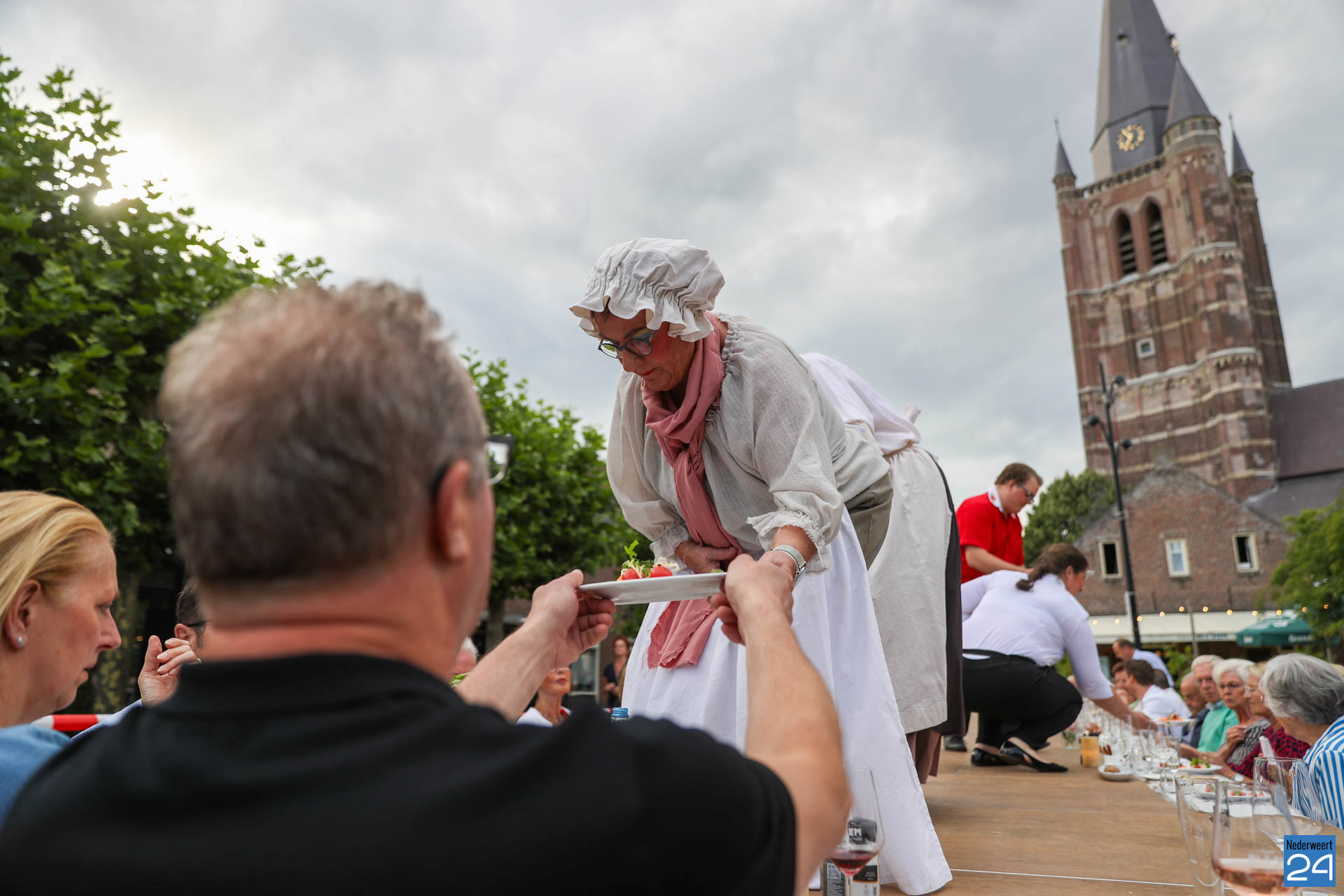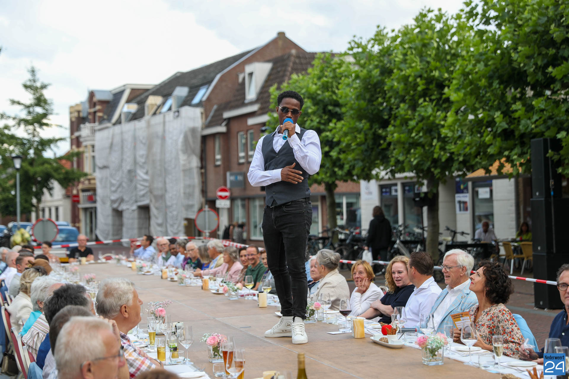 Zo’n 130 gasten schoven tijdens deze mooie zomeravond aan voor een heerlijk diner. Onder hen twee gedeputeerden van de Provincie Limburg: Jasper Kuntzelaers (o.a. Cultuur & Erfgoed) en Michael Theuns (o.a. Ruimte & Wonen). Zij werden welkom geheten door burgemeester Op de Laak. Tussen de dinergangen door werden de aanwezigen verwend met muzikale en theatrale optredens van verschillende gezelschappen. Rap, dans, klassiek en operazang, toneelspel en een karikatuurtekenaar. Het gebeurde allemaal op het Lambertushof. Veel applaus was er ook voor presentator Bjorn Smits die enkele malen voordroeg uit een verloren gewaand dagboek van de Lambertustoren.