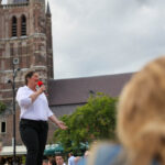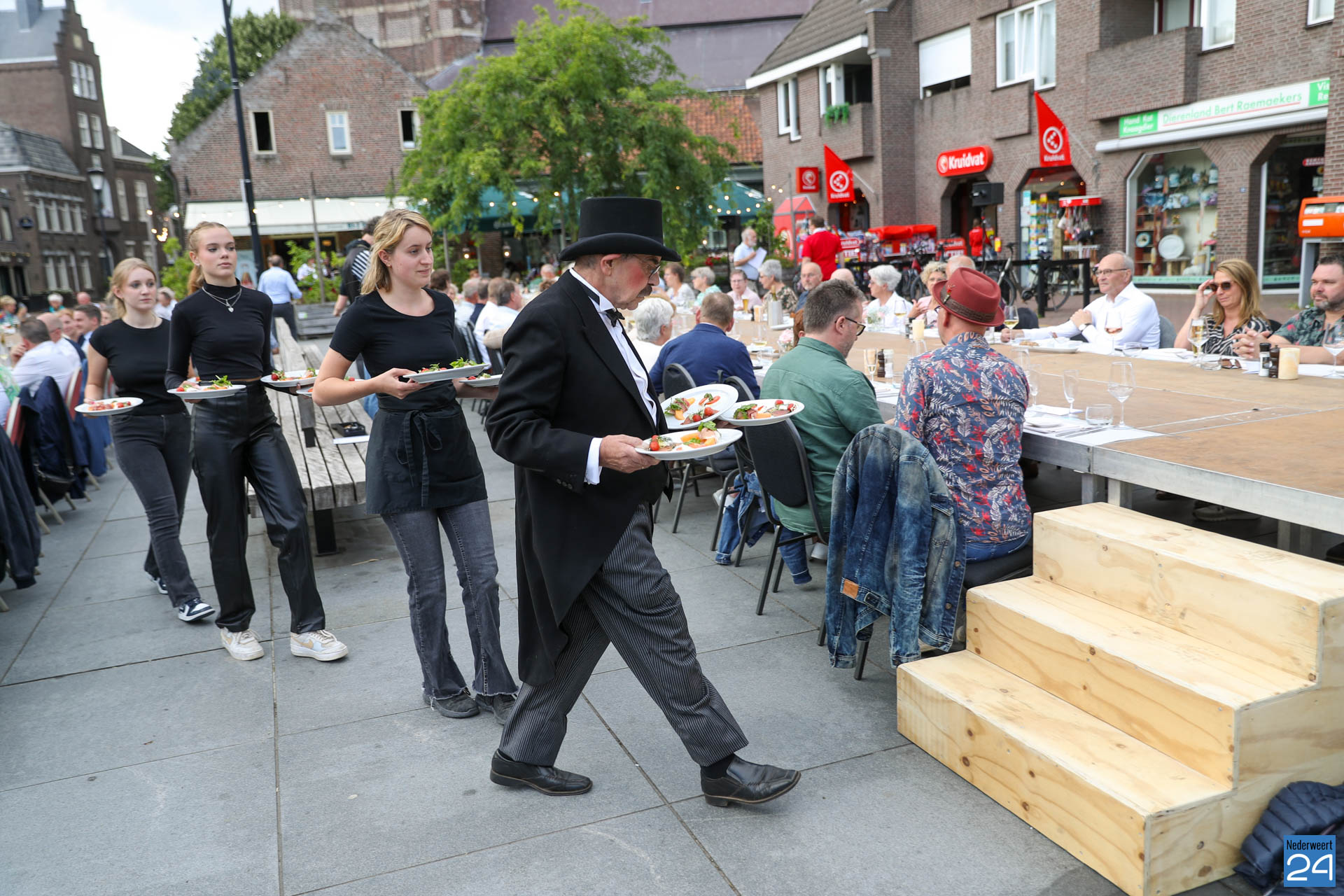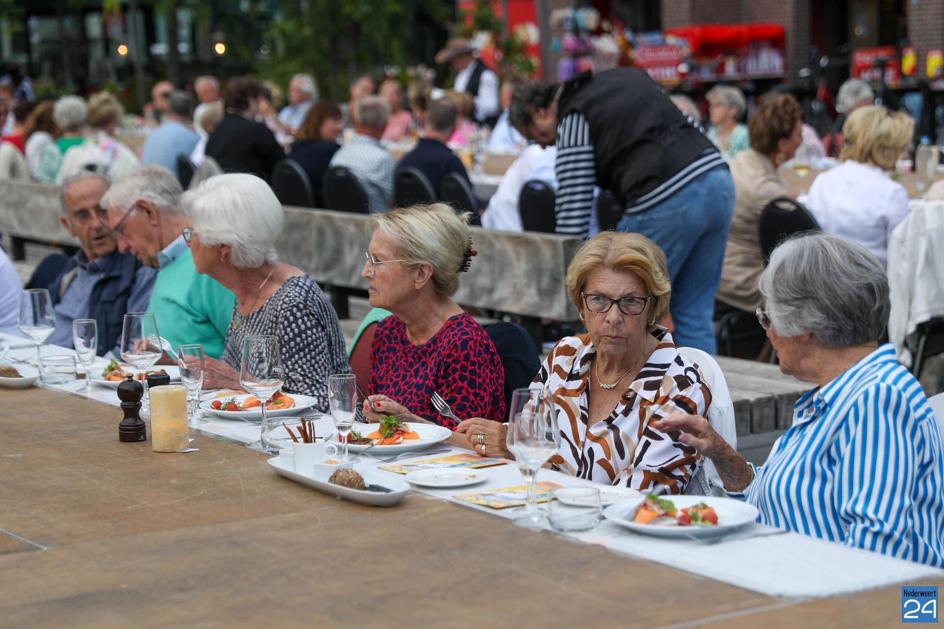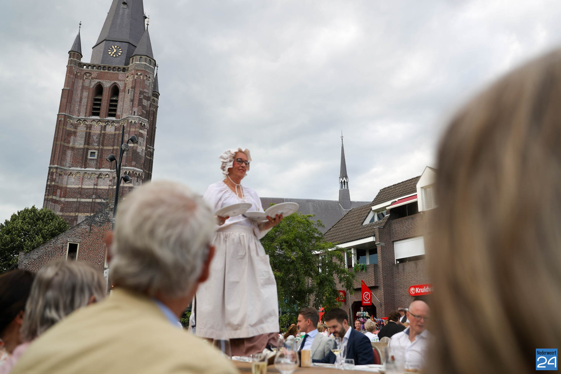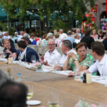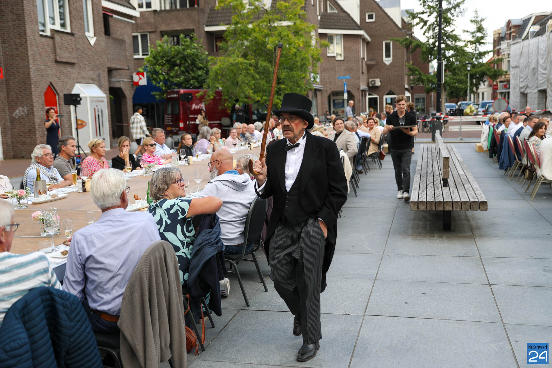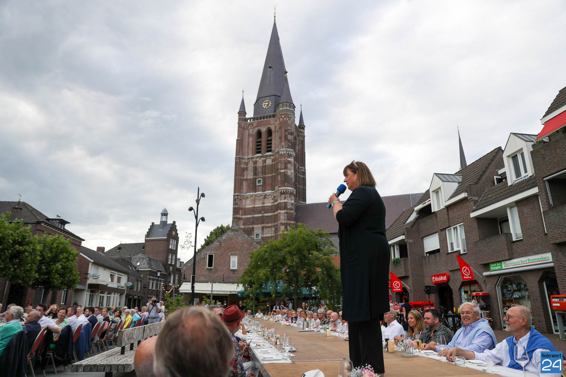 Zo’n 130 gasten schoven tijdens deze mooie zomeravond aan voor een heerlijk diner. Onder hen twee gedeputeerden van de Provincie Limburg: Jasper Kuntzelaers (o.a. Cultuur & Erfgoed) en Michael Theuns (o.a. Ruimte & Wonen). Zij werden welkom geheten door burgemeester Op de Laak. Tussen de dinergangen door werden de aanwezigen verwend met muzikale en theatrale optredens van verschillende gezelschappen. Rap, dans, klassiek en operazang, toneelspel en een karikatuurtekenaar. Het gebeurde allemaal op het Lambertushof. Veel applaus was er ook voor presentator Bjorn Smits die enkele malen voordroeg uit een verloren gewaand dagboek van de Lambertustoren.