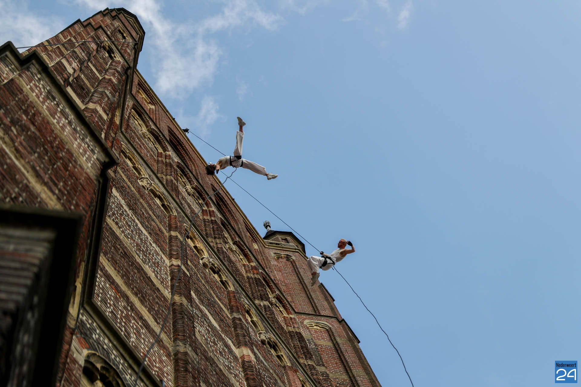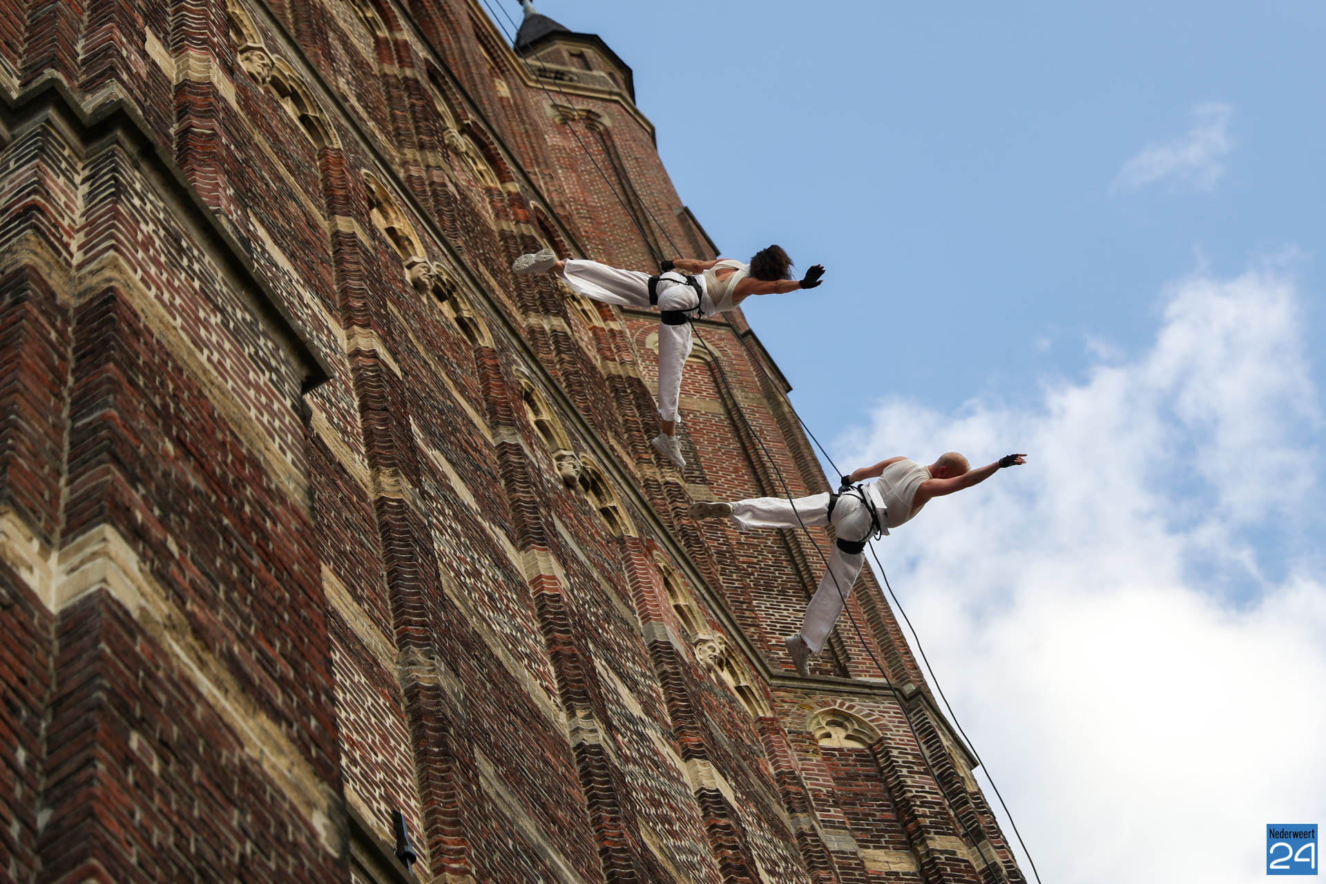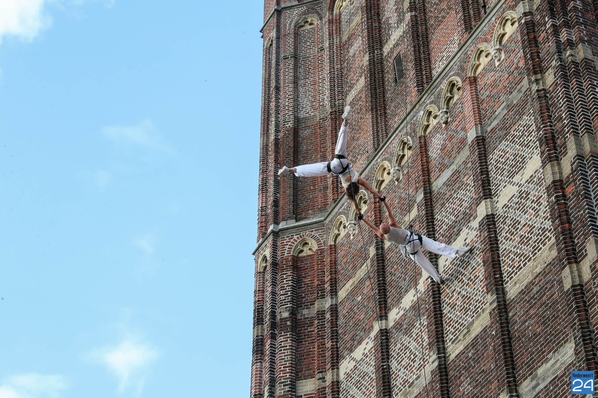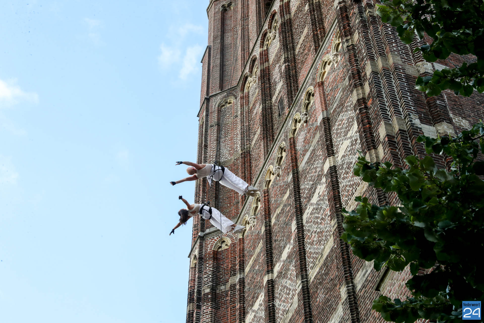 Indrukwekkend: acrobaten zweven op grote hoogte langs Lambertustoren