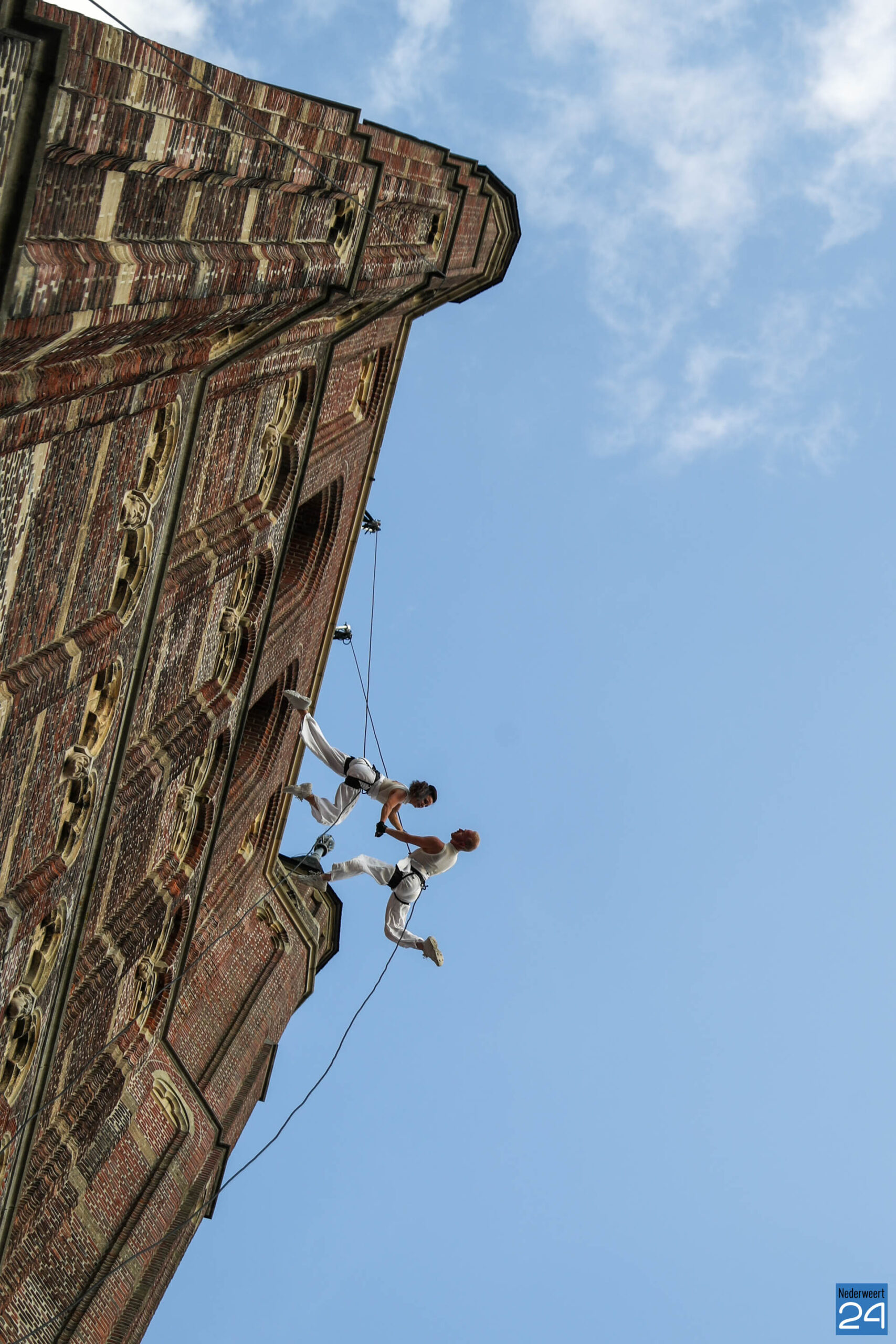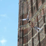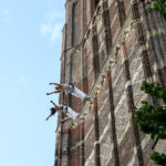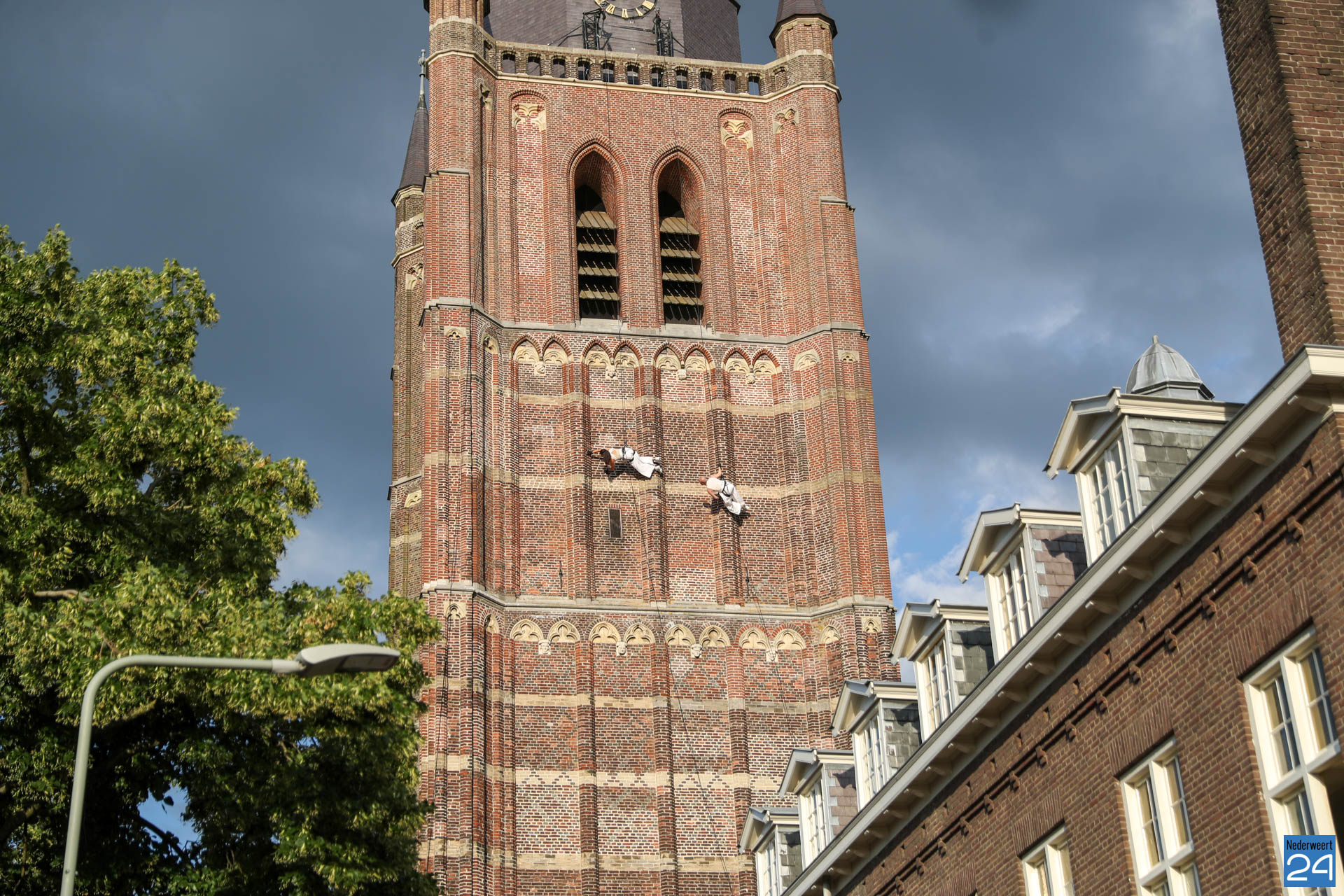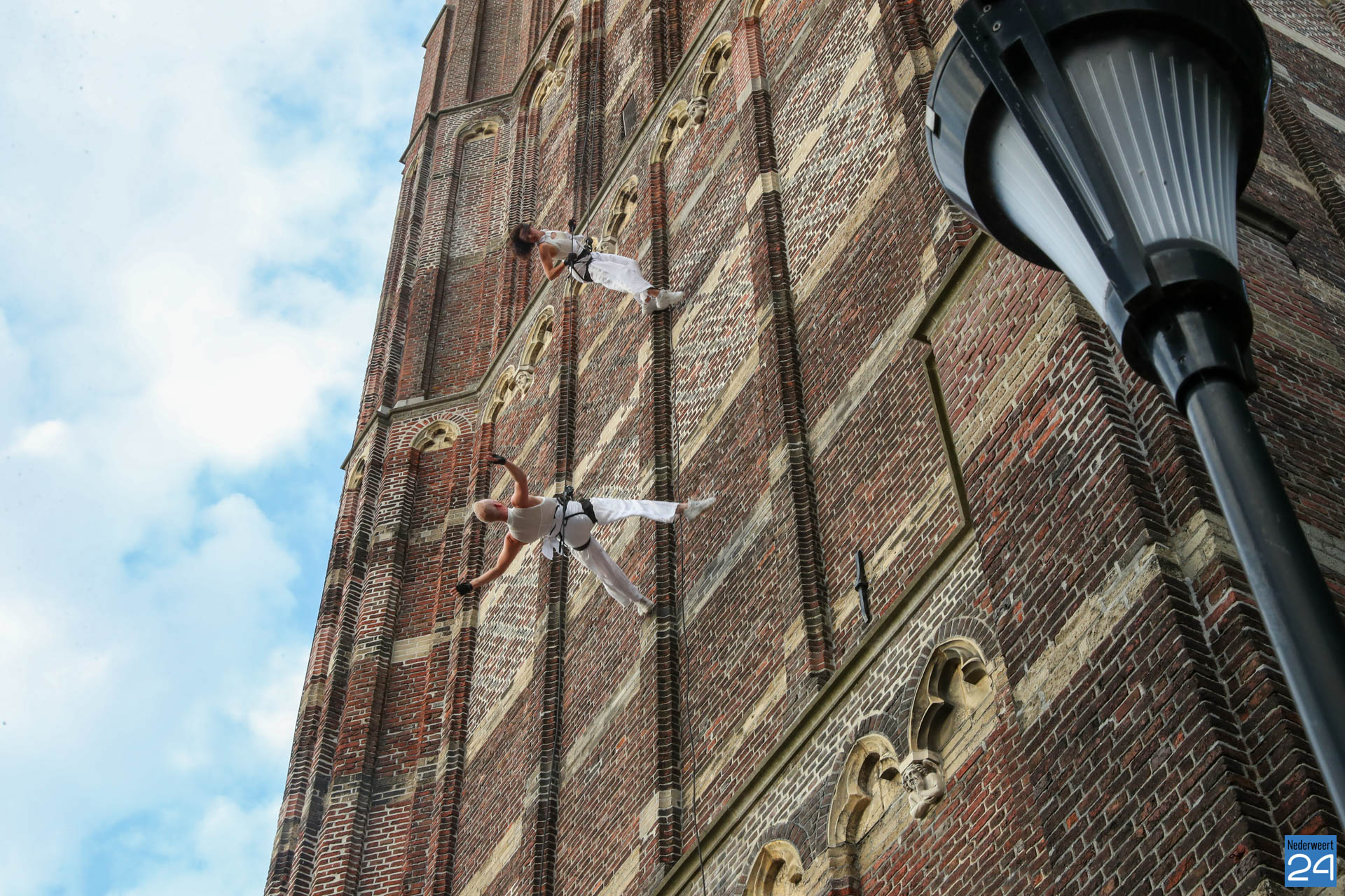 Indrukwekkend: acrobaten zweven op grote hoogte langs Lambertustoren