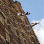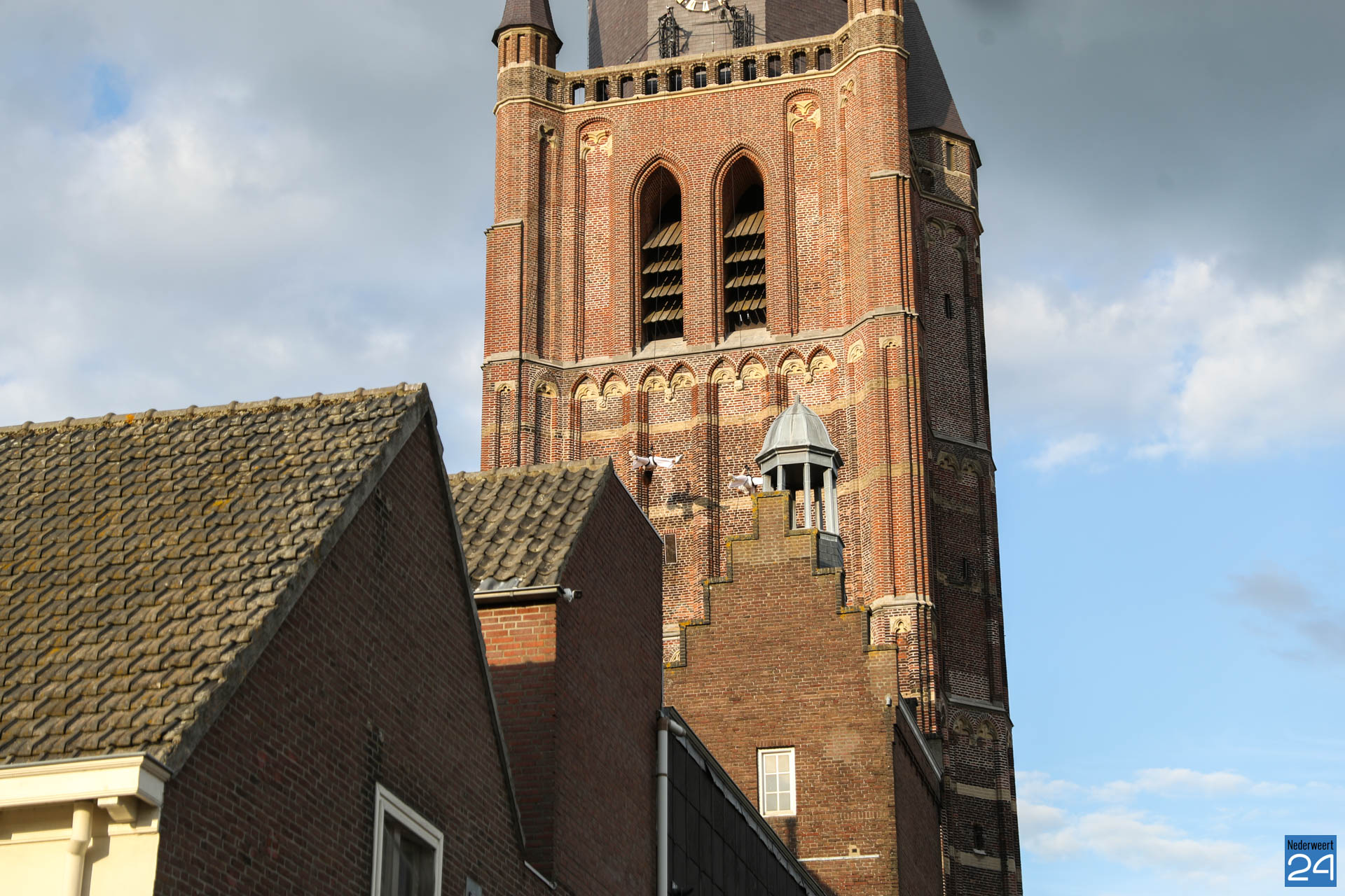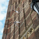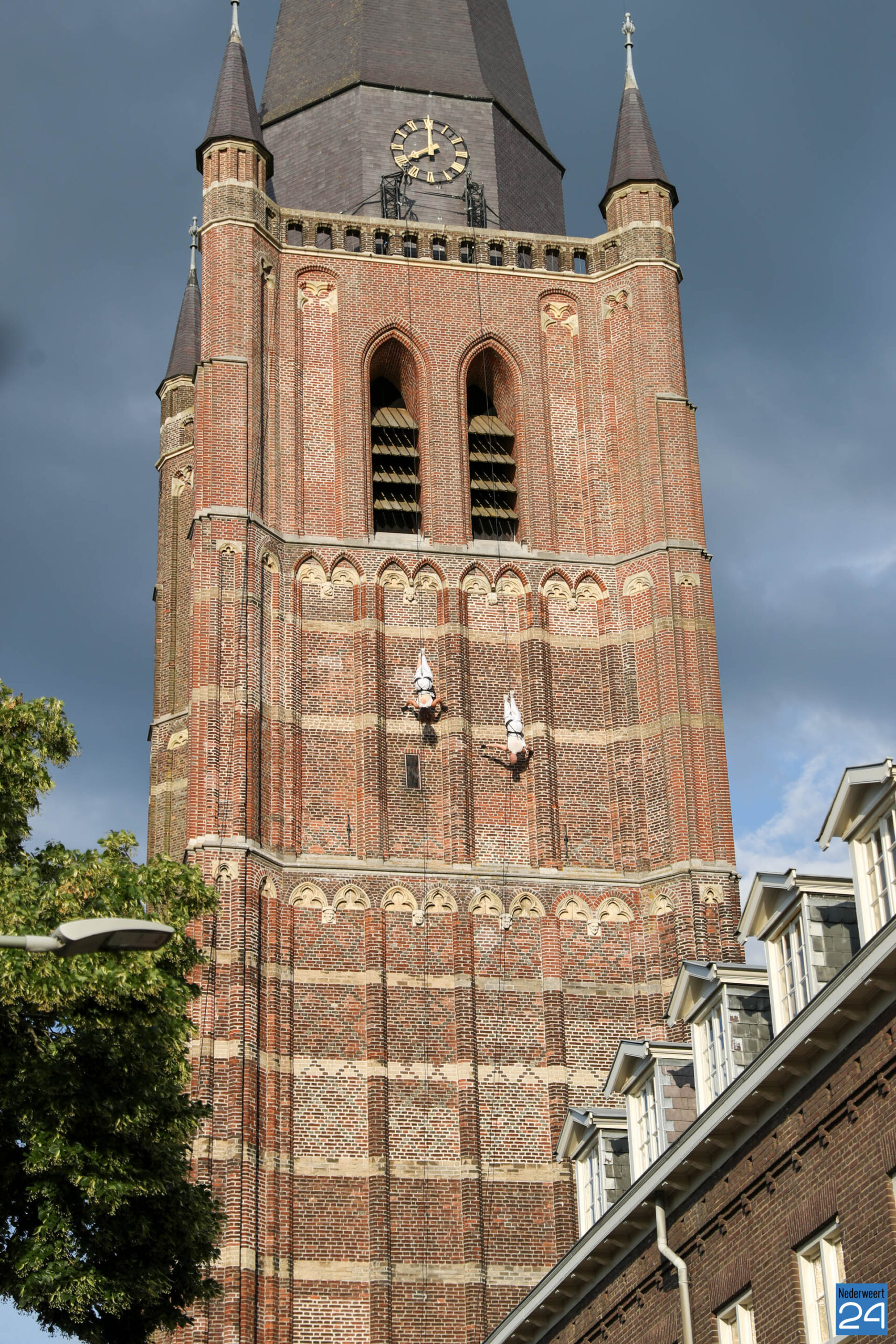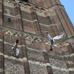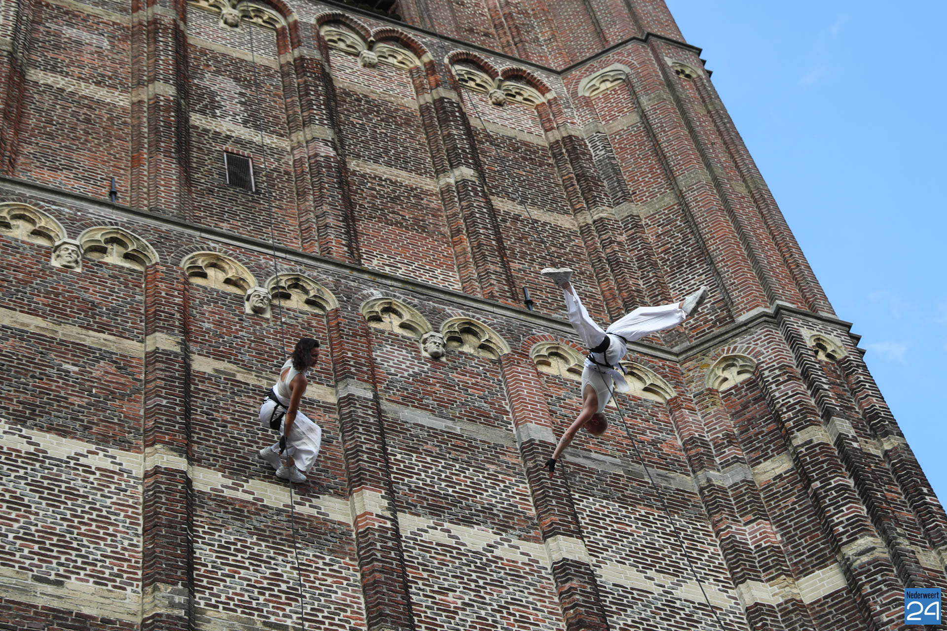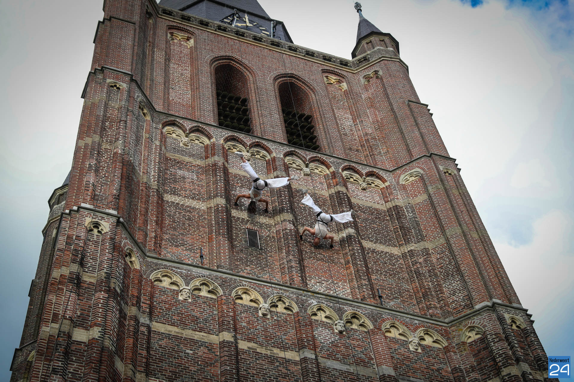 Indrukwekkend: acrobaten zweven op grote hoogte langs Lambertustoren