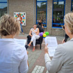 Juf José kwam aan in een prachtige cabrio en liep over de rode loper voor het laatst als juf de speelplaats op. Daar gaf ze de aftrap voor het inmiddels traditionele laatste-schooldag-ontbijt met de leerlingen, veel ouders, opa’s en oma’s, leerkrachten en vandaag ook de familie van juf José. Daarna volgden er creatieve en muzikale workshops gegeven door het Rick. En onze eigen juf José zag alle kinderen van de Bongerd nog één keer in haar klas. Tussendoor was er bezoek van oud-collega’s. Tijdens het speelkwartier genoten de kinderen van een heerlijk ijsje van Florence. Aan het einde van de ochtend werd José nogmaals in het zonnetje gezet en toegezongen. Daarna luidde ze voor het allerlaatst de schoolbel en is de vakantie begonnen.