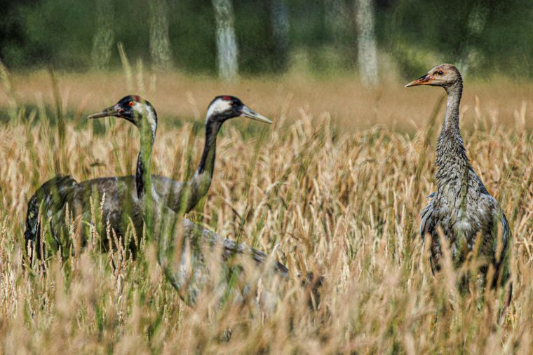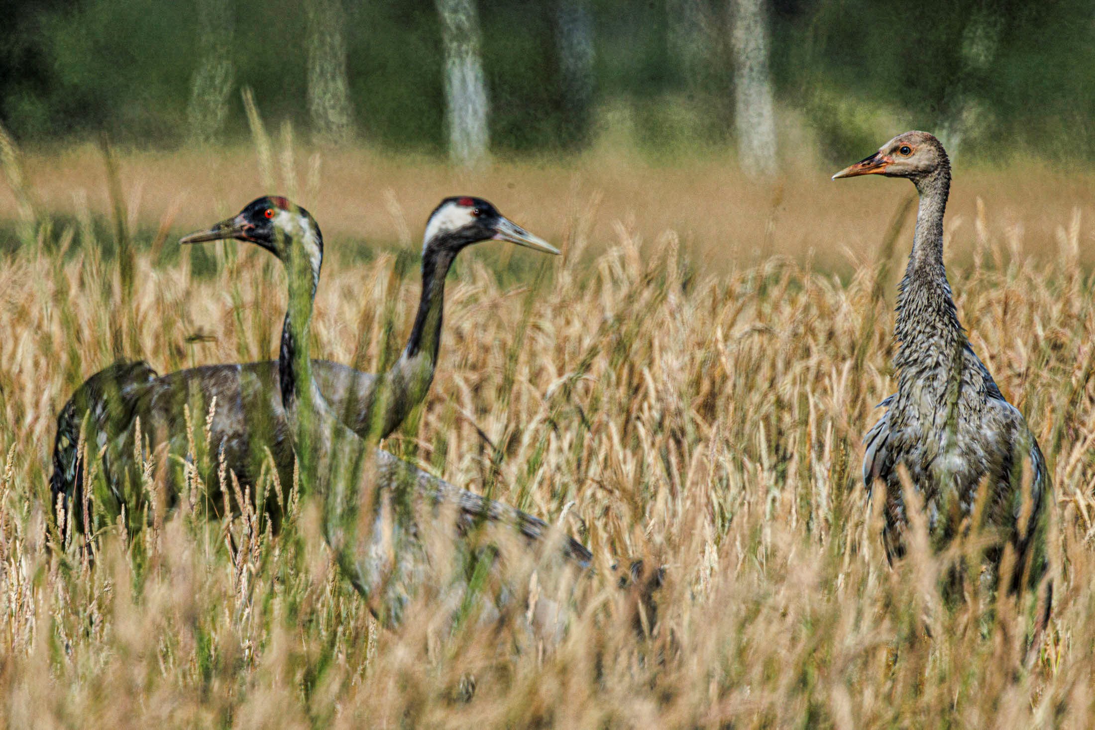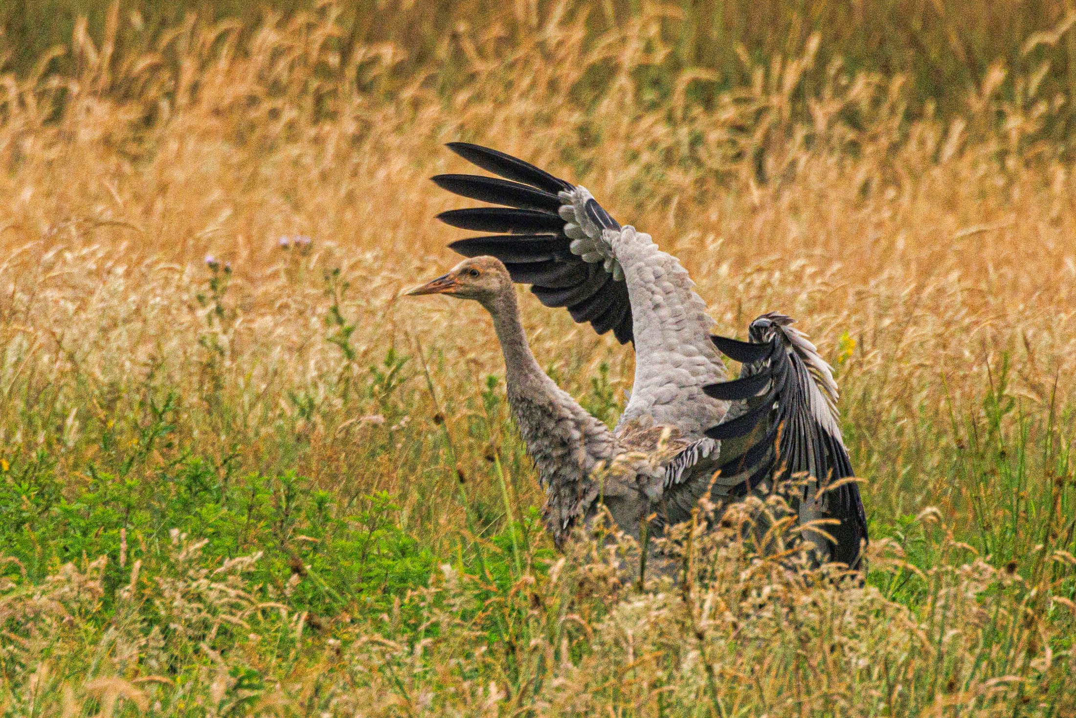 Anders dan in 2022 leken deze kraanvogels niet gebonden te zijn aan een vaste voedselplek. De familie werd daarom afgelopen weken ook slechts af en toe gezien, maar daarbij bleek wel dat het kuiken voorspoedig opgroeide. De afgelopen weken wordt de familie steeds vaker op verschillende plekken gesignaleerd; het kuiken is al zo groot als de ouders en heeft volledig uitgegroeide vleugelveren. Het mist alleen nog de markante zwart/wit tekening aan kop en hals.