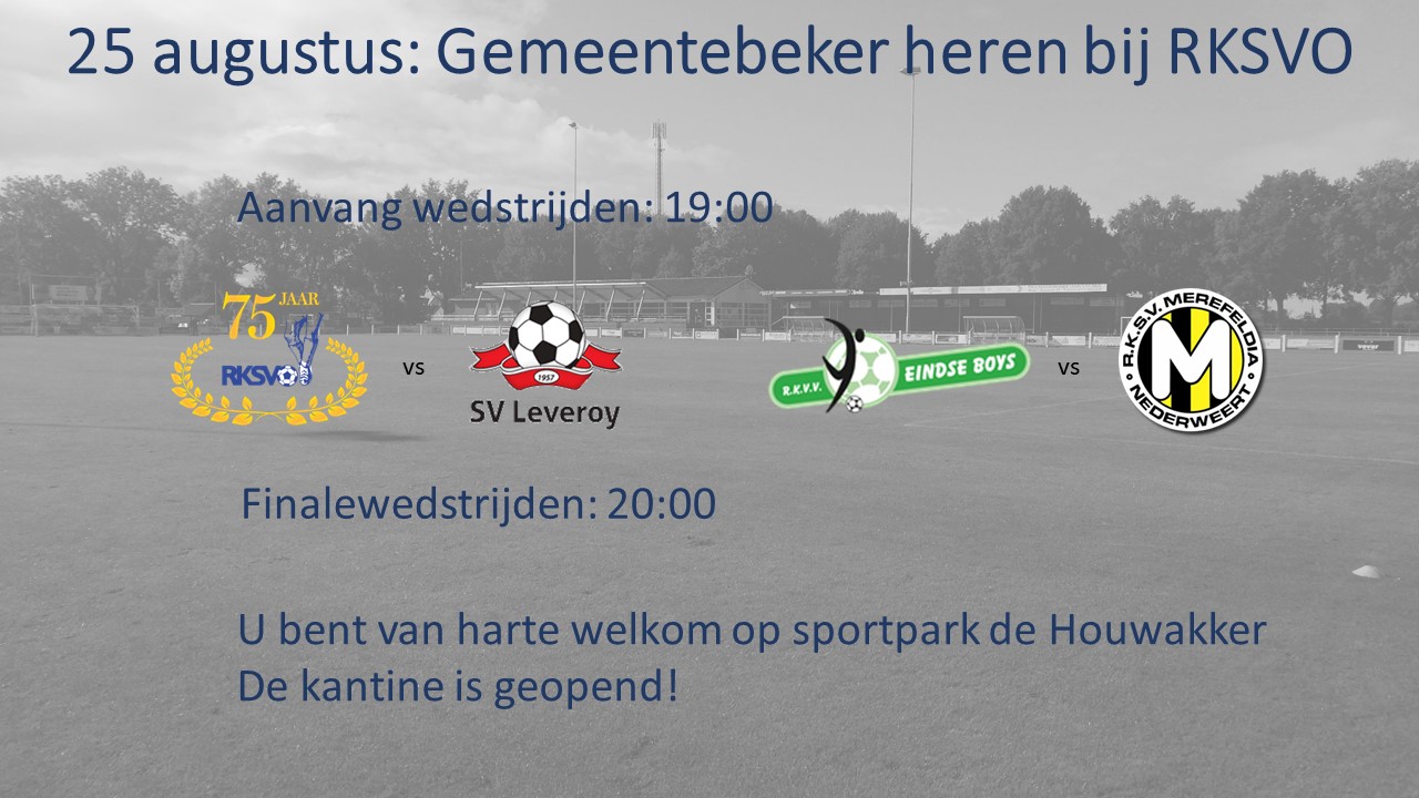 Op vrijdag 25 augustus vindt de gemeentebeker voor de heren plaats op sportpark de Houwakker te Ospel. S.V. Leveroy, Eindse Boys, R.K.S.V. Merefeldia en R.K.S.V.O. Ospel zullen onderling strijden wie aan het eind van de avond de beker mee naar huis neemt.