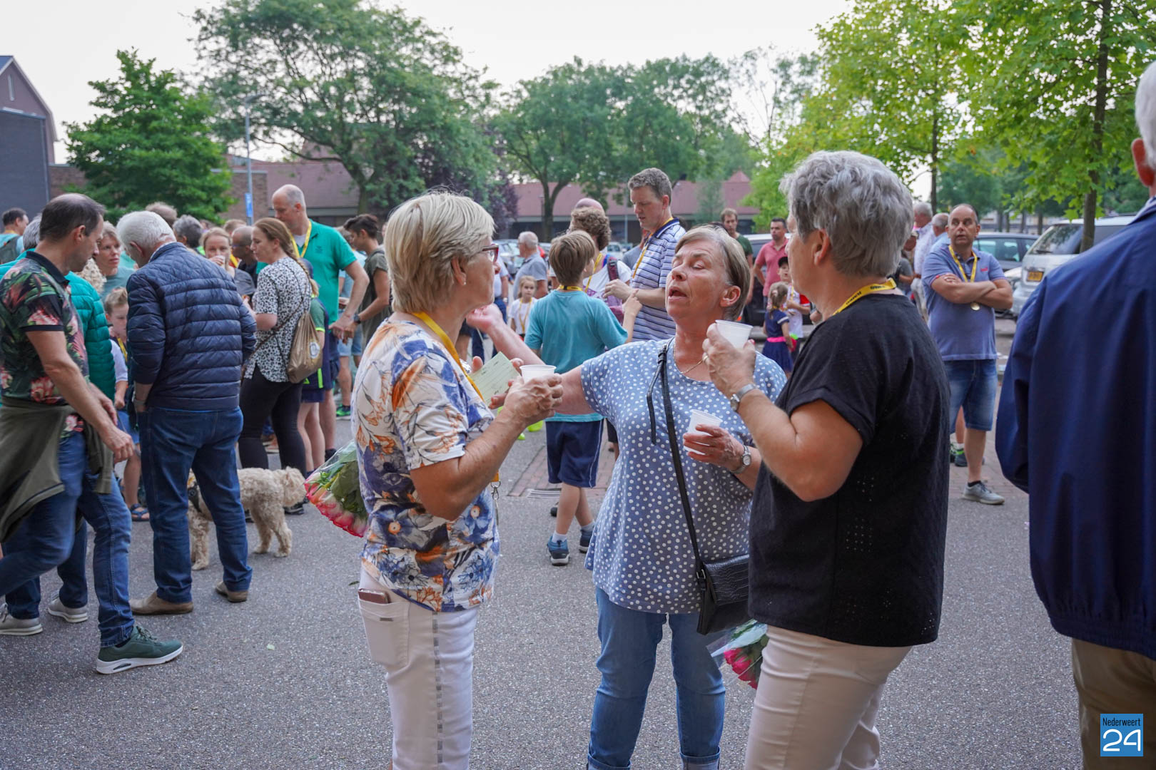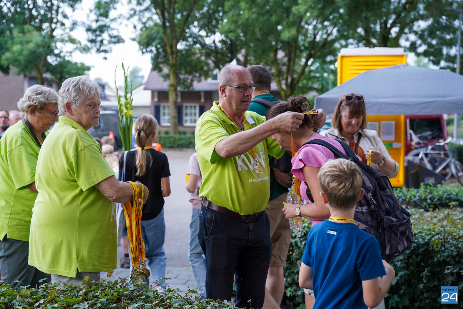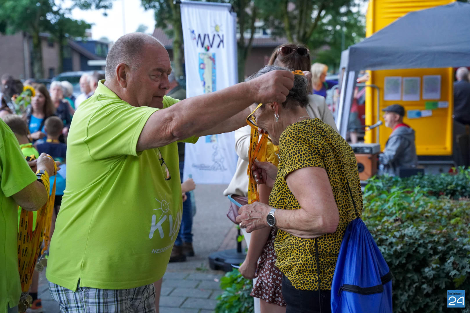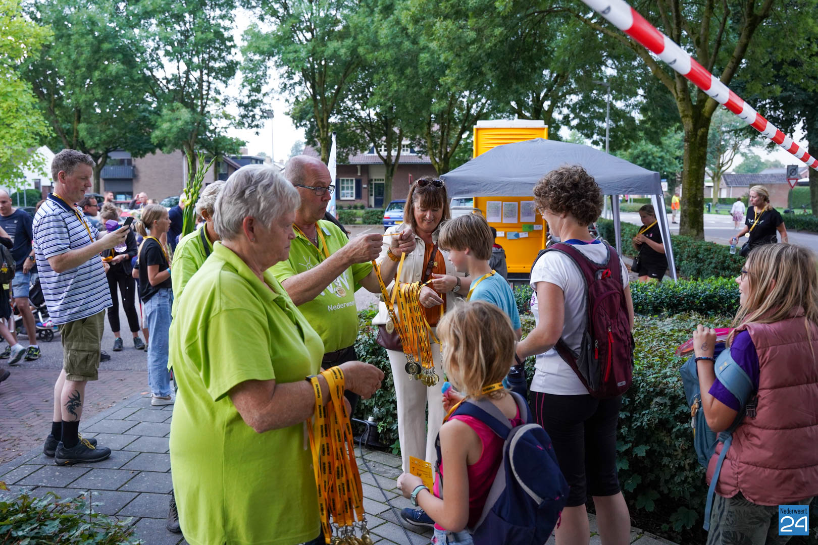 Maandag gaven zo’n 500 actieve wandelaars zich op om mee te lopen tijdens de vier avonden. Vanavond werden ze vrolijk onthaald door het team van KVW Nederweert en Burgemeester Op de Laak. Samen deelden ze eremedailles uit aan de deelnemers. Erik Duret zorgde voor de muzikale invulling. Ondanks een paar enkele druppeltjes regen, was het een gezellige bijeenkomst van wandelaars.