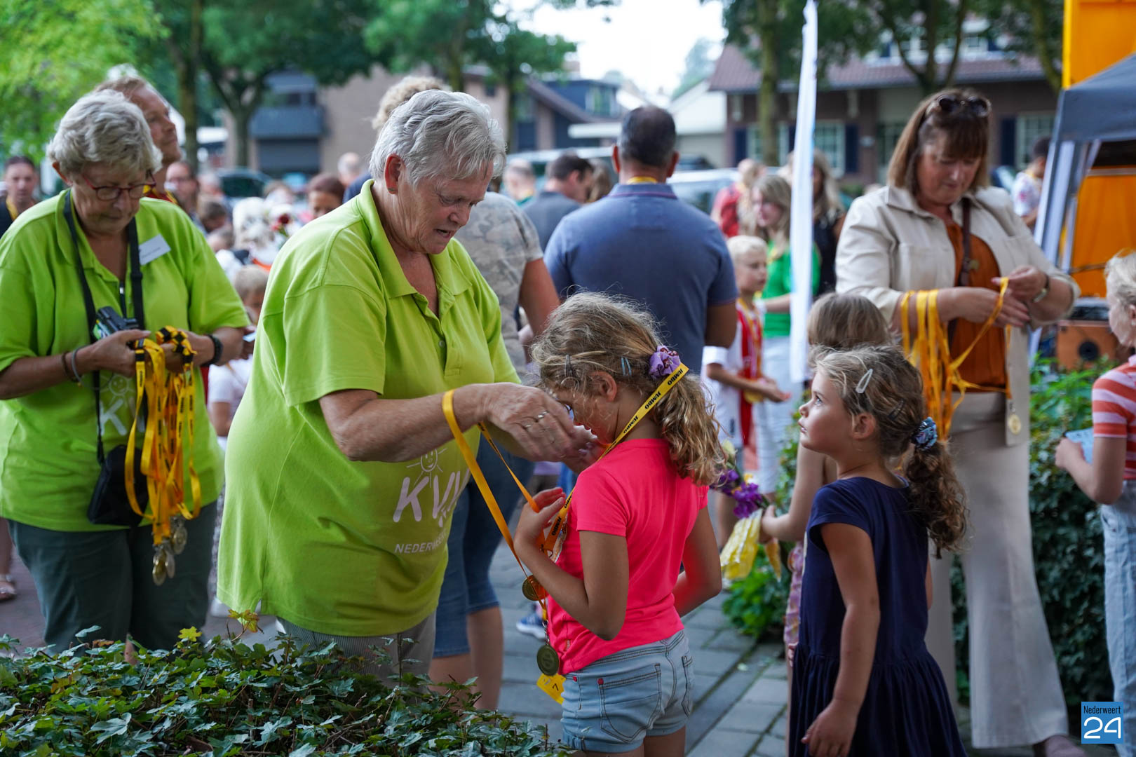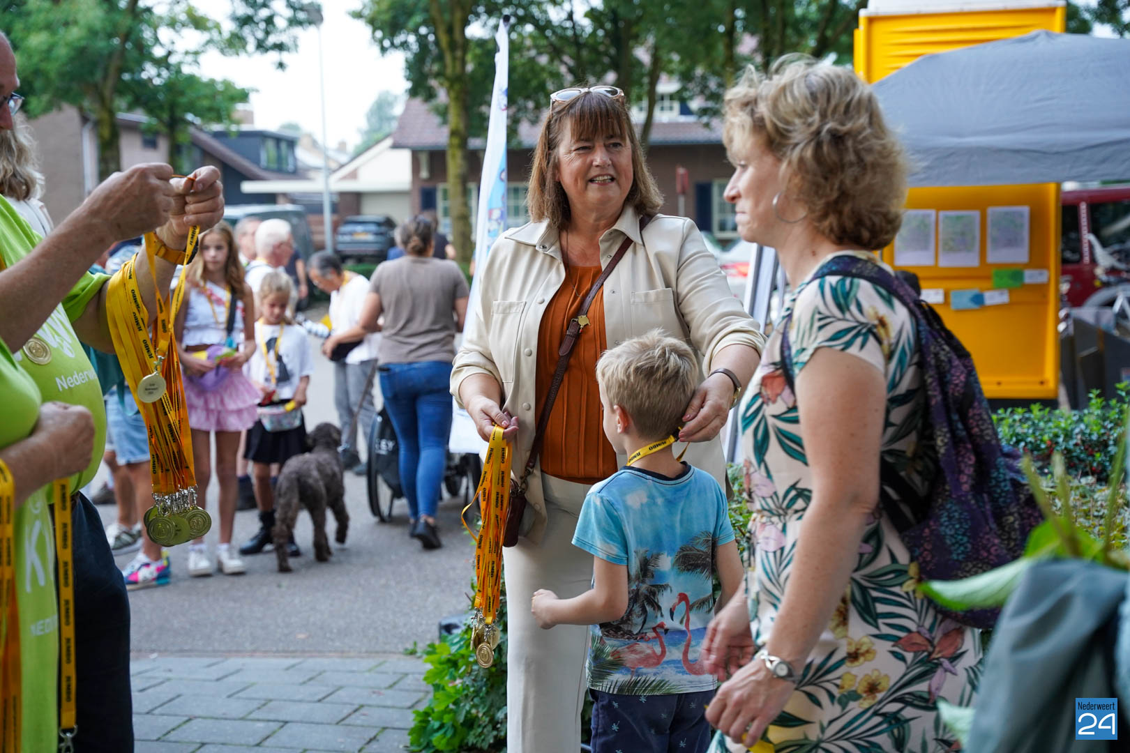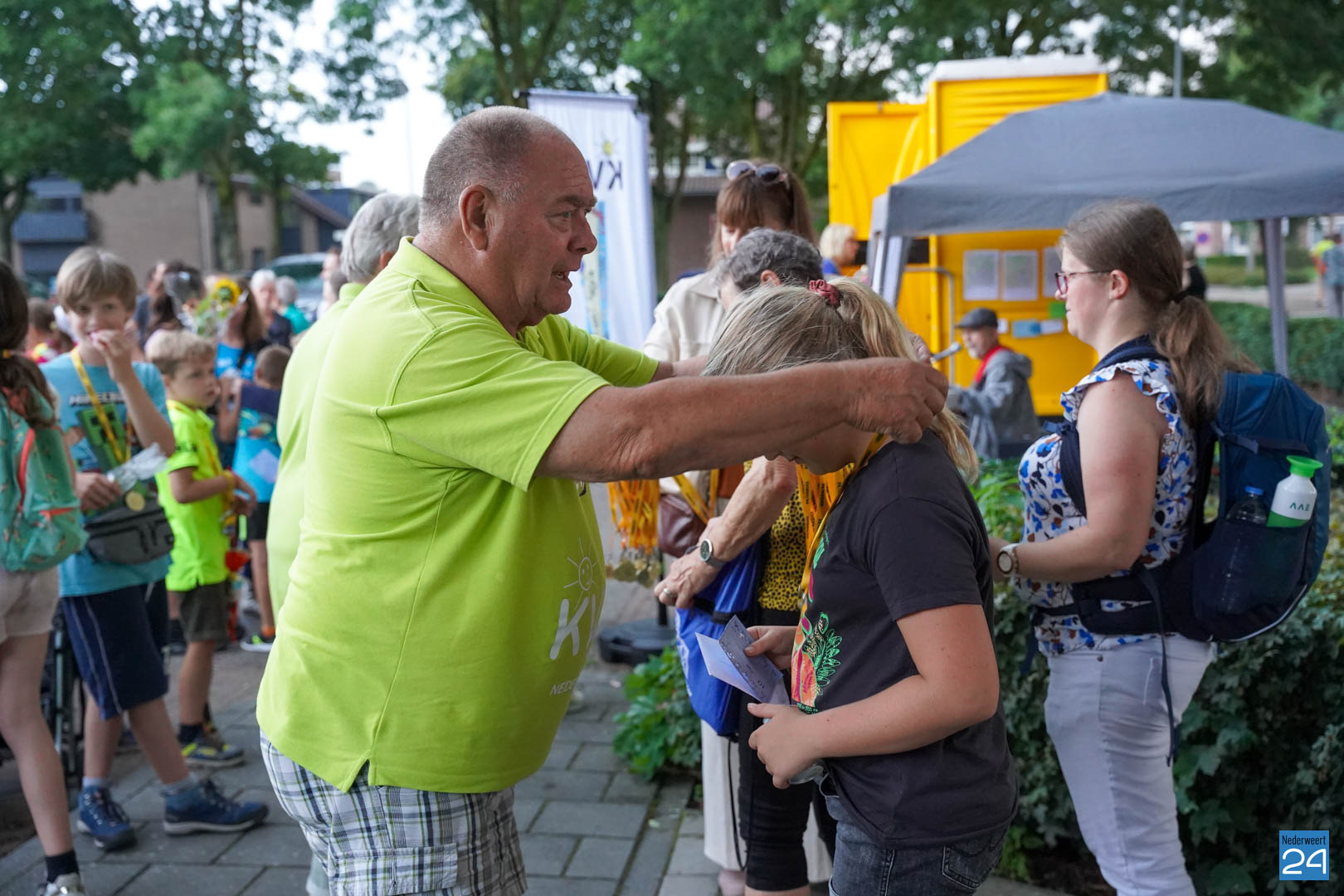 Maandag gaven zo’n 500 actieve wandelaars zich op om mee te lopen tijdens de vier avonden. Vanavond werden ze vrolijk onthaald door het team van KVW Nederweert en Burgemeester Op de Laak. Samen deelden ze eremedailles uit aan de deelnemers. Erik Duret zorgde voor de muzikale invulling. Ondanks een paar enkele druppeltjes regen, was het een gezellige bijeenkomst van wandelaars.