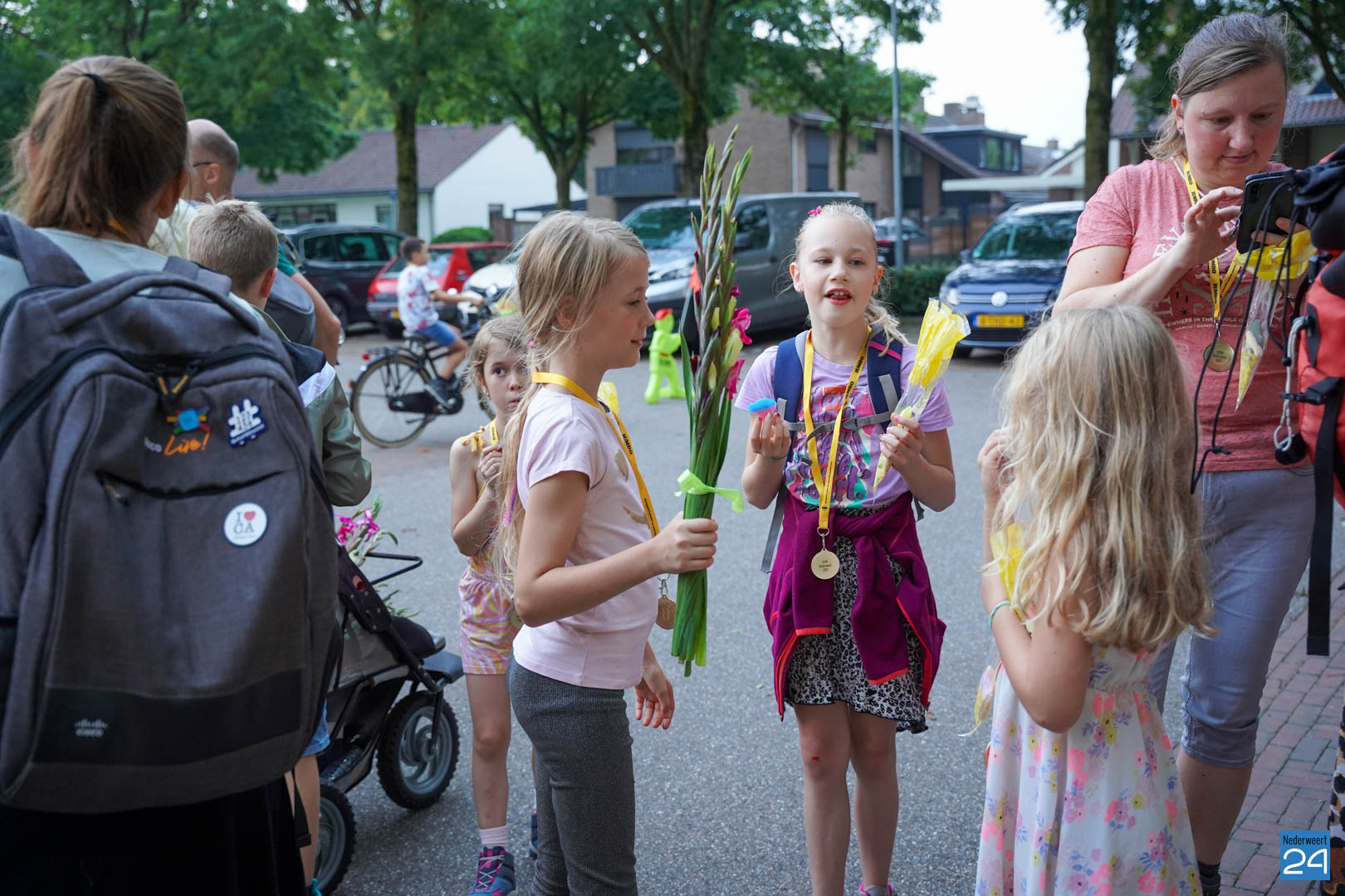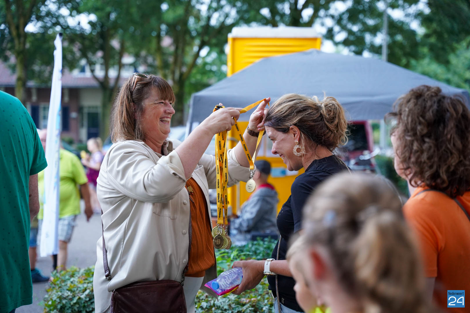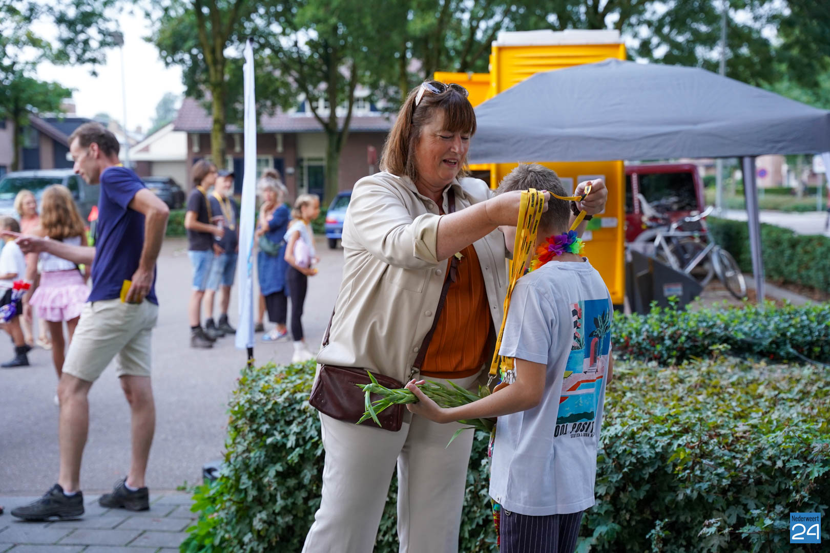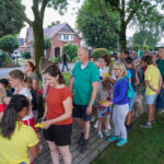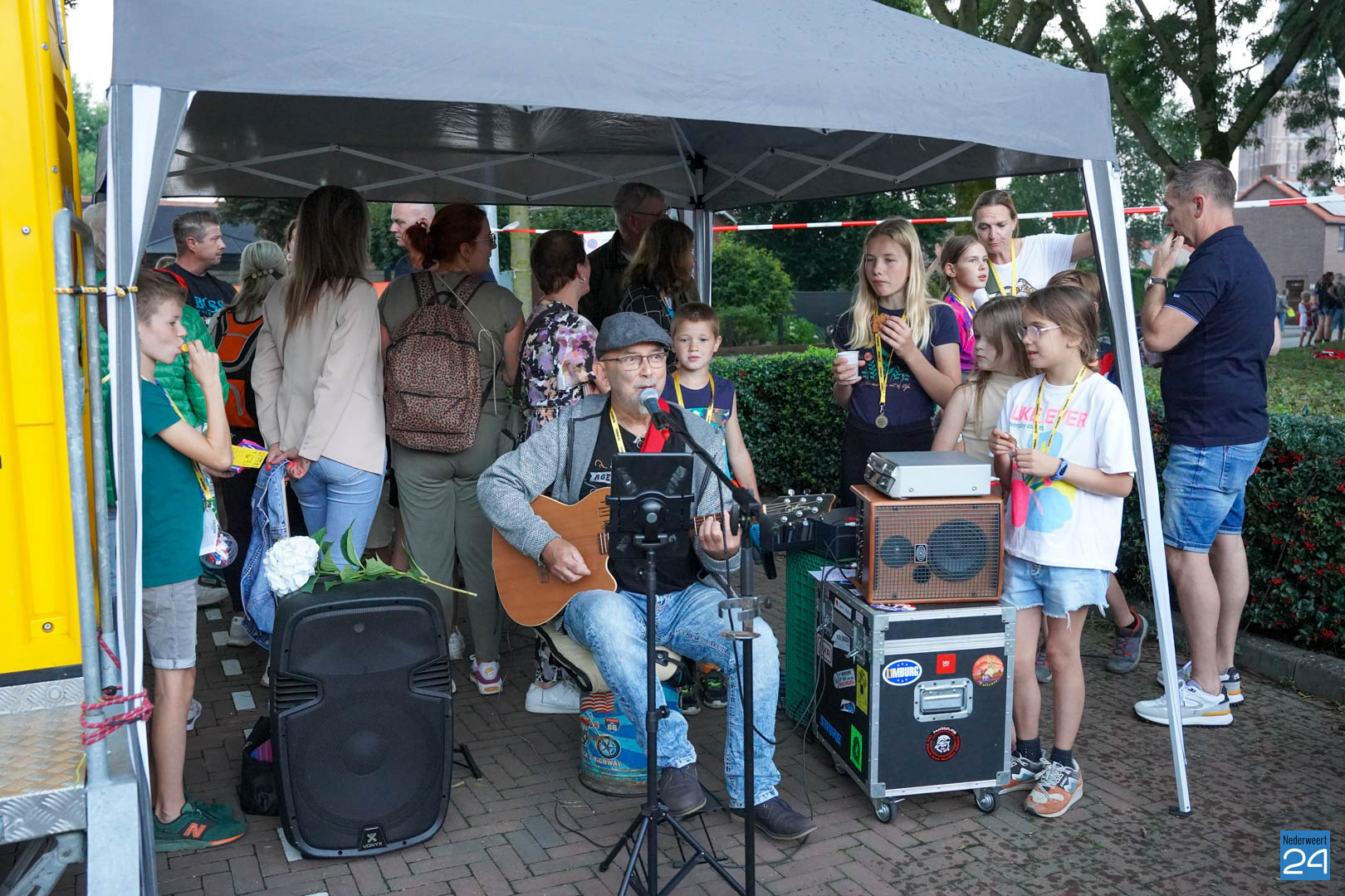 Maandag gaven zo’n 500 actieve wandelaars zich op om mee te lopen tijdens de vier avonden. Vanavond werden ze vrolijk onthaald door het team van KVW Nederweert en Burgemeester Op de Laak. Samen deelden ze eremedailles uit aan de deelnemers. Erik Duret zorgde voor de muzikale invulling. Ondanks een paar enkele druppeltjes regen, was het een gezellige bijeenkomst van wandelaars.