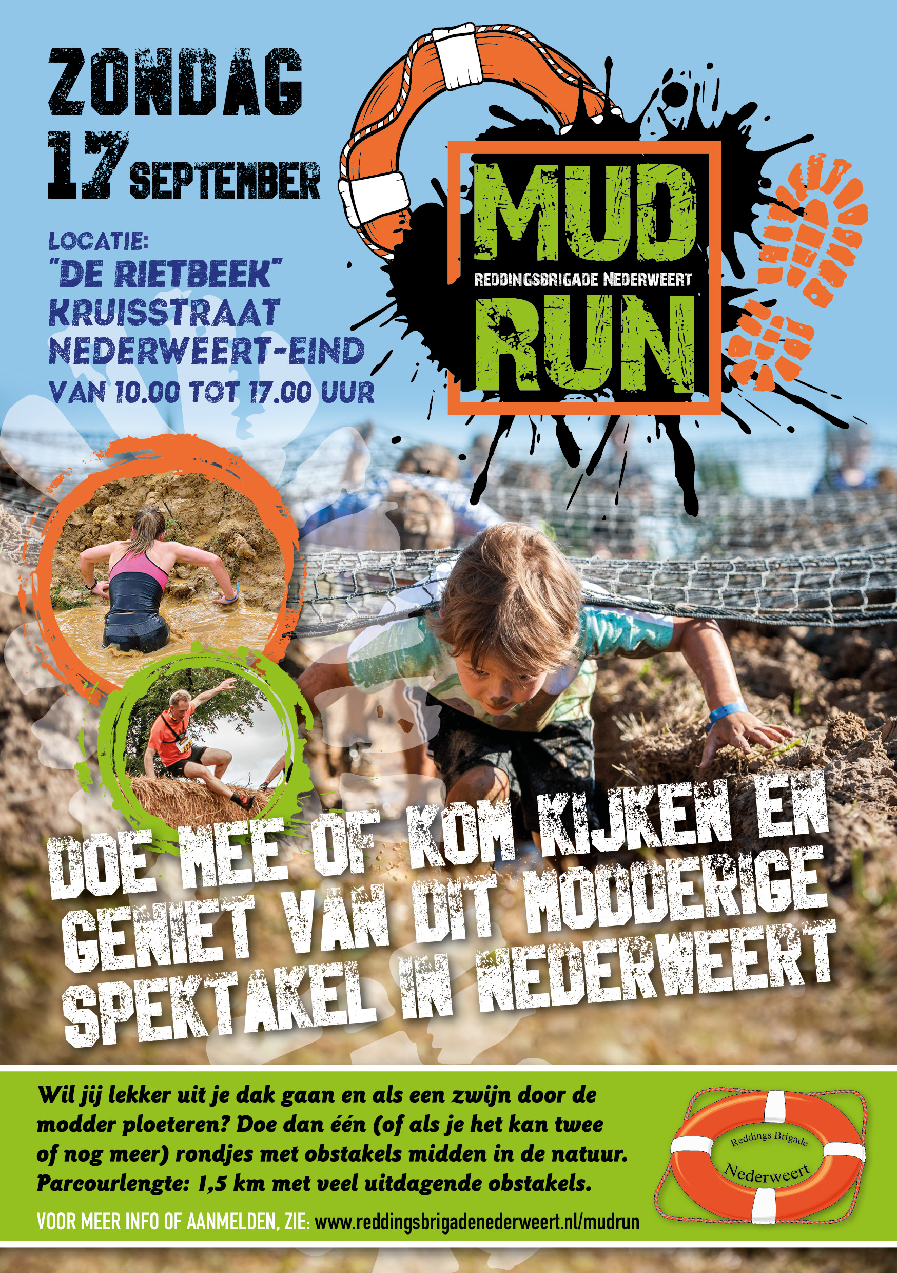 De Mudrun wordt georganiseerd door Reddingsbrigade Nederweert op zondag 17 september van 10:00 tot 17:00 uur. Het parcours zal ongeveer 1,5 kilometer lang zijn en zal ongeveer 30 hindernissen bevatten. Je kunt het parcours meerdere keren lopen of rennen, afhankelijk van je leeftijd, het aantal inschrijvingen en de weersomstandigheden. Na de finish is er een mogelijkheid om je af te spoelen. Let wel even op, in het natuurgebied is geen shampoo toegestaan. Gezellig nog even napraten onder het genot van een hapje en drankje is mogelijk.