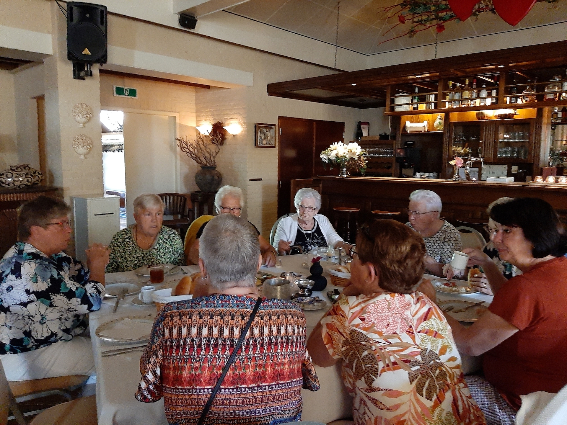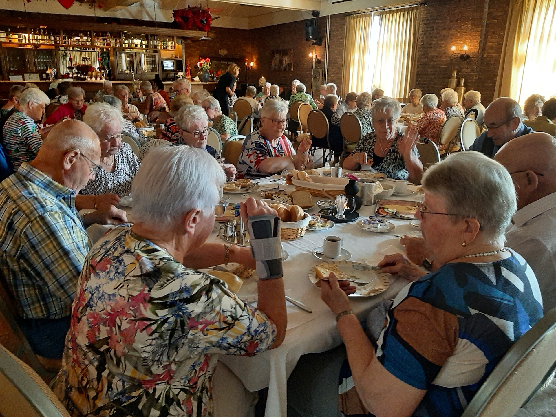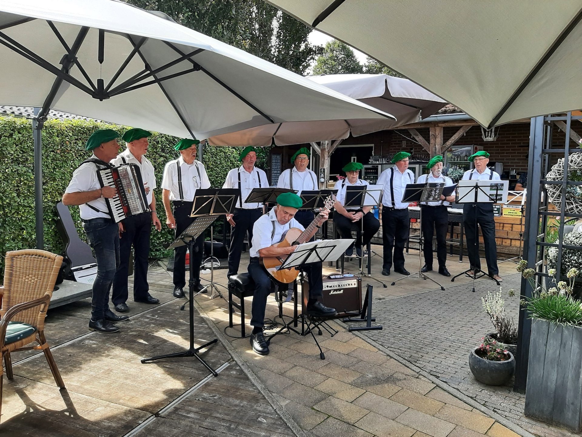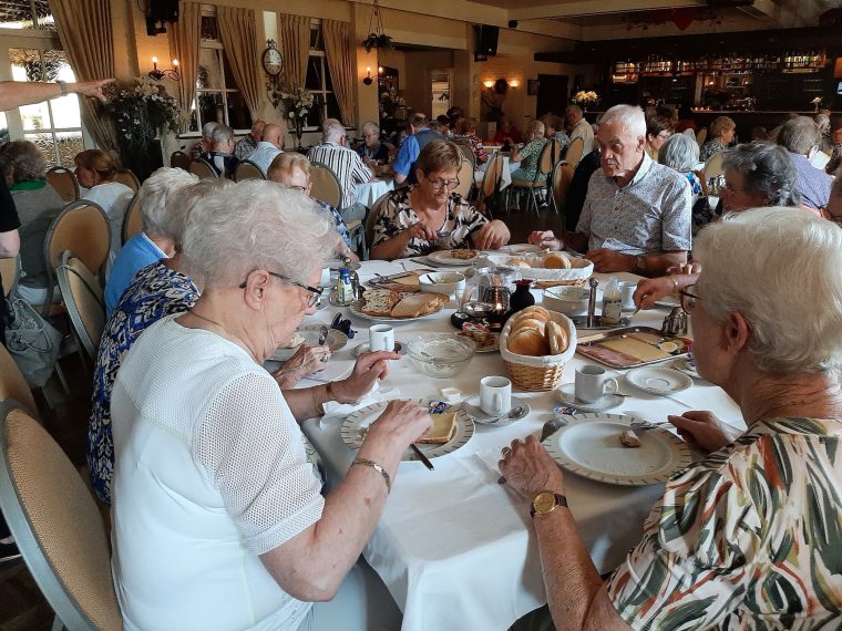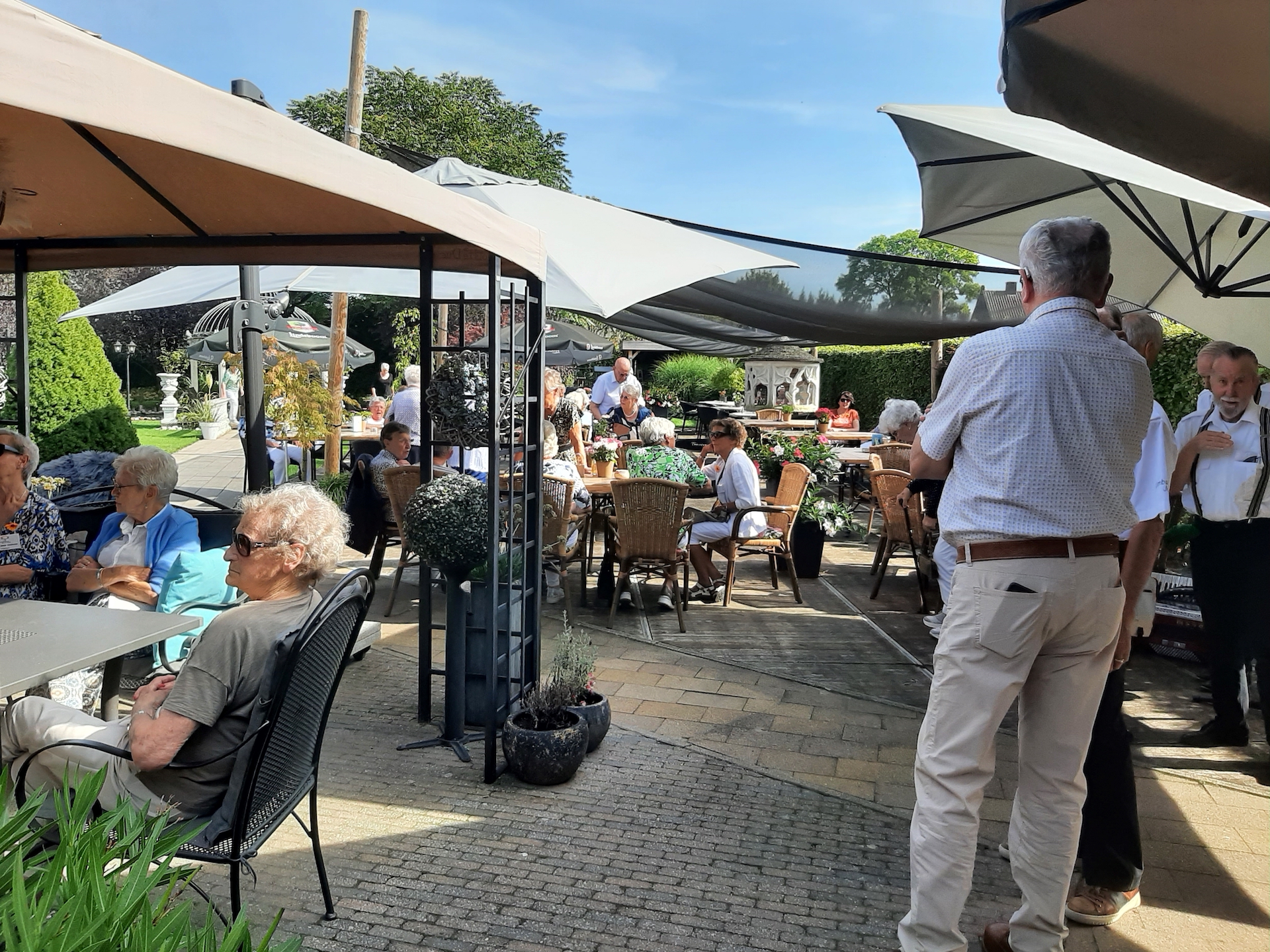 Na de laatste activiteit in juli jl. was de lunch voor vele aanwezigen vooral weer een mooie gelegenheid om te babbelen en bij te kletsen, maar ook om te genieten van een prima verzorgde lunch. Na deze lunch begaf het gezelschap zich naar het terras en de prachtige tuin bij de locatie, in afwachting van het muzikale gedeelte in het programma. Ditmaal was de kleurrijke dialectgroep Limburgse Jongens uitgenodigd om een optreden te verzorgen. Ondanks dat de groep niet geheel compleet was brachten zij mooie liederen van o.a. Benny Nijman, Thei en Marij en Sjef Diederen over het limburgse leven ten gehore. Maar ook “eigen teksten” ontbraken niet in hun repertoire. Leuke verrassing was, dat de bandleider bij het laatste nummer: Un Böske bloome, een van de aanwezige verblijde met een mooi boeketje verse bloemen. De groep bracht een feestelijke sfeer op deze dag.