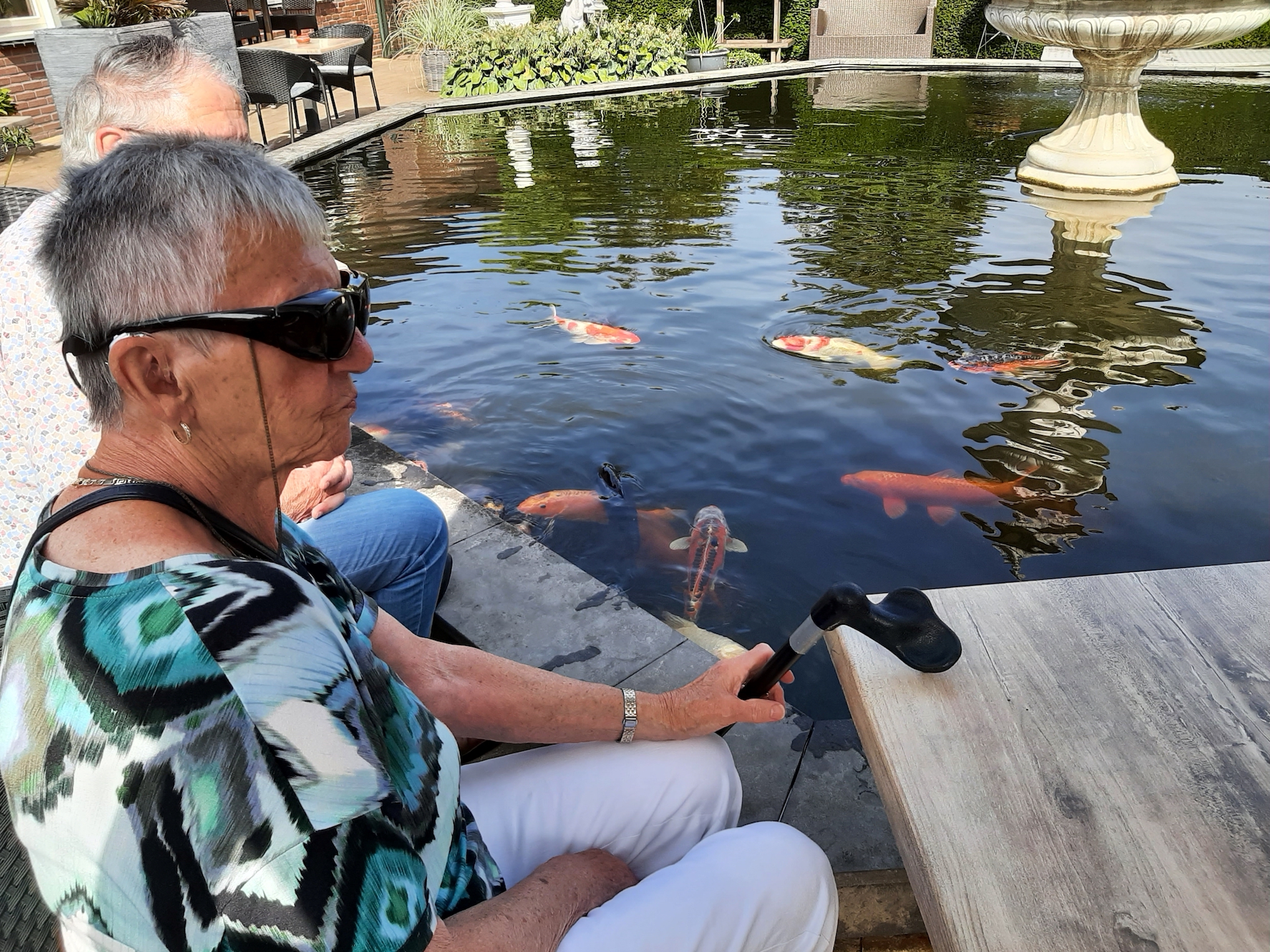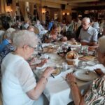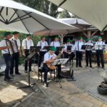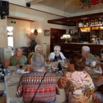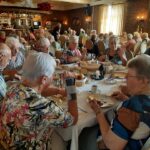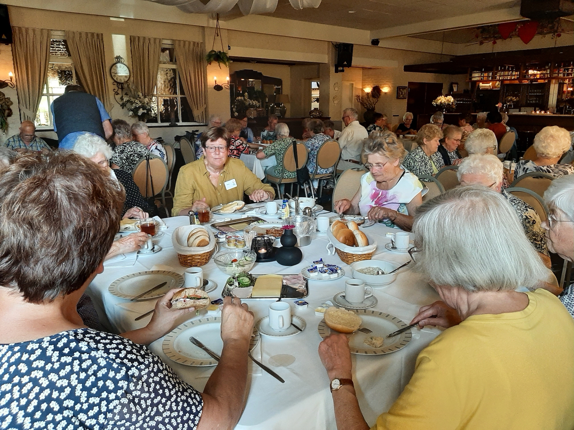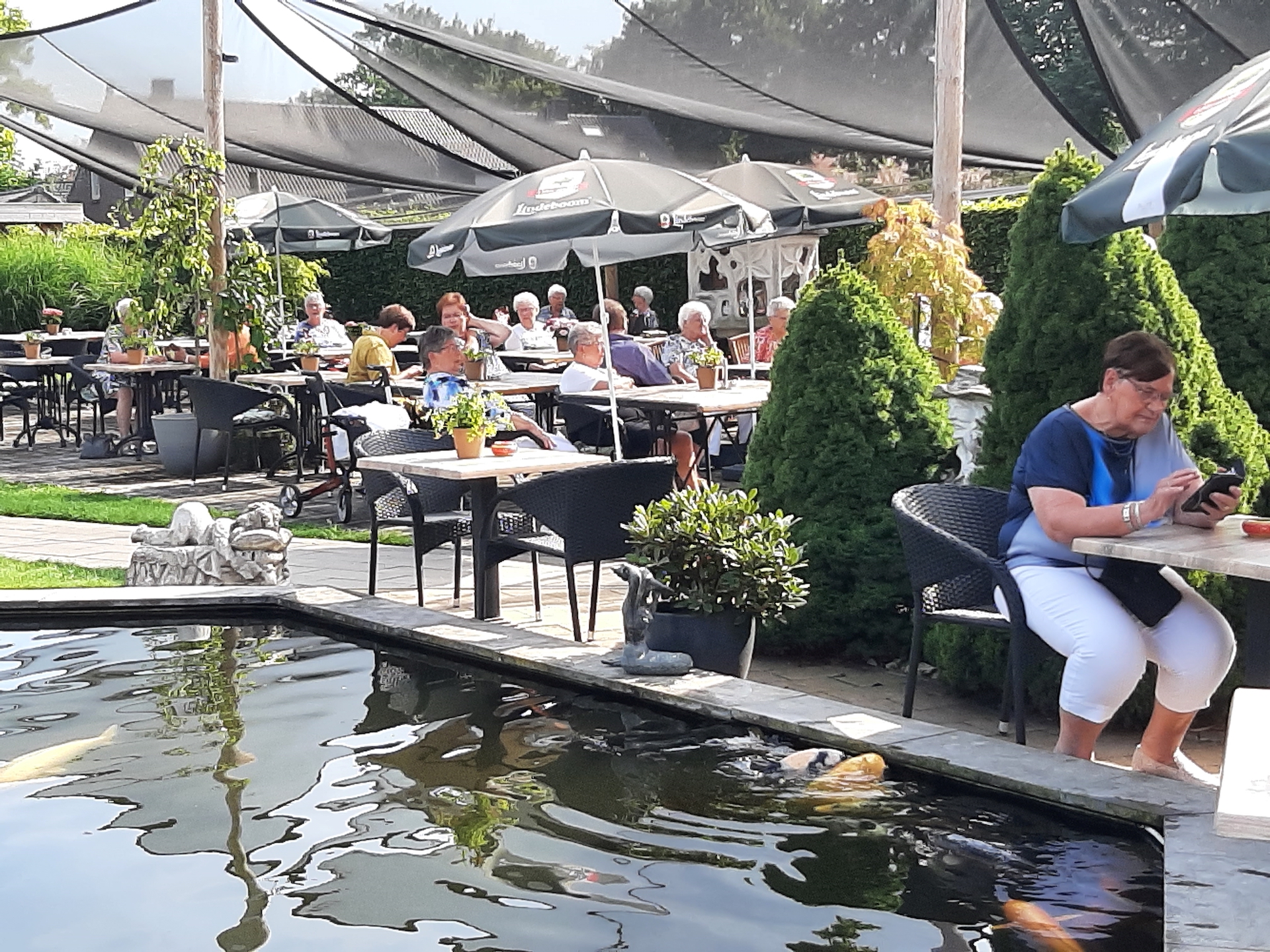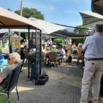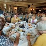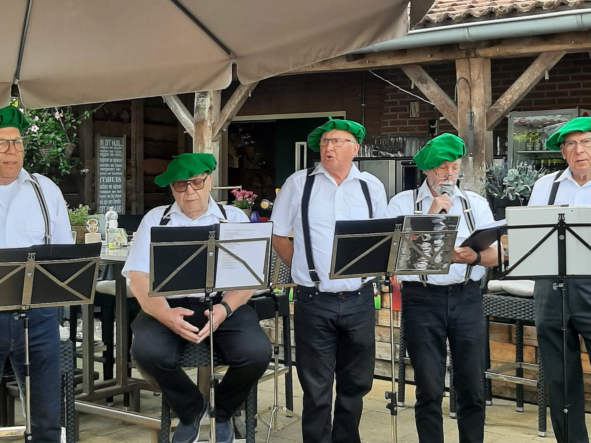 Na de laatste activiteit in juli jl. was de lunch voor vele aanwezigen vooral weer een mooie gelegenheid om te babbelen en bij te kletsen, maar ook om te genieten van een prima verzorgde lunch. Na deze lunch begaf het gezelschap zich naar het terras en de prachtige tuin bij de locatie, in afwachting van het muzikale gedeelte in het programma. Ditmaal was de kleurrijke dialectgroep Limburgse Jongens uitgenodigd om een optreden te verzorgen. Ondanks dat de groep niet geheel compleet was brachten zij mooie liederen van o.a. Benny Nijman, Thei en Marij en Sjef Diederen over het limburgse leven ten gehore. Maar ook “eigen teksten” ontbraken niet in hun repertoire. Leuke verrassing was, dat de bandleider bij het laatste nummer: Un Böske bloome, een van de aanwezige verblijde met een mooi boeketje verse bloemen. De groep bracht een feestelijke sfeer op deze dag.