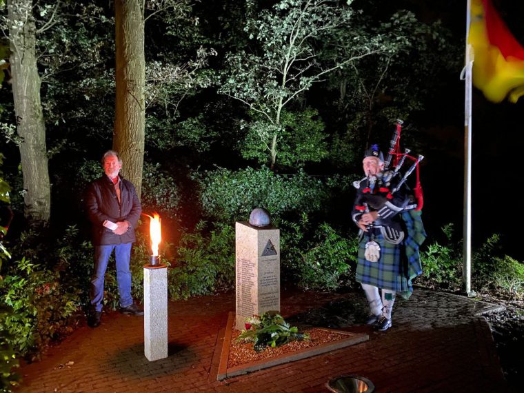 Om 21.15 uur arriveerden de Grenslaupers bij het monument langs de boerderij van de familie Hendrix waar Niek Hendrix namens de familie Hendrix de aanwezigen toesprak. Doedelzakspelers van Pipers society castle d’aldenghoor speelden ter ere van de 54 gevallenen. Speciale gast was dit jaar Doug Lear (74) uit Ohio met zijn familie. Zijn vader was Arlo Lear die als medic in Ospel zijn zware werk deed in oktober 1944. Een andere speciale gast was Drina van Rijt – Kessels (91) uit Ospel die Arlo Lear nog kort gekend heeft toen Lear met zijn eenheid ingekwartierd zat aan de Schepengraaf.