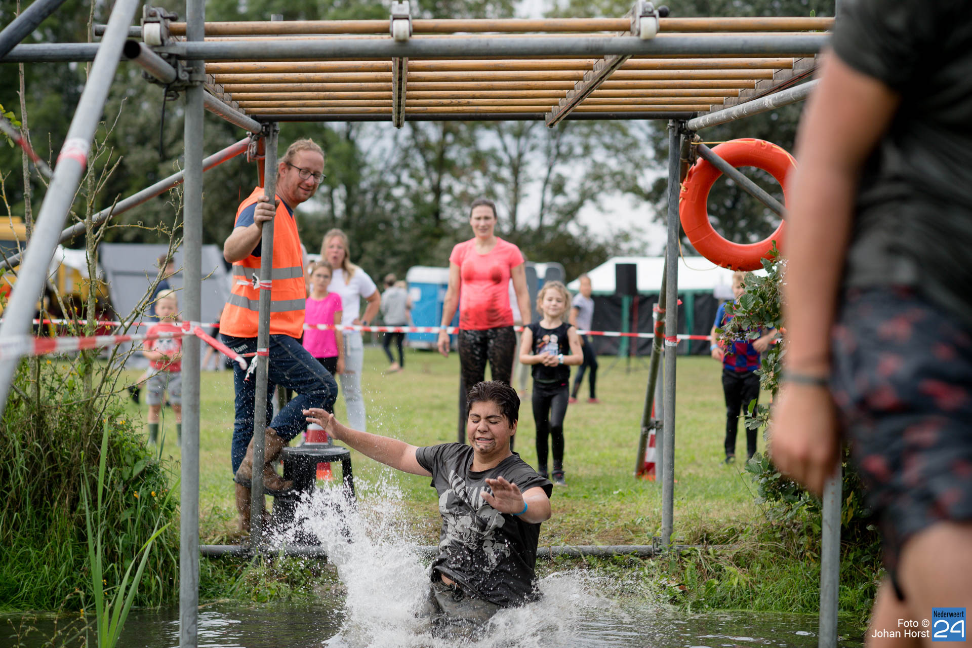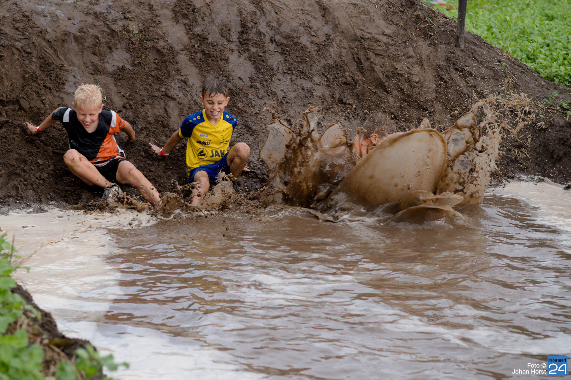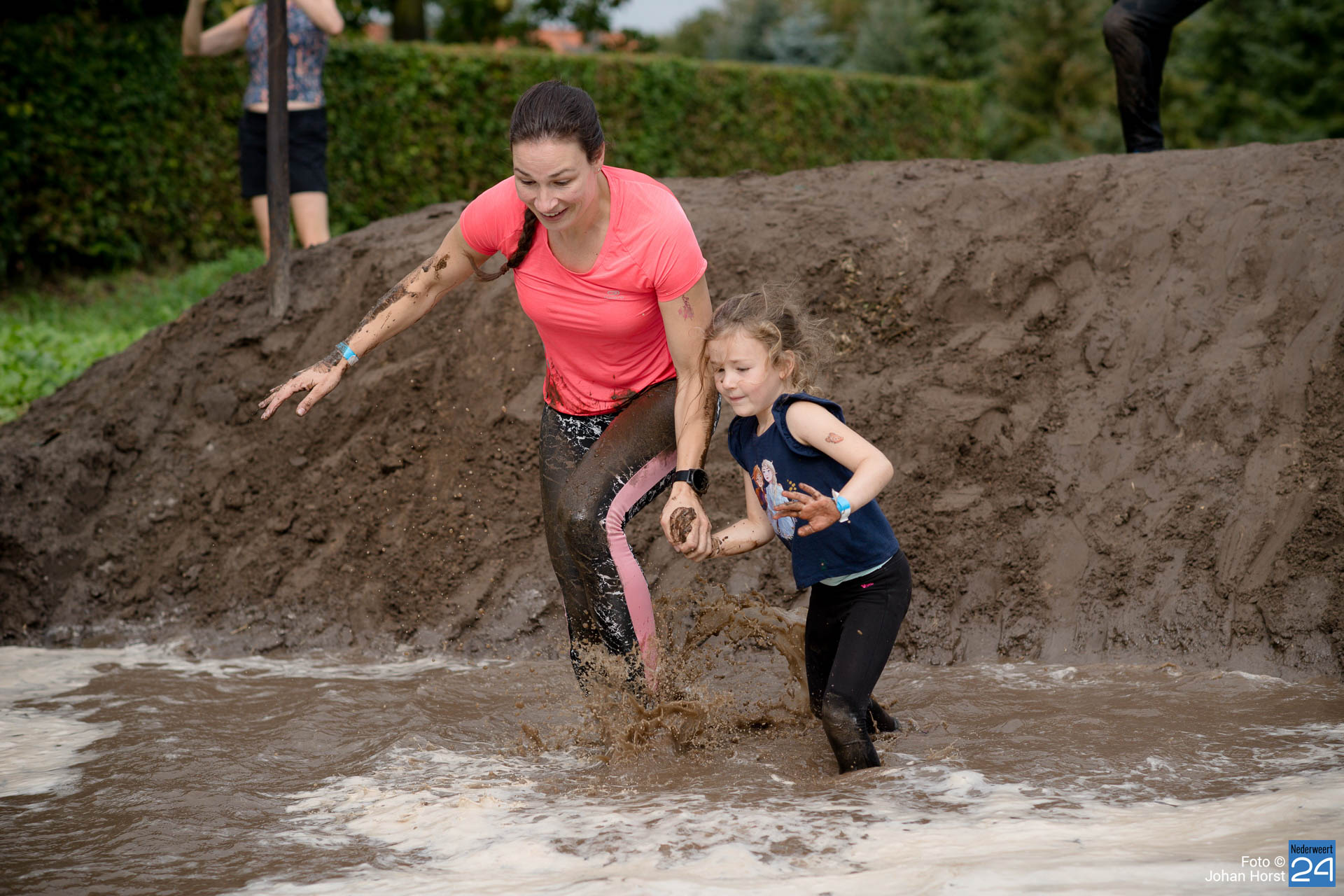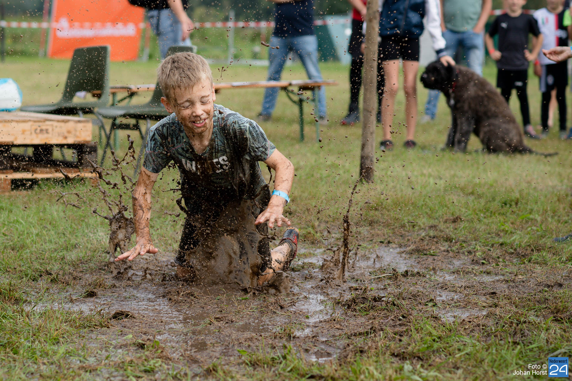 Ontkomen aan de modder was er niet aan, zeker niet na al die regen die was gevallen zaterdagnacht. Maar dat was ook juist het leuke eraan. Lekker sportief bezig zijn en je door het parcours heen ploeteren, individueel, samen met je ouder, of als vrienden onder elkaar. Vooraf aan deze tocht natuurlijk een gezamenlijke warming-up op de muziek van de Snollebollekes onder leiding van instructeur Stefan. En daarna snel door naar de start van het parcours. Natuurlijk altijd even wennen aan het water en de modder, maar eenmaal vies was het ervoor gaan! Maar liefst 300 deelnemers hadden zich opgegeven. Plezier en sportief bezig zijn in de buitenlucht dat was de uitdaging, maar er werden ook geweldige prestaties neergezet ondanks dat het toch heel vermoeiend was. Waar sommige deelnemers het parcours 1x doorliepen, waren er andere deelnemers die doorgingen en het parcours meerdere keren doorliepen. Een aantal echte doorzetters hebben het parcours 8 x en zelfs 11 x volbracht, wat een super prestatie!