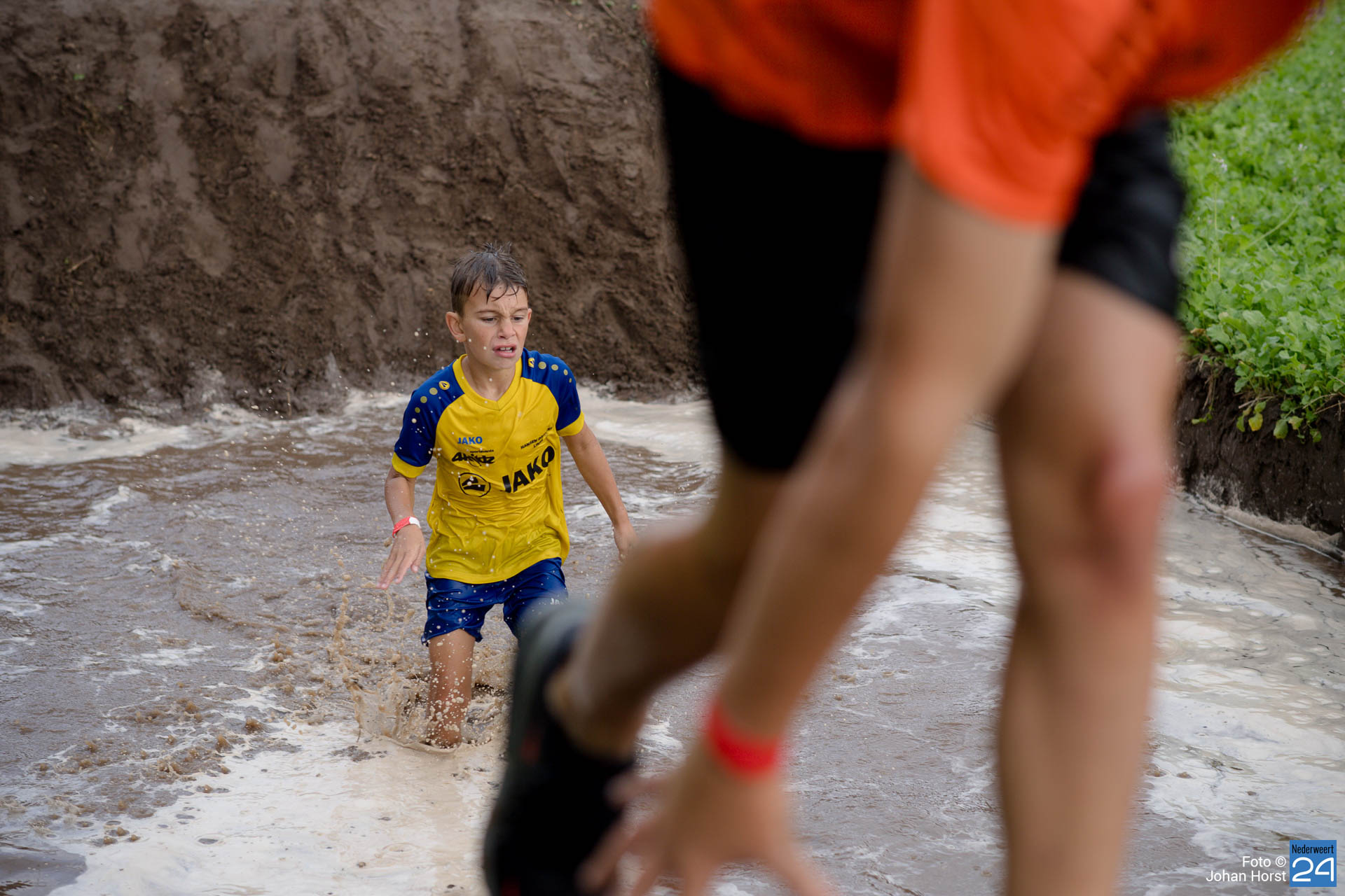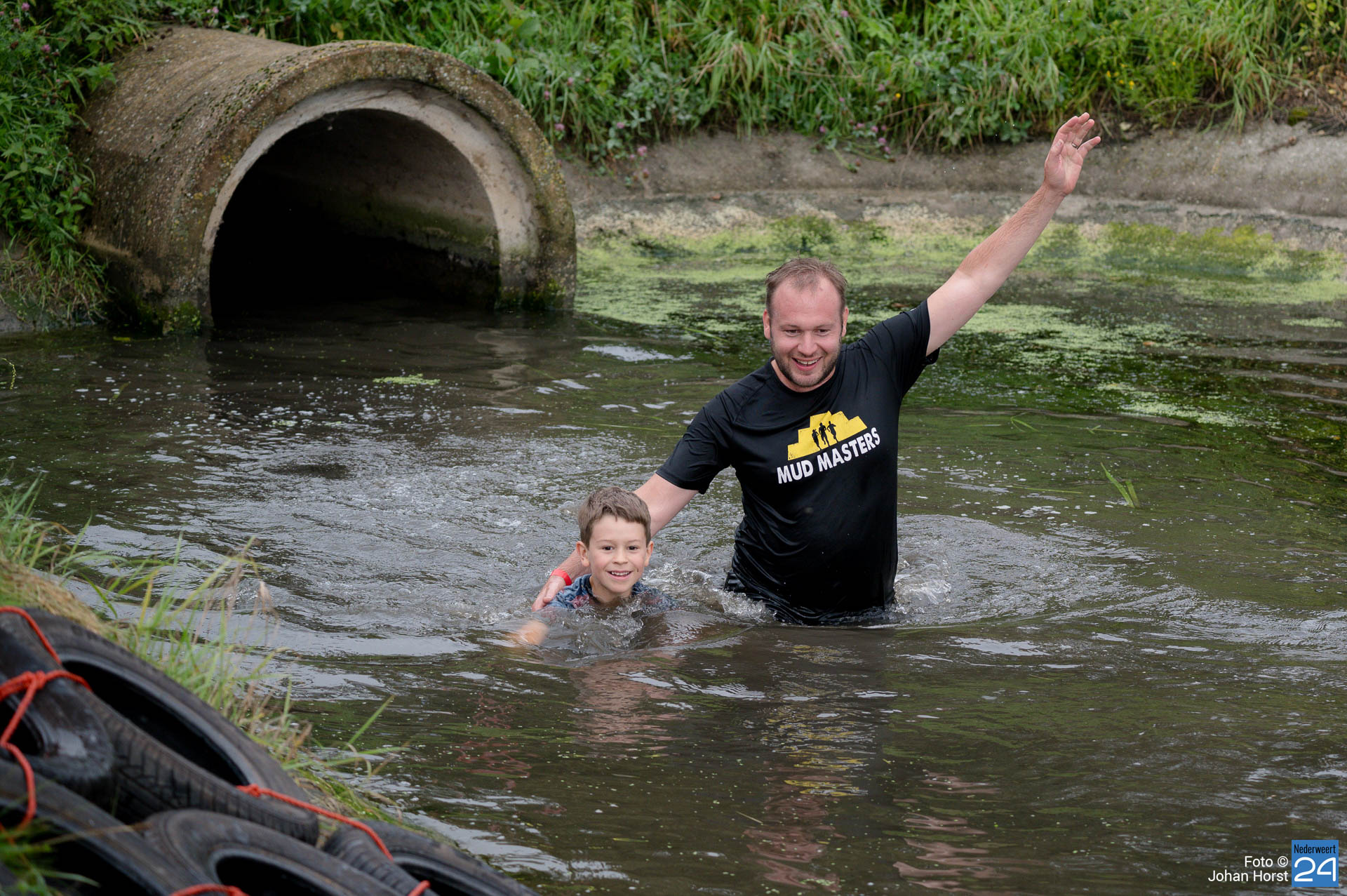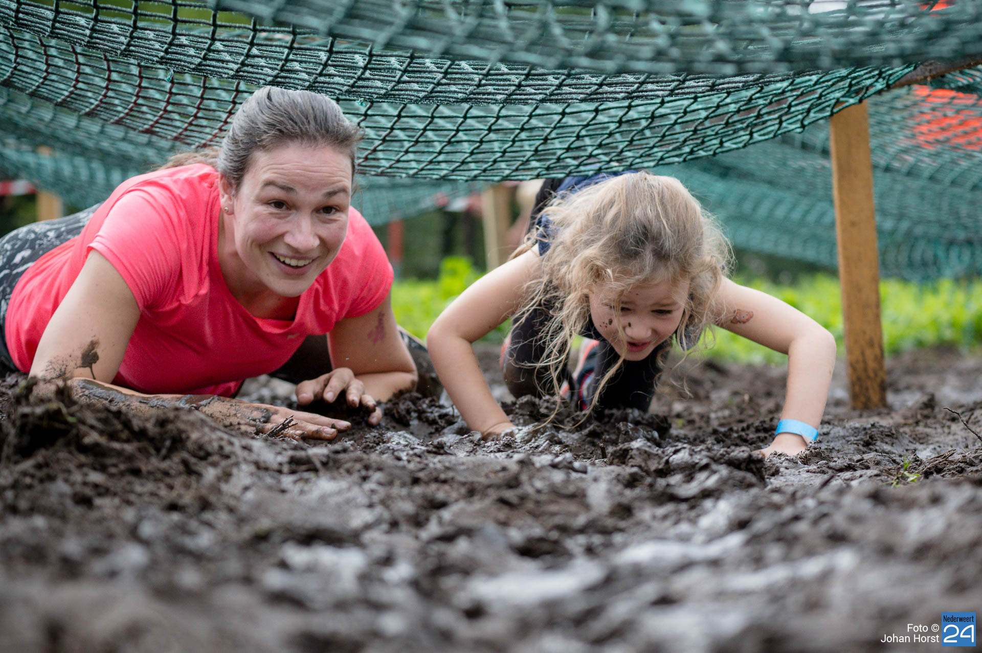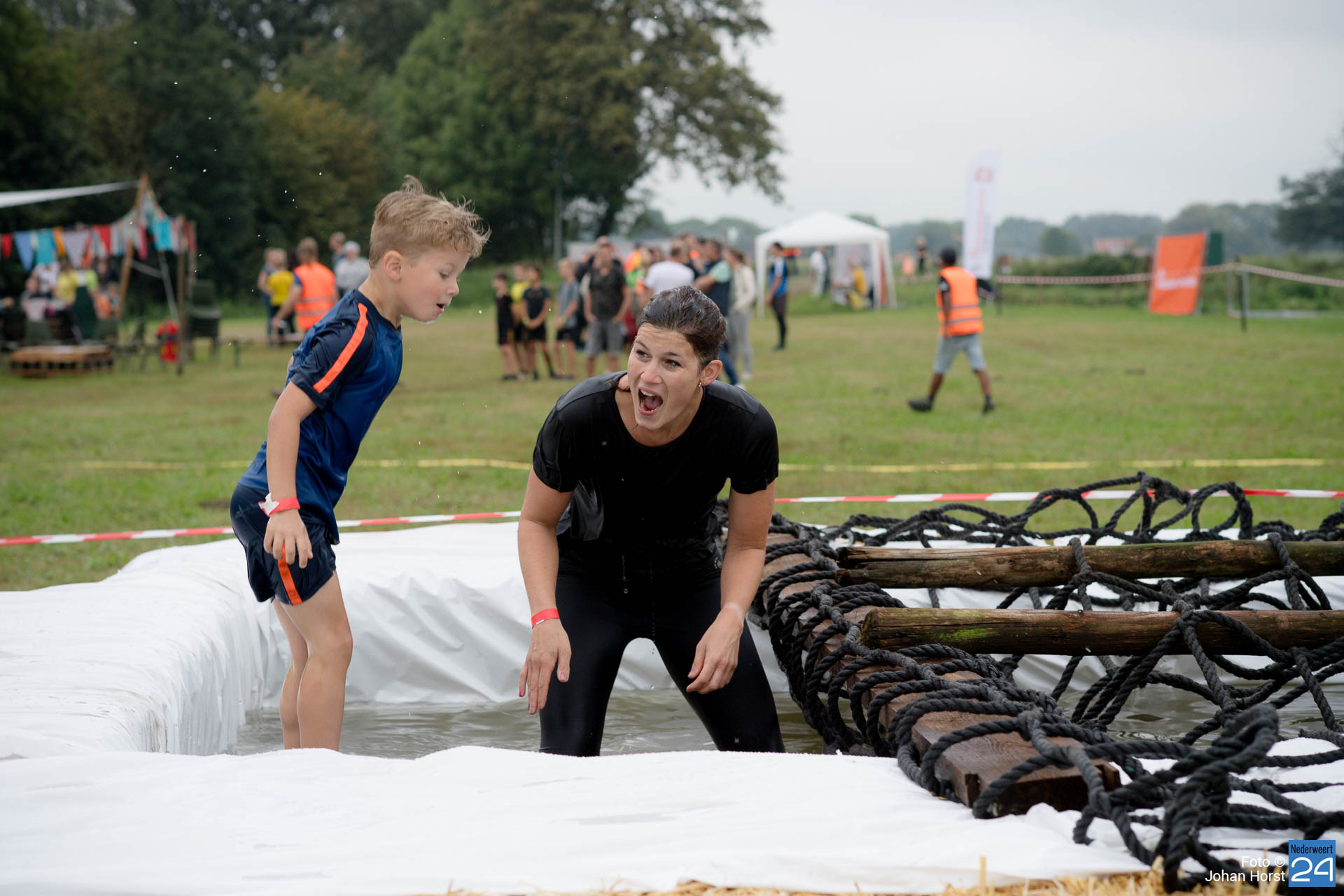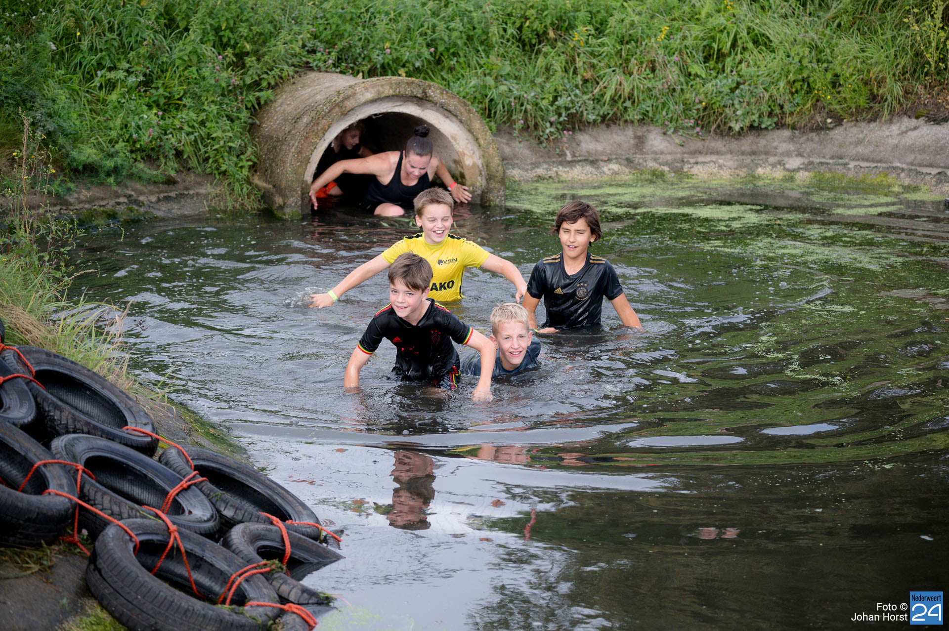 Ontkomen aan de modder was er niet aan, zeker niet na al die regen die was gevallen zaterdagnacht. Maar dat was ook juist het leuke eraan. Lekker sportief bezig zijn en je door het parcours heen ploeteren, individueel, samen met je ouder, of als vrienden onder elkaar. Vooraf aan deze tocht natuurlijk een gezamenlijke warming-up op de muziek van de Snollebollekes onder leiding van instructeur Stefan. En daarna snel door naar de start van het parcours. Natuurlijk altijd even wennen aan het water en de modder, maar eenmaal vies was het ervoor gaan! Maar liefst 300 deelnemers hadden zich opgegeven. Plezier en sportief bezig zijn in de buitenlucht dat was de uitdaging, maar er werden ook geweldige prestaties neergezet ondanks dat het toch heel vermoeiend was. Waar sommige deelnemers het parcours 1x doorliepen, waren er andere deelnemers die doorgingen en het parcours meerdere keren doorliepen. Een aantal echte doorzetters hebben het parcours 8 x en zelfs 11 x volbracht, wat een super prestatie!