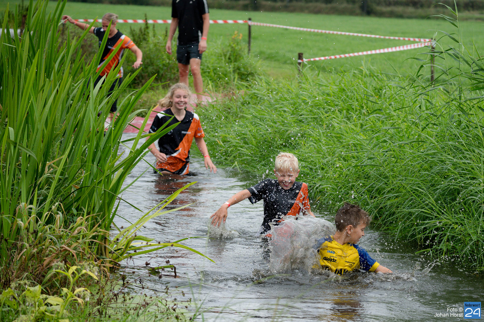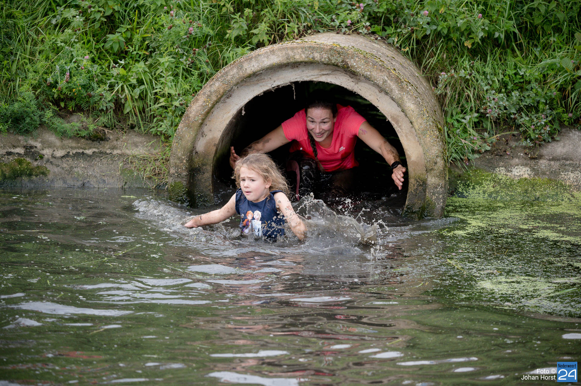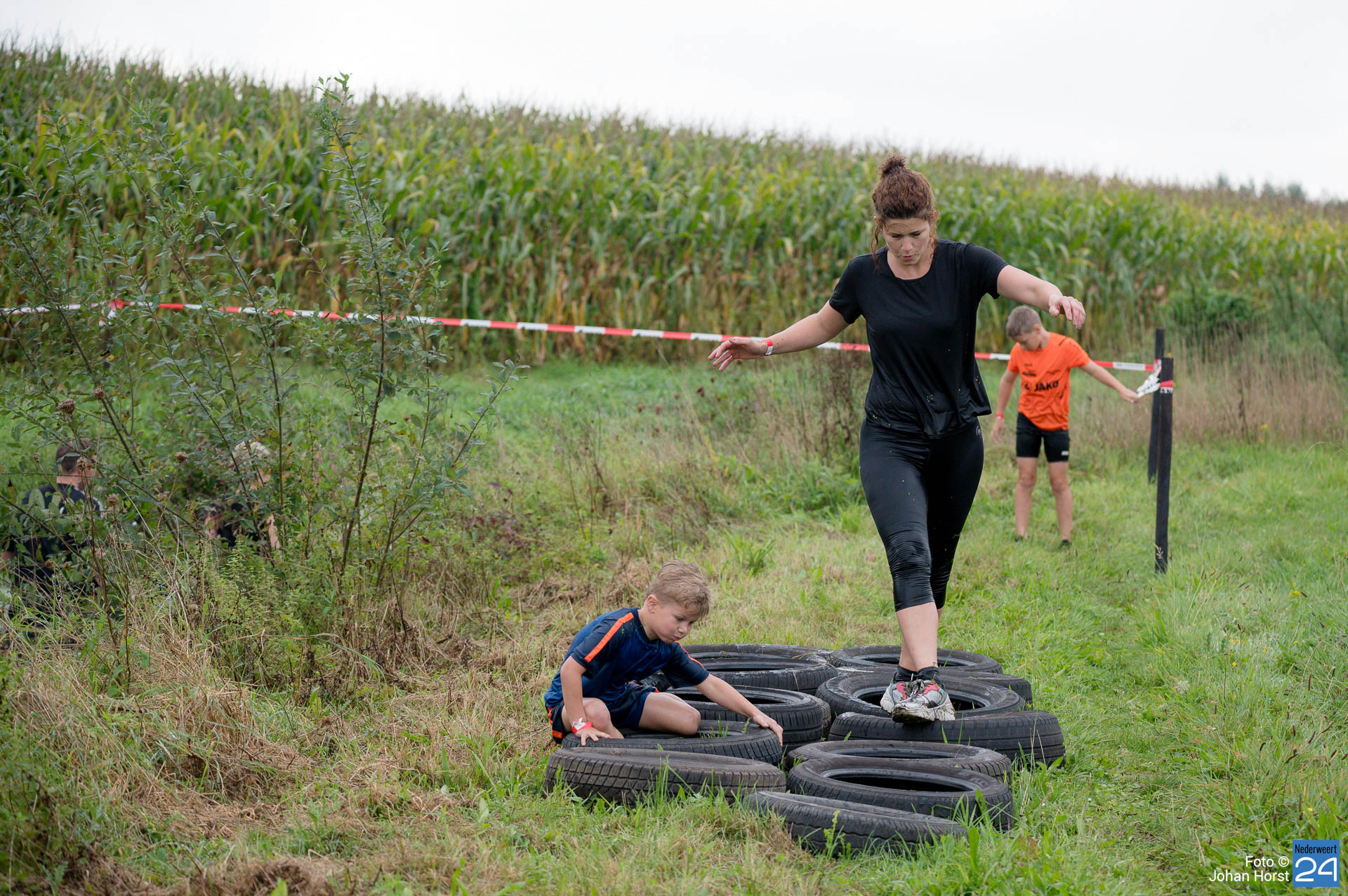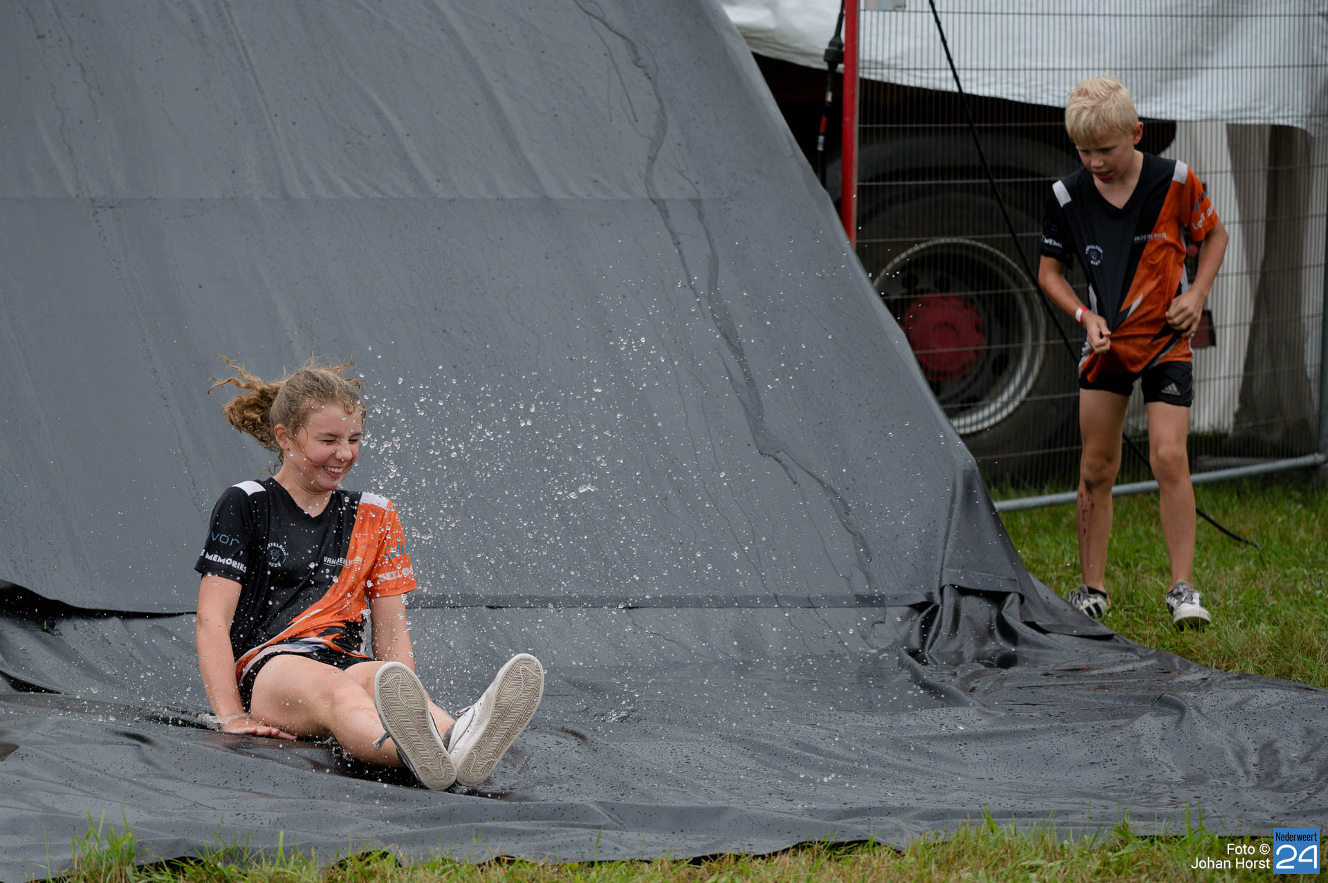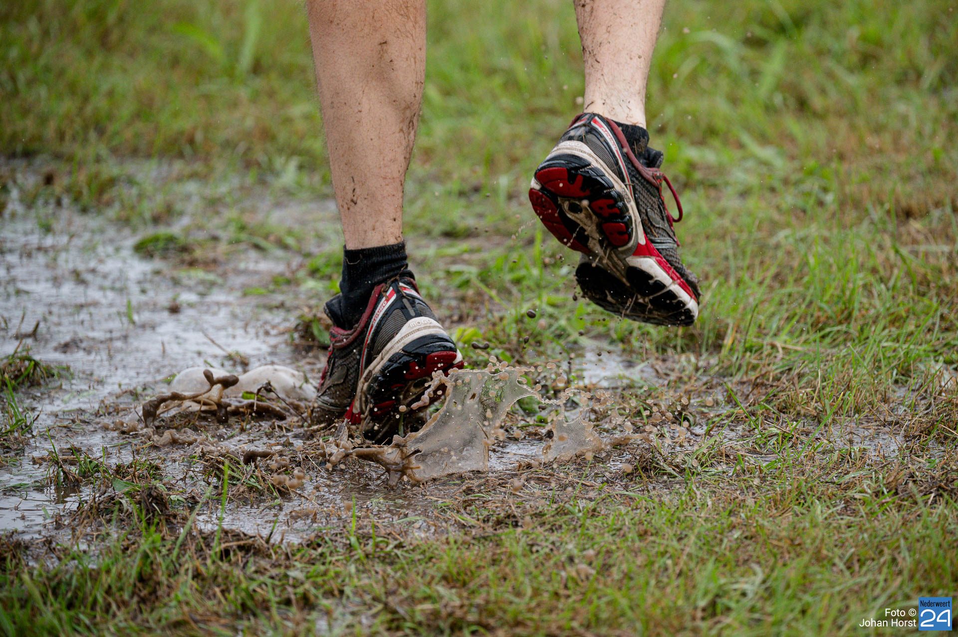 Ontkomen aan de modder was er niet aan, zeker niet na al die regen die was gevallen zaterdagnacht. Maar dat was ook juist het leuke eraan. Lekker sportief bezig zijn en je door het parcours heen ploeteren, individueel, samen met je ouder, of als vrienden onder elkaar. Vooraf aan deze tocht natuurlijk een gezamenlijke warming-up op de muziek van de Snollebollekes onder leiding van instructeur Stefan. En daarna snel door naar de start van het parcours. Natuurlijk altijd even wennen aan het water en de modder, maar eenmaal vies was het ervoor gaan! Maar liefst 300 deelnemers hadden zich opgegeven. Plezier en sportief bezig zijn in de buitenlucht dat was de uitdaging, maar er werden ook geweldige prestaties neergezet ondanks dat het toch heel vermoeiend was. Waar sommige deelnemers het parcours 1x doorliepen, waren er andere deelnemers die doorgingen en het parcours meerdere keren doorliepen. Een aantal echte doorzetters hebben het parcours 8 x en zelfs 11 x volbracht, wat een super prestatie!