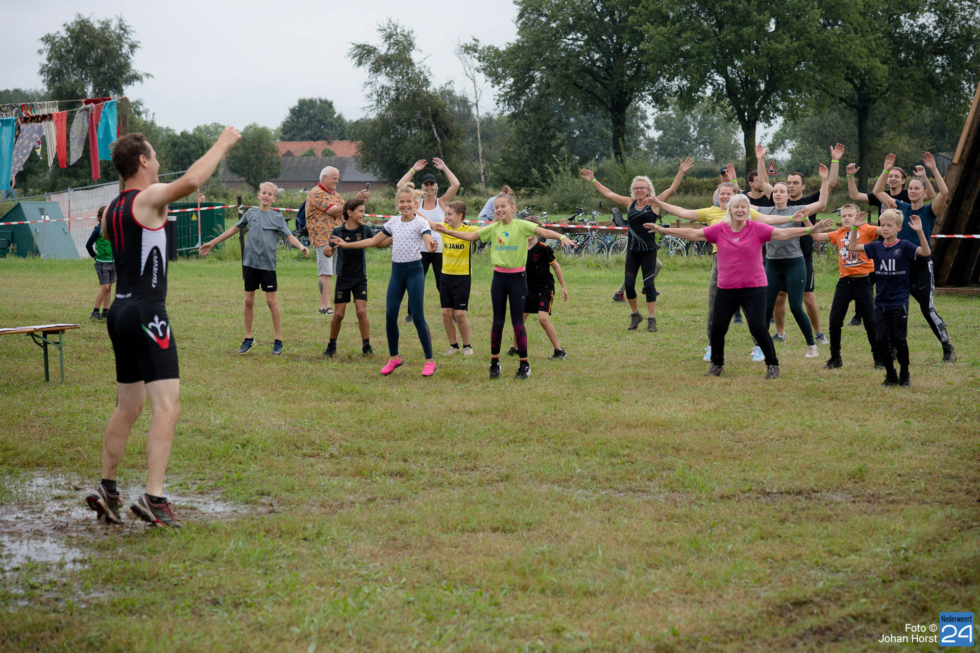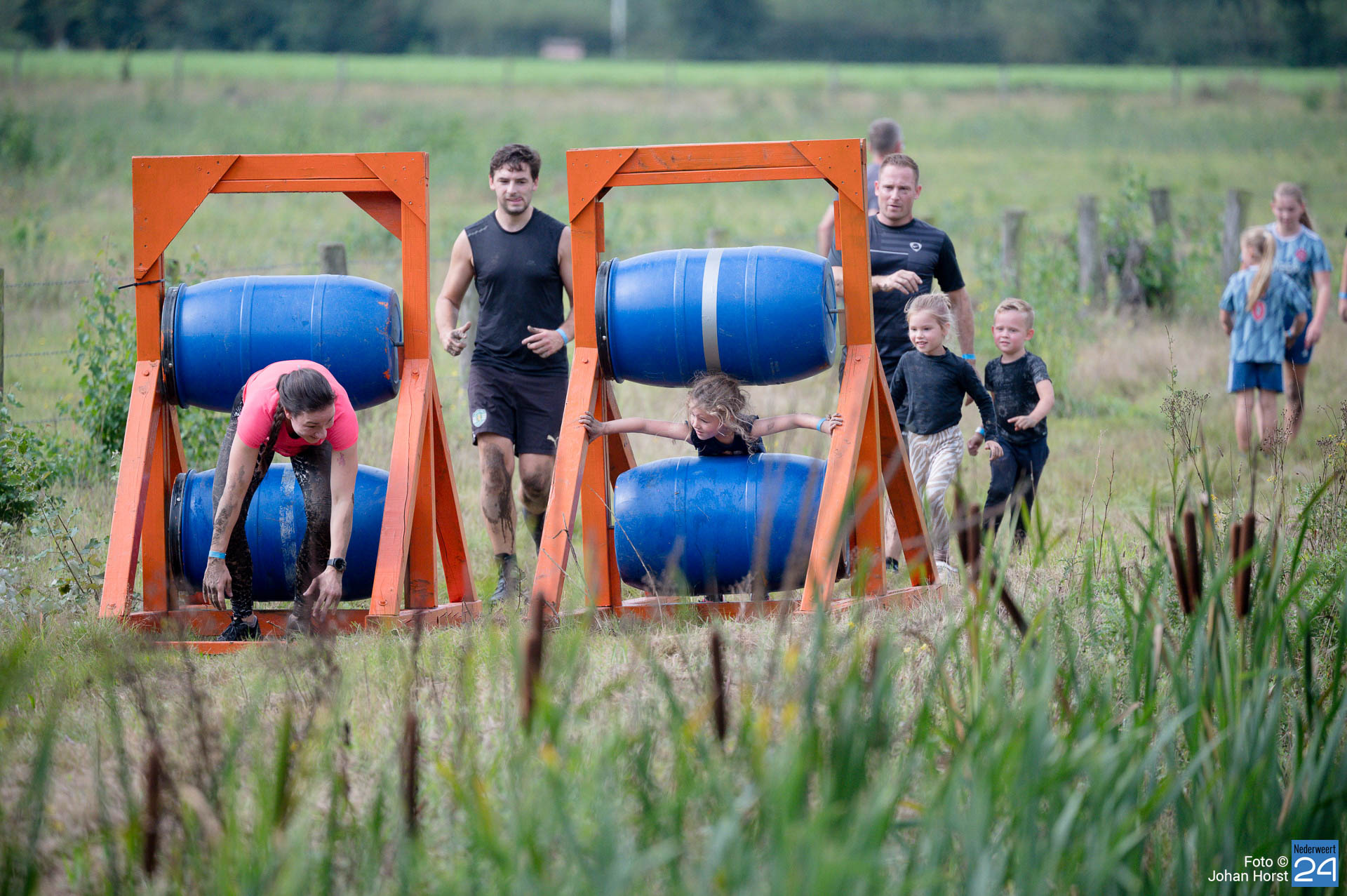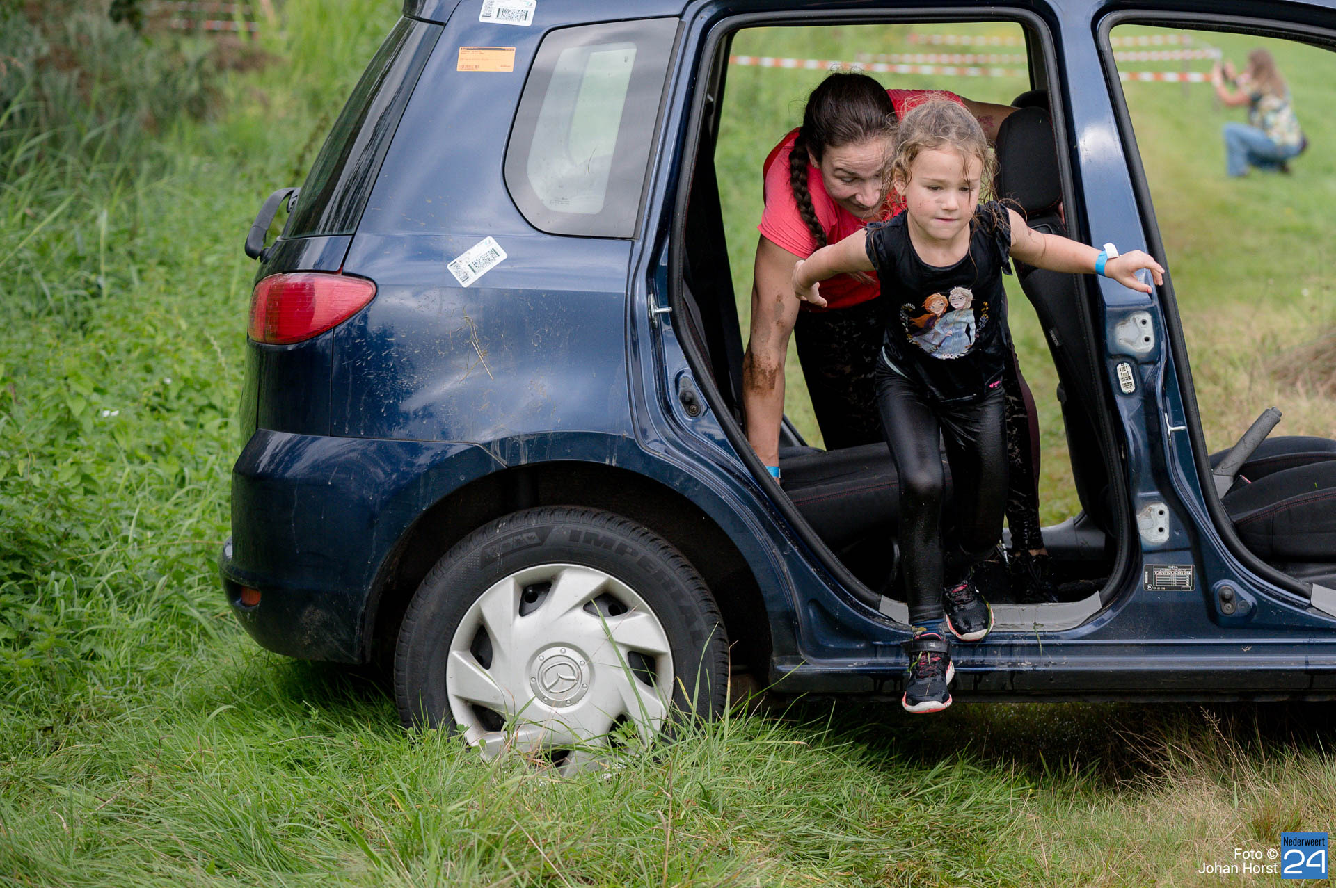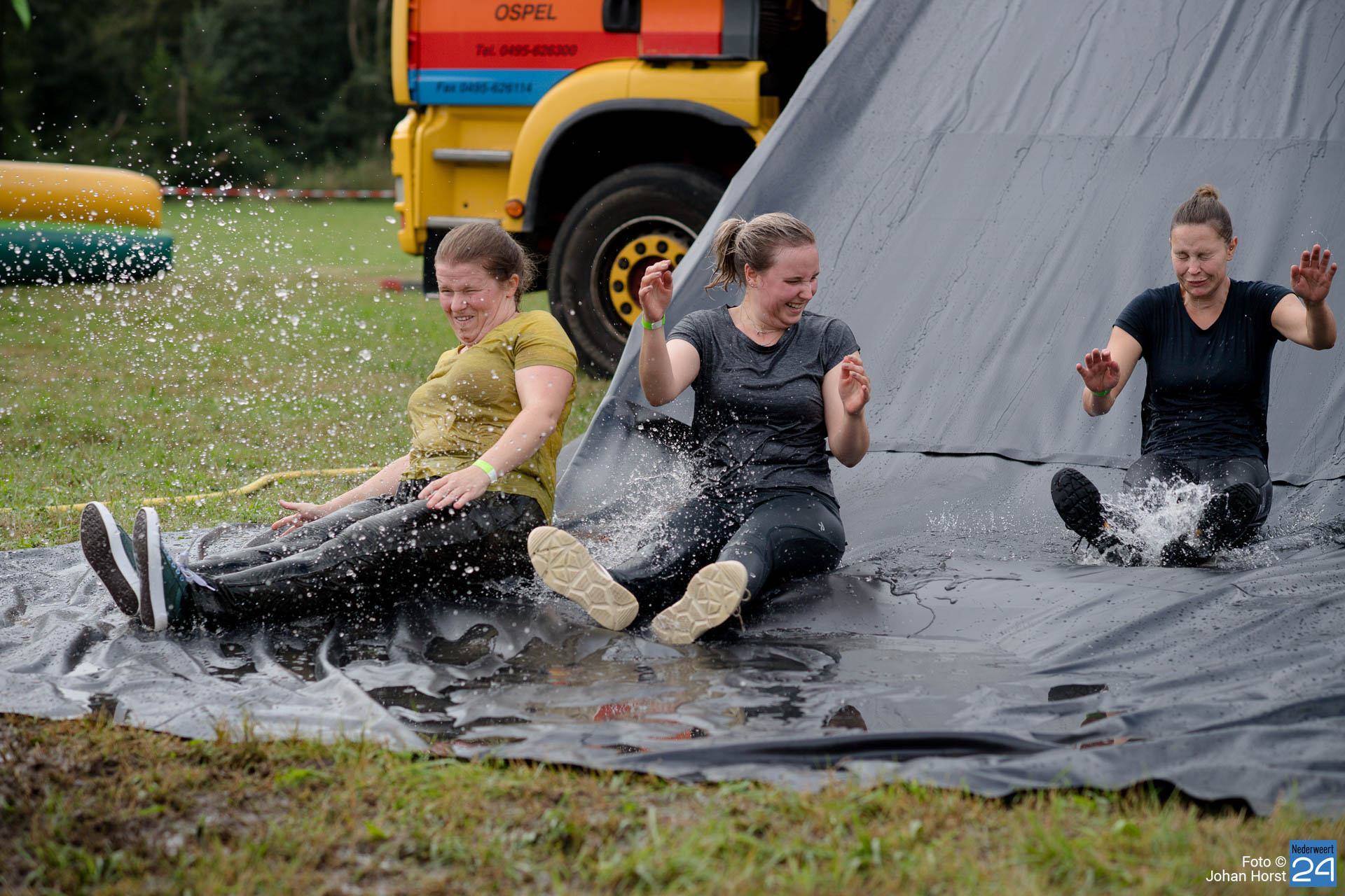 Ontkomen aan de modder was er niet aan, zeker niet na al die regen die was gevallen zaterdagnacht. Maar dat was ook juist het leuke eraan. Lekker sportief bezig zijn en je door het parcours heen ploeteren, individueel, samen met je ouder, of als vrienden onder elkaar. Vooraf aan deze tocht natuurlijk een gezamenlijke warming-up op de muziek van de Snollebollekes onder leiding van instructeur Stefan. En daarna snel door naar de start van het parcours. Natuurlijk altijd even wennen aan het water en de modder, maar eenmaal vies was het ervoor gaan! Maar liefst 300 deelnemers hadden zich opgegeven. Plezier en sportief bezig zijn in de buitenlucht dat was de uitdaging, maar er werden ook geweldige prestaties neergezet ondanks dat het toch heel vermoeiend was. Waar sommige deelnemers het parcours 1x doorliepen, waren er andere deelnemers die doorgingen en het parcours meerdere keren doorliepen. Een aantal echte doorzetters hebben het parcours 8 x en zelfs 11 x volbracht, wat een super prestatie!
